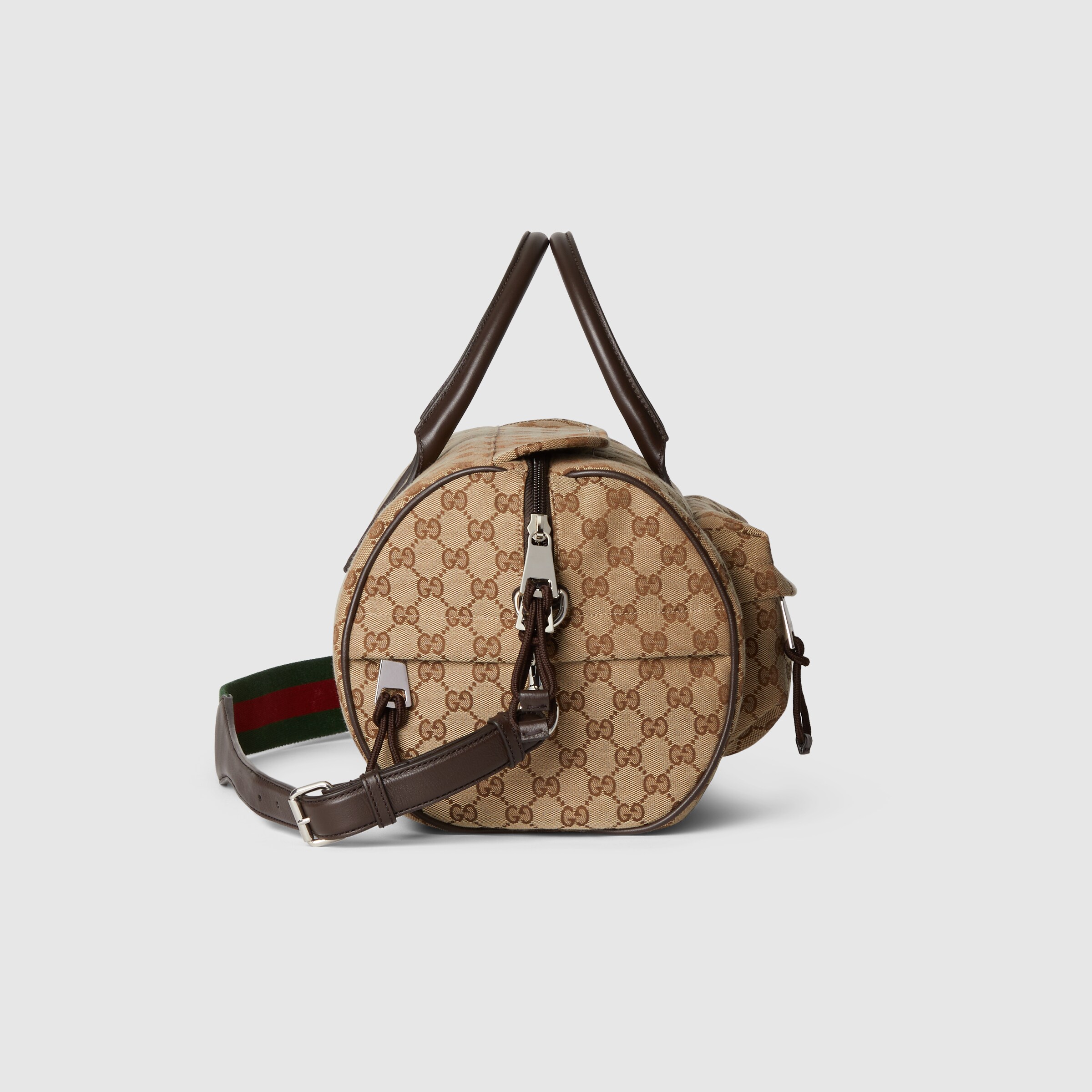 В мужской осенне-зимней коллекции представлены фирменные дорожные сумки в спортивном стиле. Сумка выполнена из канвы GG, а ее классические аксессуары и цветовая палитра передают современное настроение благодаря таким изящным деталям, как веб-дизайн и тисненый логотип Gucci. Эта дорожная сумка из бежево-черной канвы имеет несколько карманов, верхнюю ручку и D-образное кольцо.