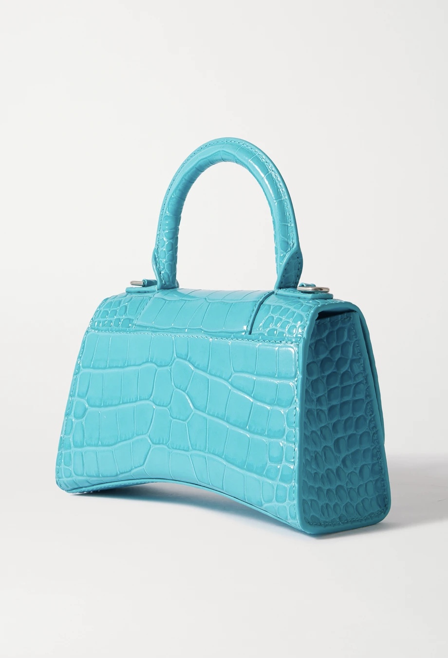 Демна Гвасалия включил в весенне-летнюю коллекцию 2021 года голубую сумку Hourglass, фигурная форма которой напоминает знаковый пиджак с силуэтом «песочные часы». Для пошива модели со съемным плечевым ремнем использовали плотную кожу с тиснением под крокодила. Откидной клапан декорировали однотонной подвеской в виде эмблемы бренда, основанного Кристобалем Баленсиагой. Внутрь поместятся телефон, паспорт и ключи.