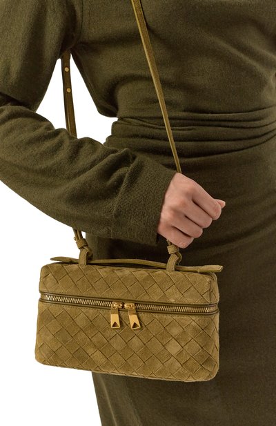 Компактная форма сумки-тоут от Bottega Veneta делает ее идеальным вариантом для вечерних мероприятий. Созданная по образцу ретро-косметички, она изготовлена из гладких полосок замши, сплетенных вместе с использованием фирменной техники intrecciato. В небольшом внутреннем отделении найдется место для визитницы, телефона и помады.