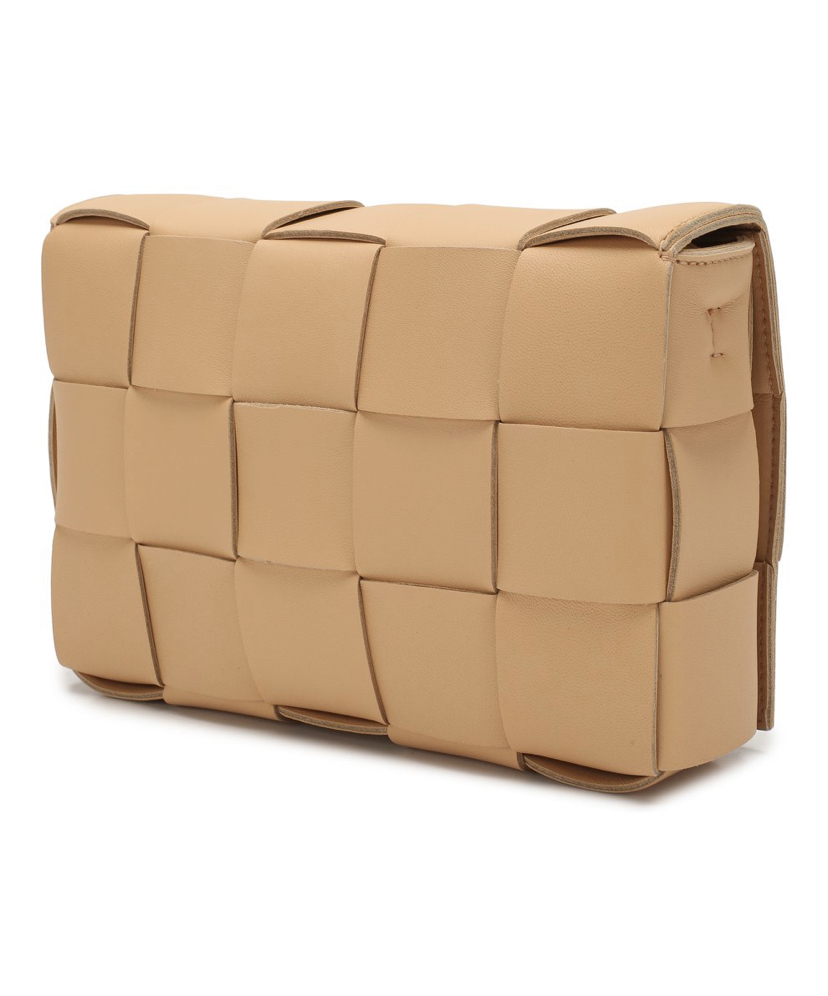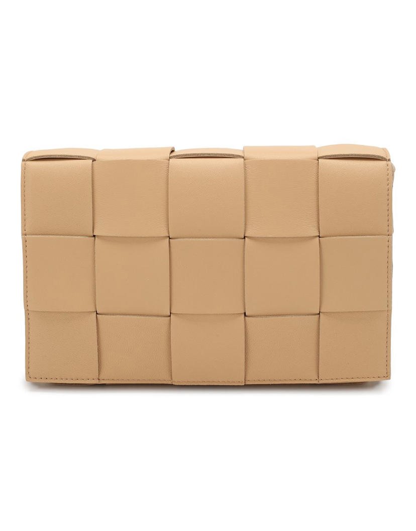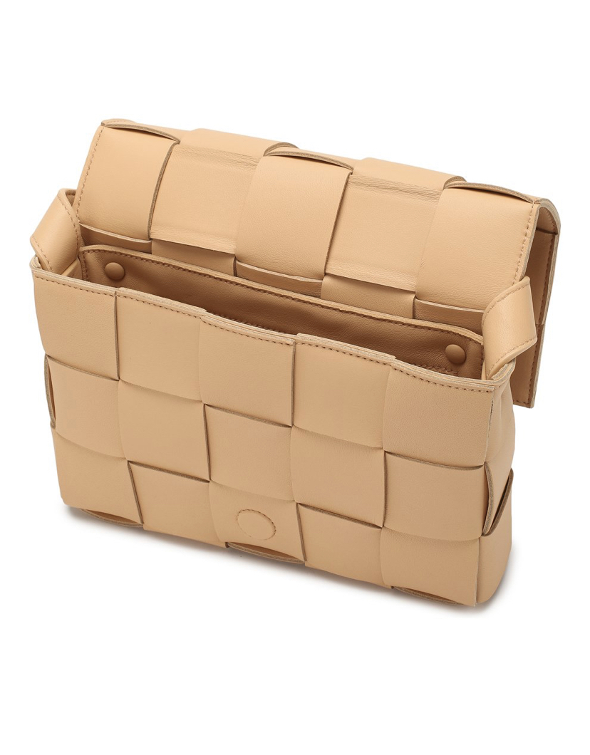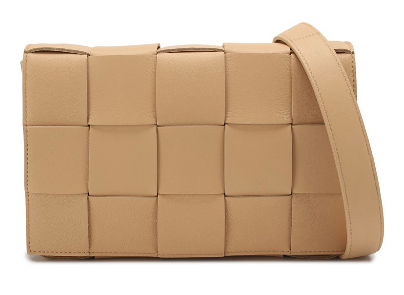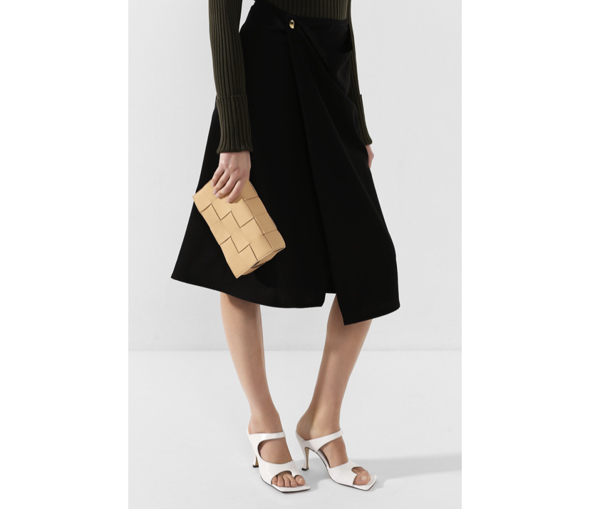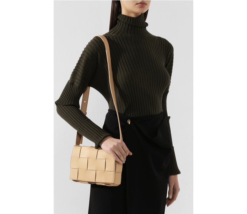 Пудровая сумка Cassette из весенне-летней коллекции 2020 года, как макияж в стиле nude, будет уместно смотреться днем, а если убрать внутрь плечевой ремень, аксессуар приобретет новый смысл и сможет заменить клатч. Для создания модели Дэниел Ли выбрал мягкую матовую кожу. Широкие полосы из этого материала переплели в знаковой технике intrecciato. В изделие поместятся смартфон, кошелек и флакон любимого аромата.