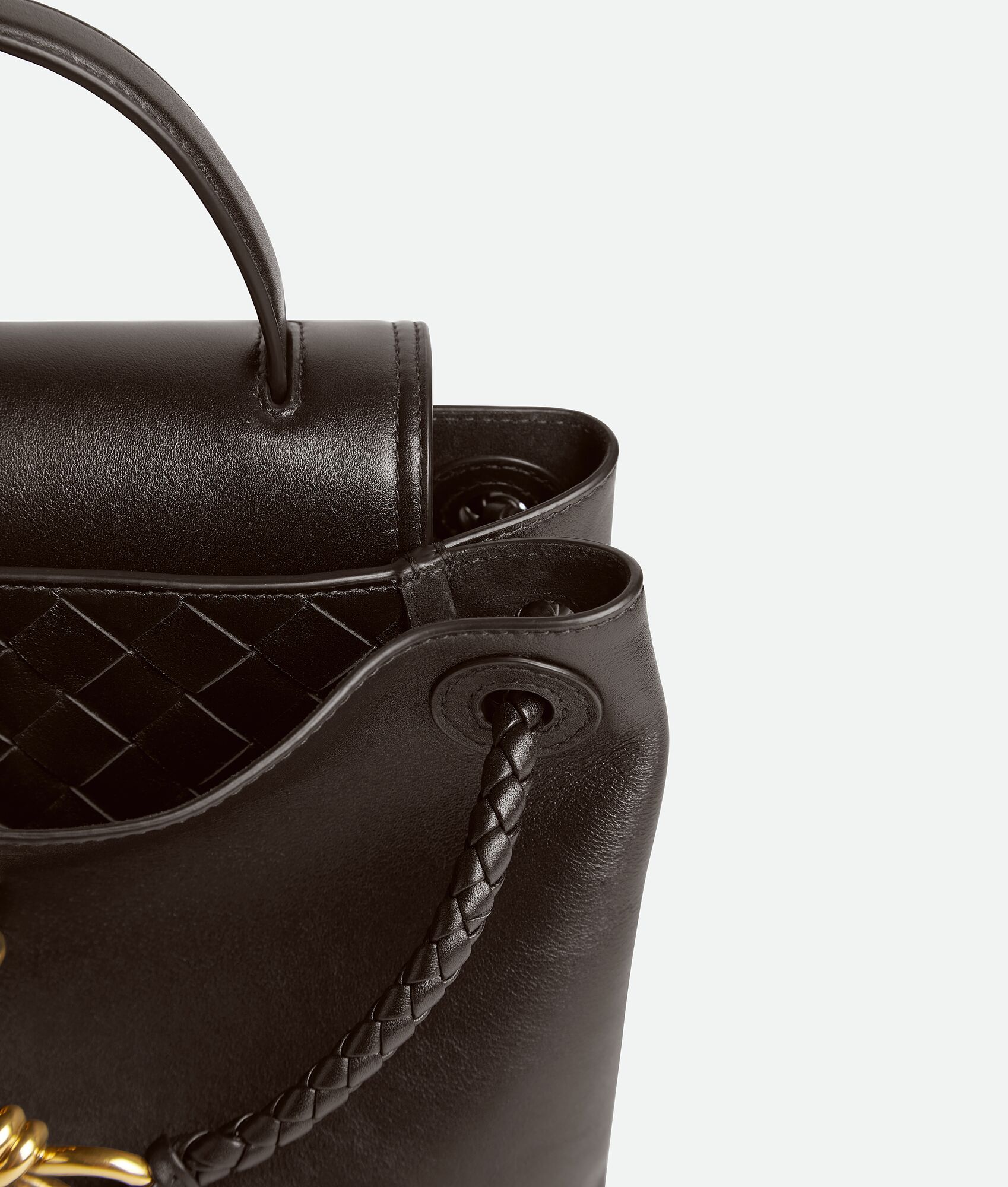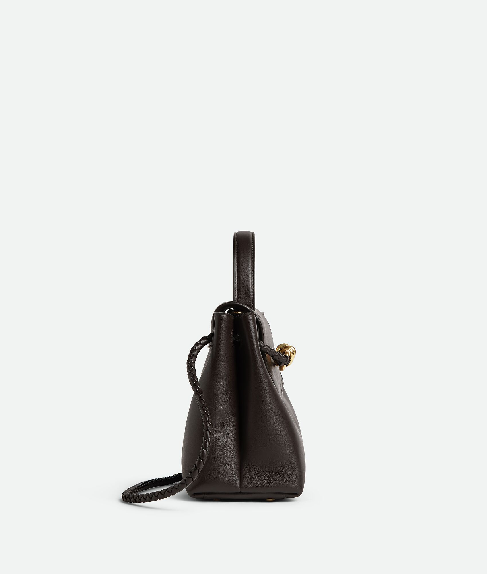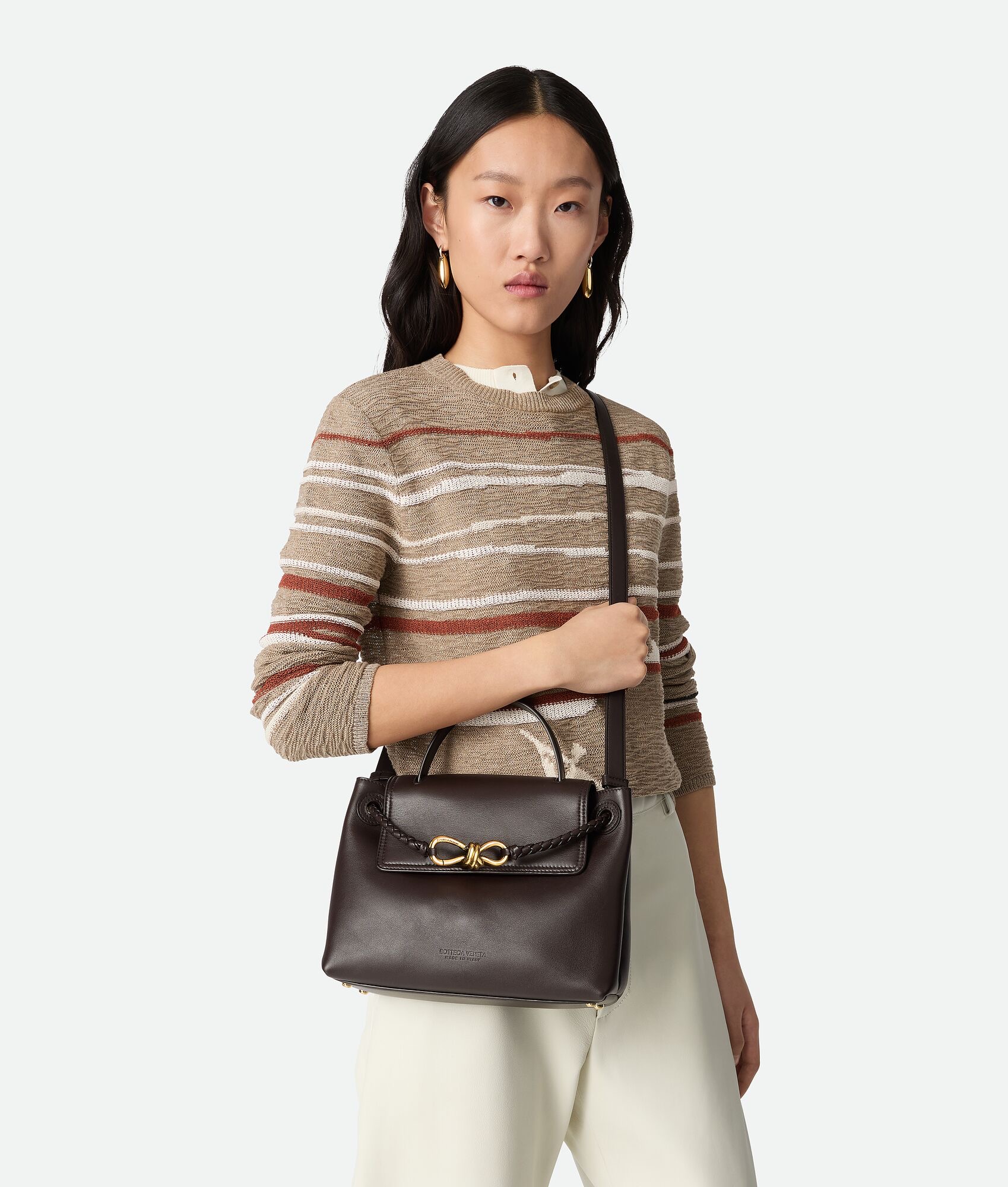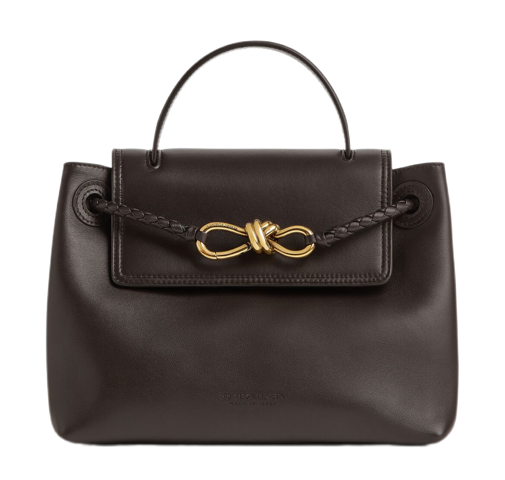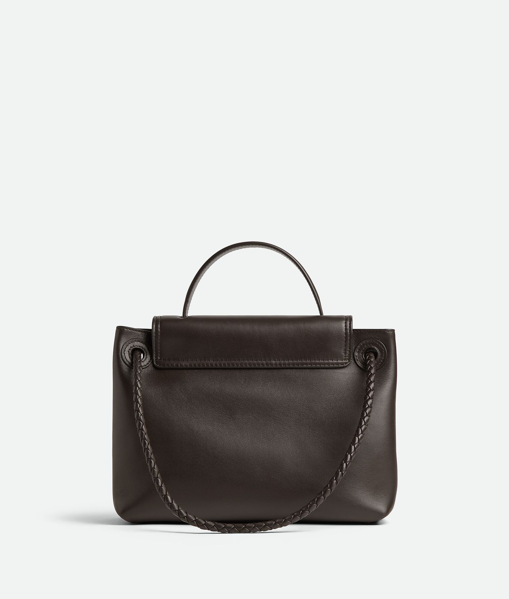 Мягкая сумка с верхней ручкой из телячьей кожи, двусторонним клапаном и фирменным узлом. Застежка-крючок позволяет закрыть клапан спереди или прикрепить его к внутреннему карману с узором Intrecciato.