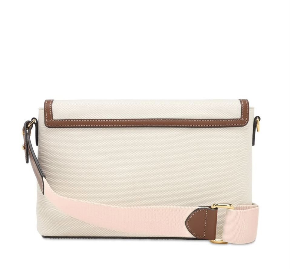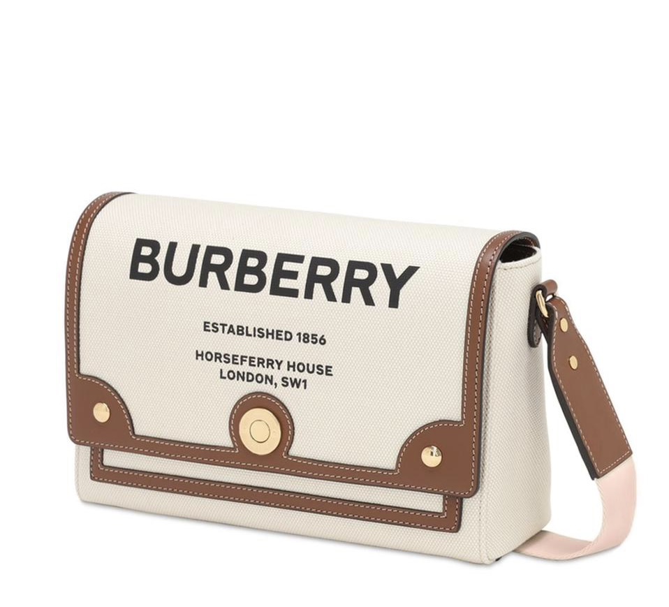 Мини-сумка из парусины бежевого цвета декорирована коричневыми кожаными вставками с контрастной отстрочкой, принтом Horseferry и золотистыми кнопками с гравированным логотипом бренда. Модель оснащена регулируемым ремнем на плечо, карманом внутри и снаружи.