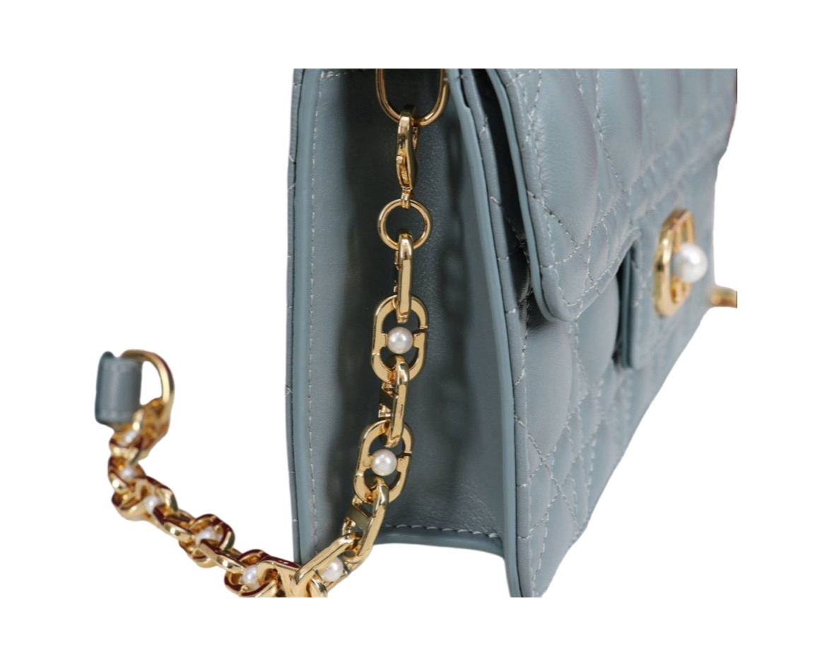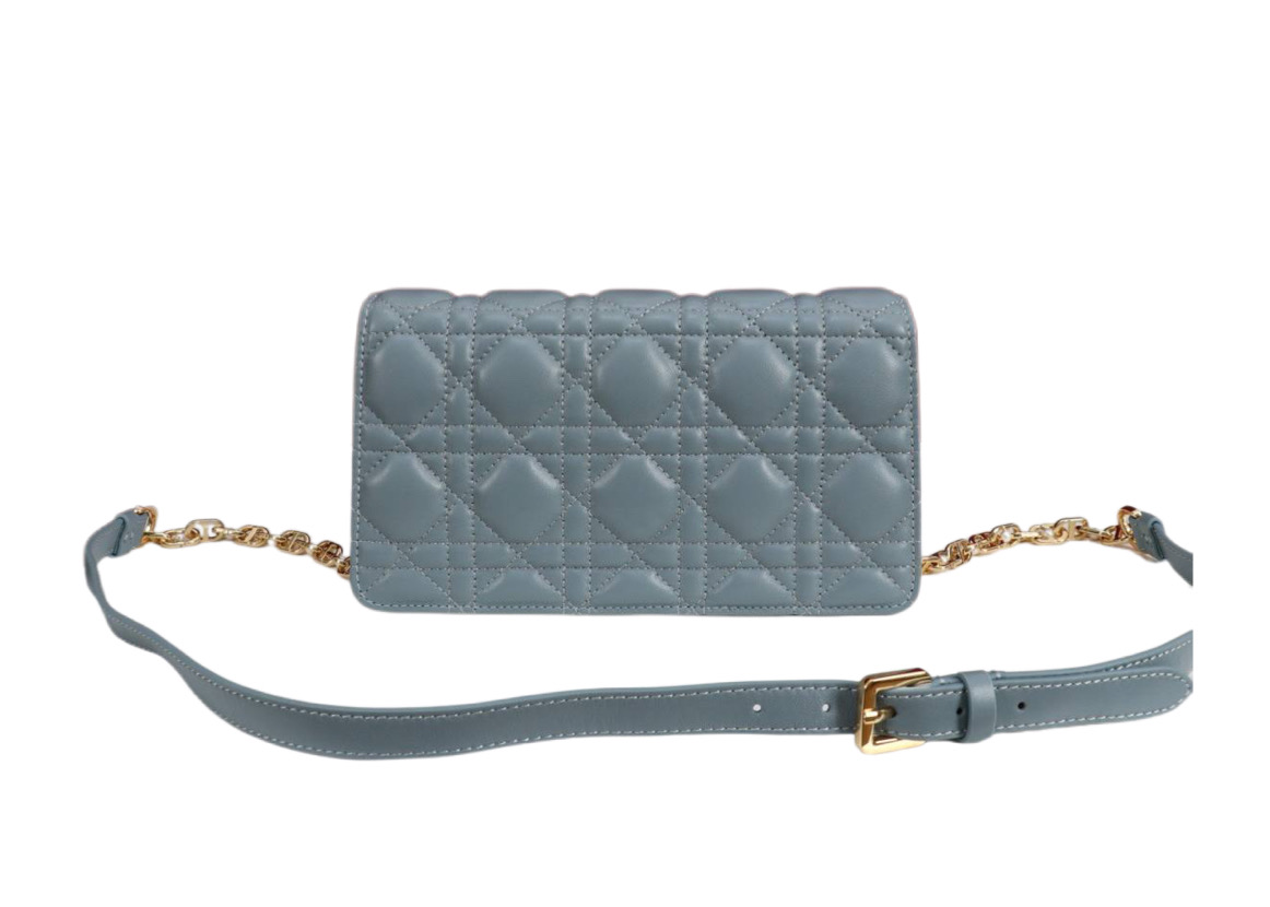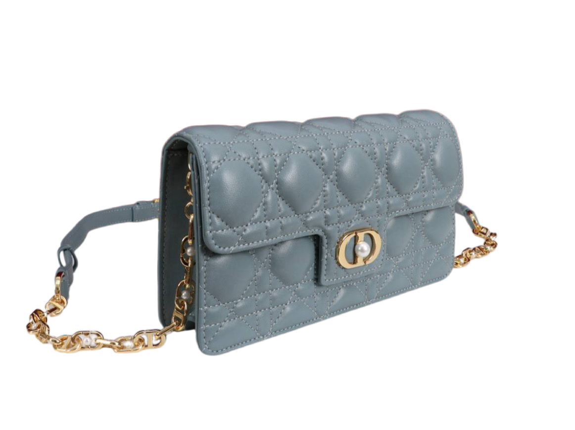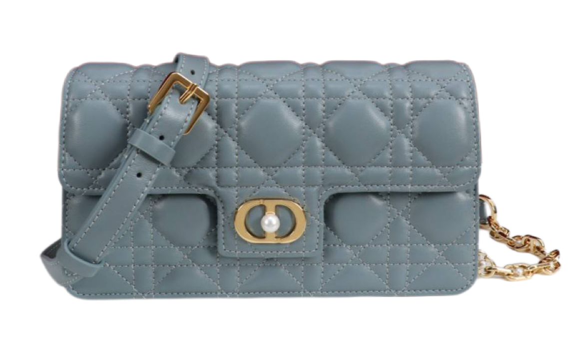 Новинка зимы 2025 года, мини-сумка Dior Jolie отличается элегантным и функциональным дизайном. Сумка выполнена из бледно-голубойкожи ягненка с вышивкой Cannage. Клапан украшен золотистой металлической надписью CD с белой жемчужиной из смолы. Клапан открывается, открывая отделение для всех необходимых мелочей. Регулируемый и съемный ремешок-цепочка для CD украшен белыми жемчужинами из смолы и дополнен кожаной вставкой, что позволяет удобно носить сумку в руке, на плече или через плечо, как днем, так и вечером.