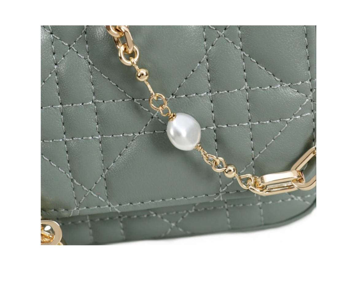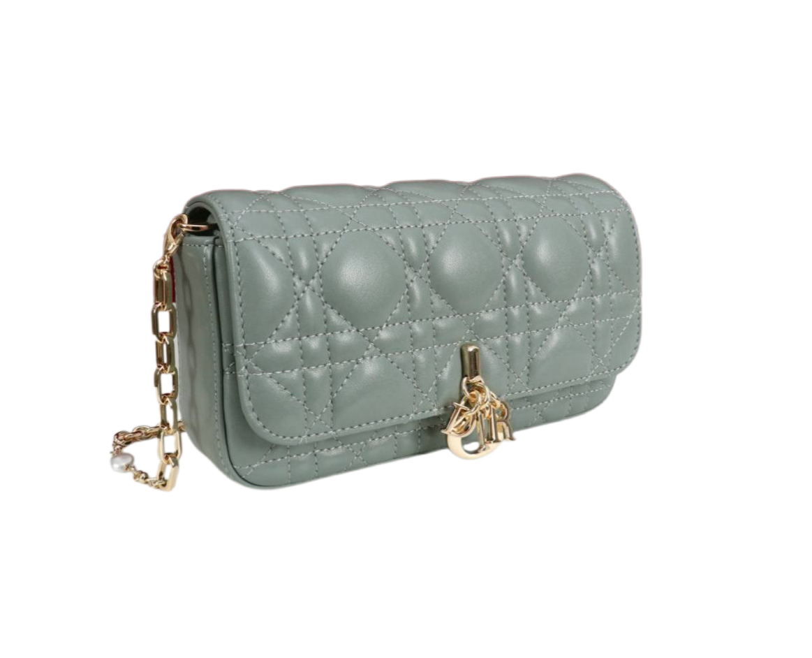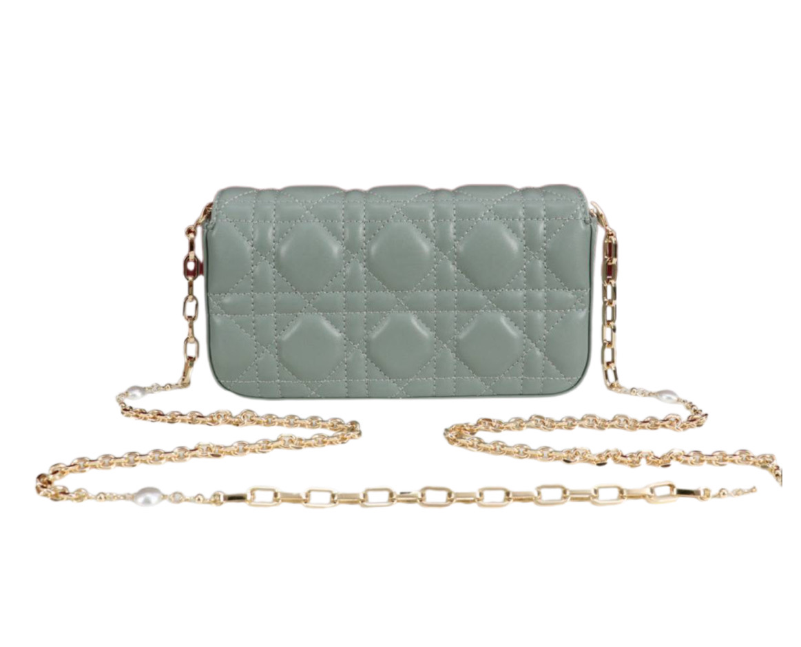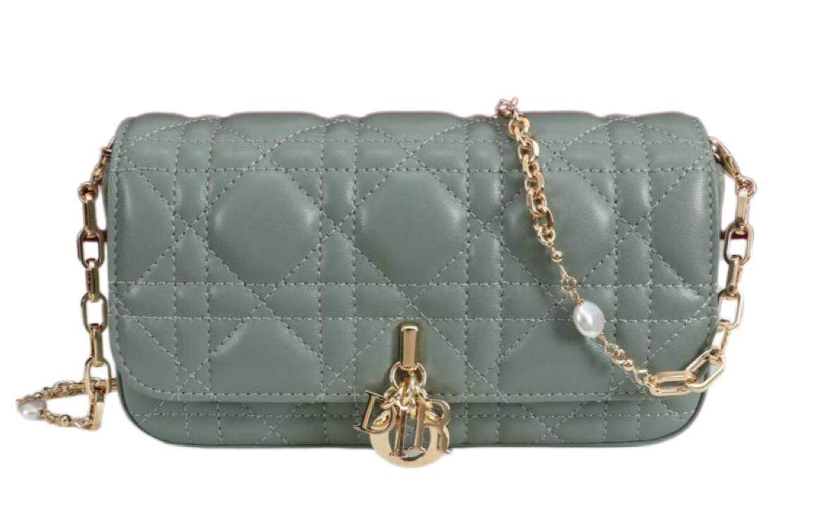 Чехол для телефона My Dior – Dior Talk – это продуманное и изысканное изделие. Изготовленный из бирюзовой кожи ягненка с узором Cannage, он украшен металлическими подвесками DIOR светло-золотистого цвета. Чехол дополнен элегантной съемной цепочкой, украшенной жемчужинами из смолы. Чехол можно носить в руке, на плече или через плечо.