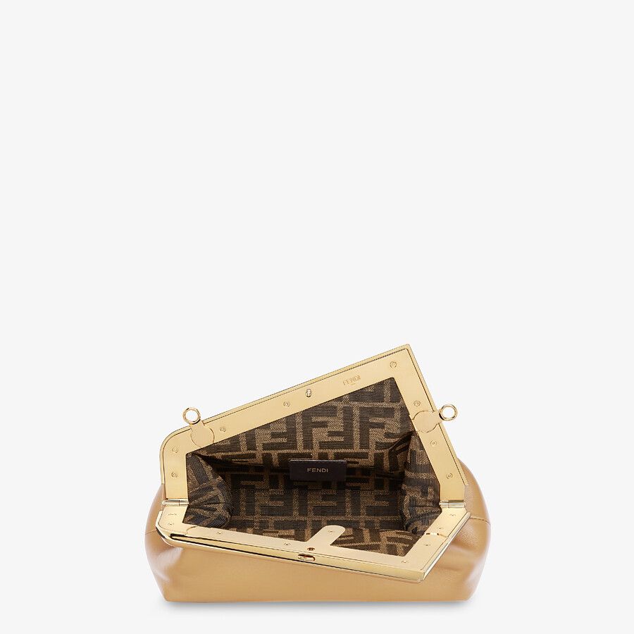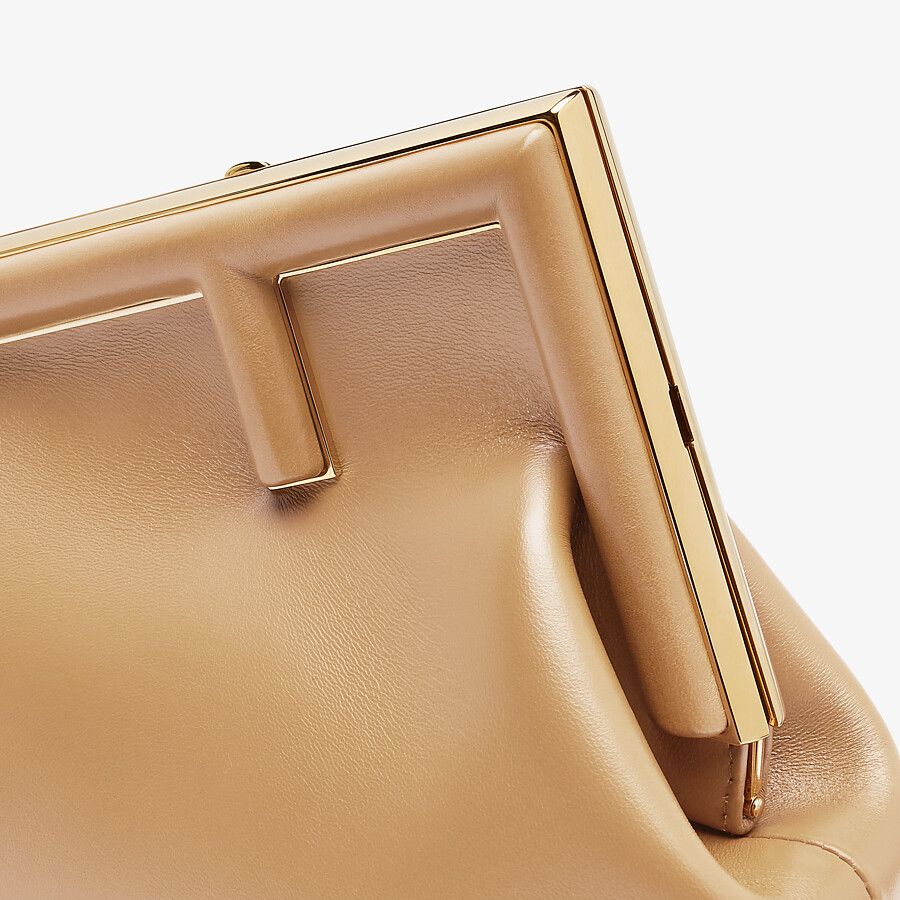 Сумка Fendi First маленького формата из мягкой кожи наппа бежевого цвета скрупной застежкой ввиде буквы F из металла, обтянутой кожей наппа втон.