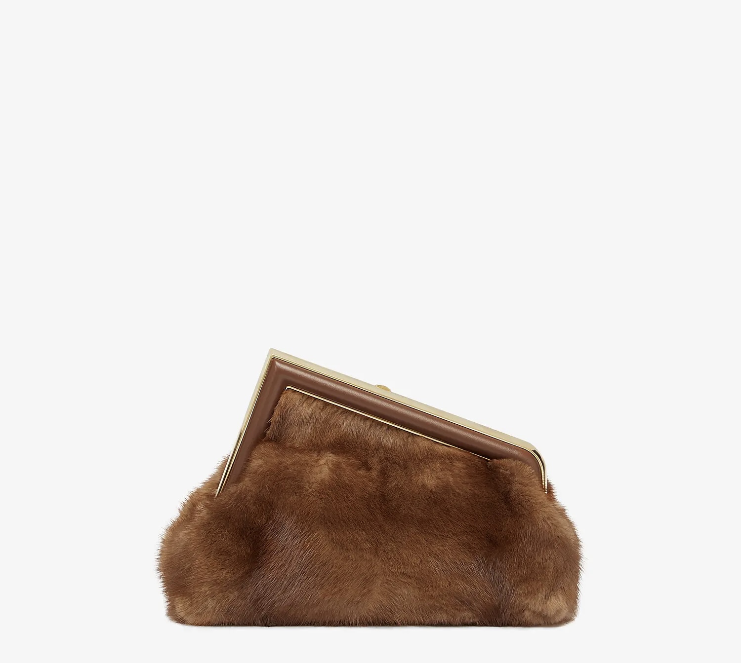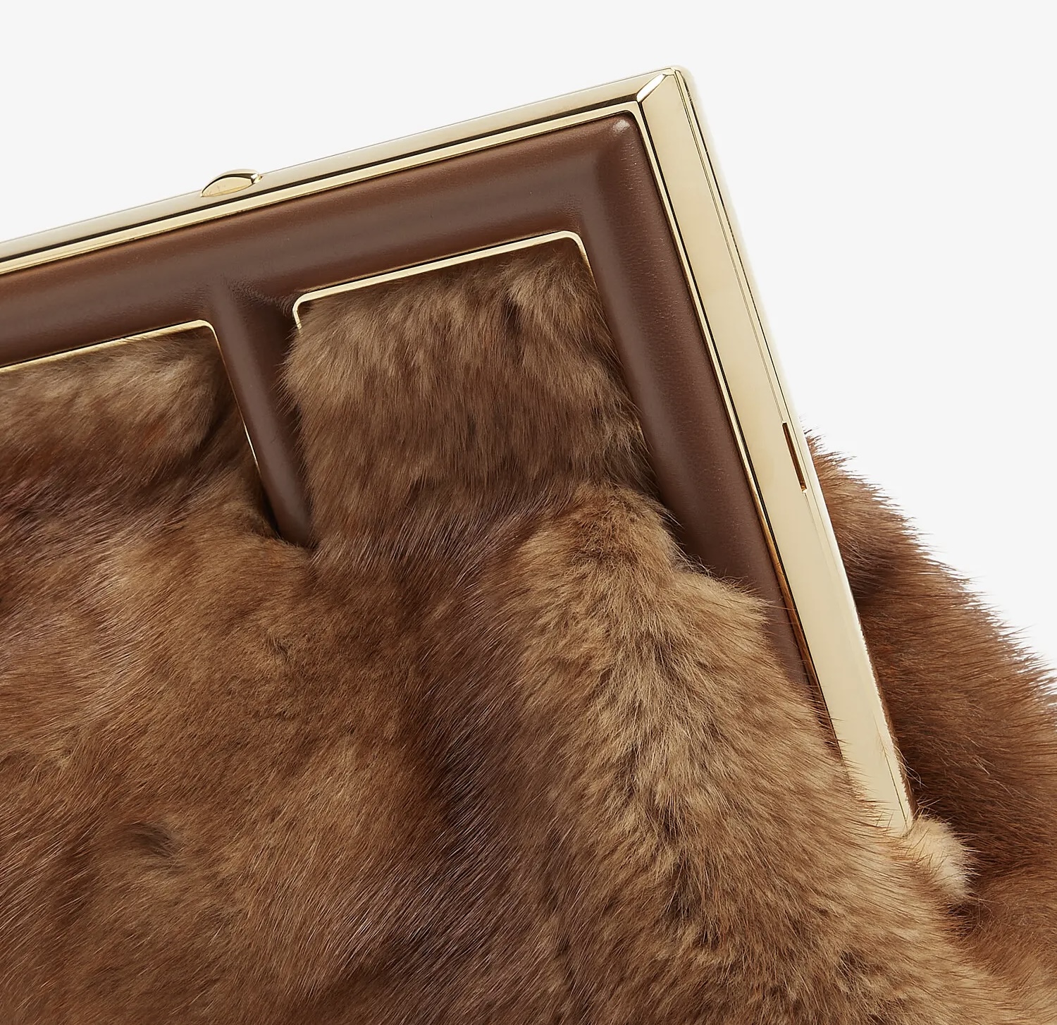 Сумка Fendi First маленького формата из меха норки коричневого цвета скрупной застежкой ввиде буквы F из металла, обтянутой кожей наппа втон.
