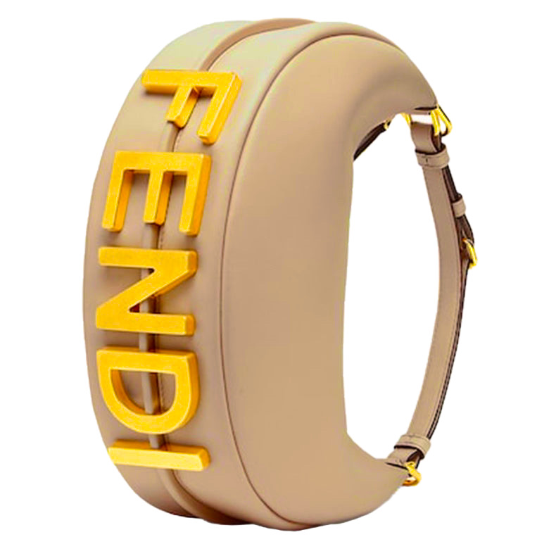 Маленькая сумка-хобо из мягкой бежевойкожи с винтажной металлической надписью FENDI золотого цвета, которую можно увидеть, когда сумку носят под мышкой.