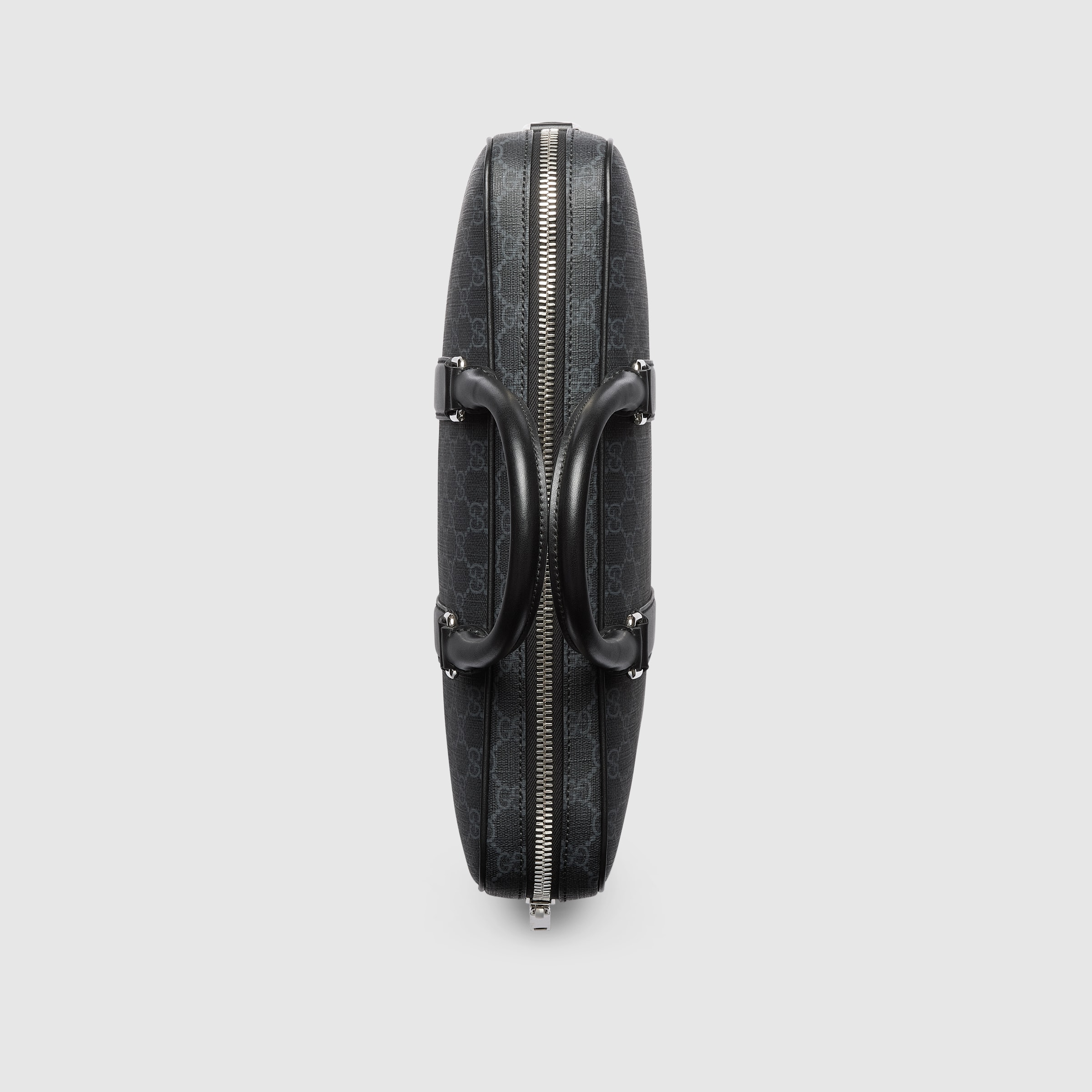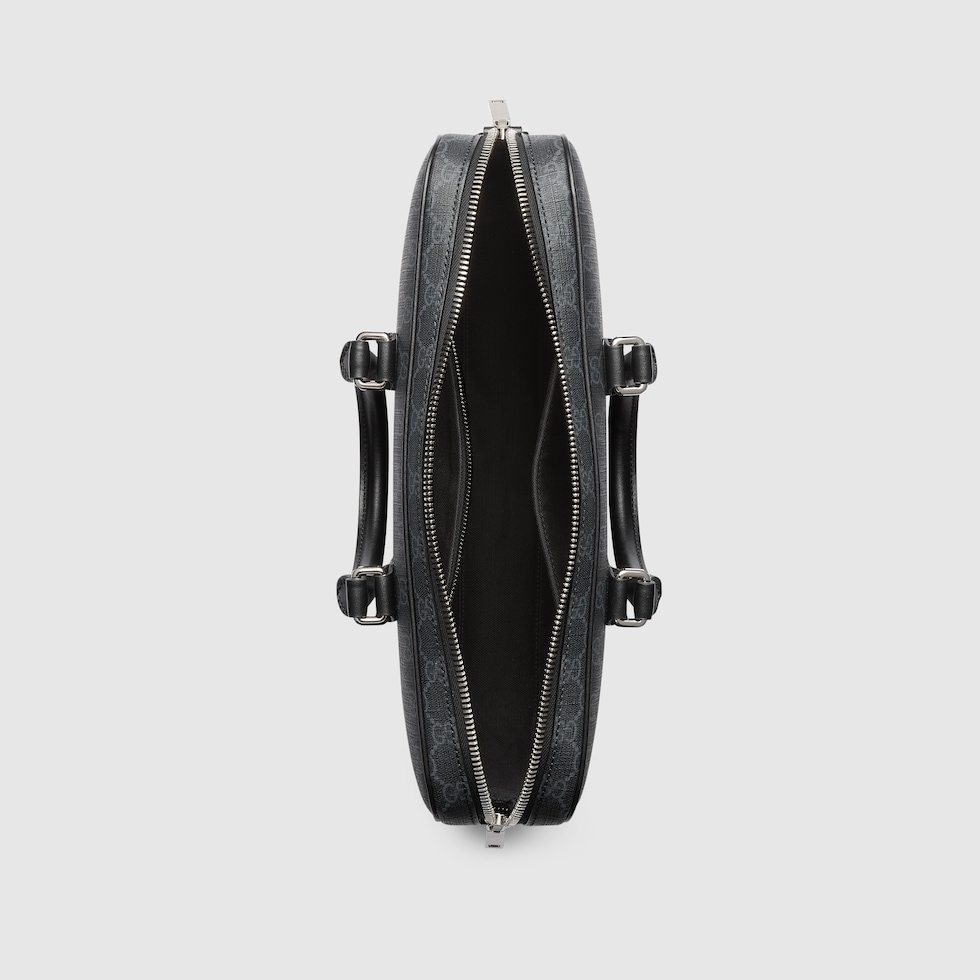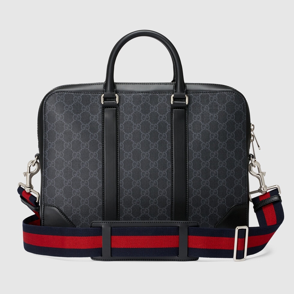 Лента Web и отделка из кожи черного цвета придают особую выразительность орнаменту GG, представленному в характерном черно-сером исполнении. Плоский портфель закрывается с помощью двусторонней застежки-молнии.