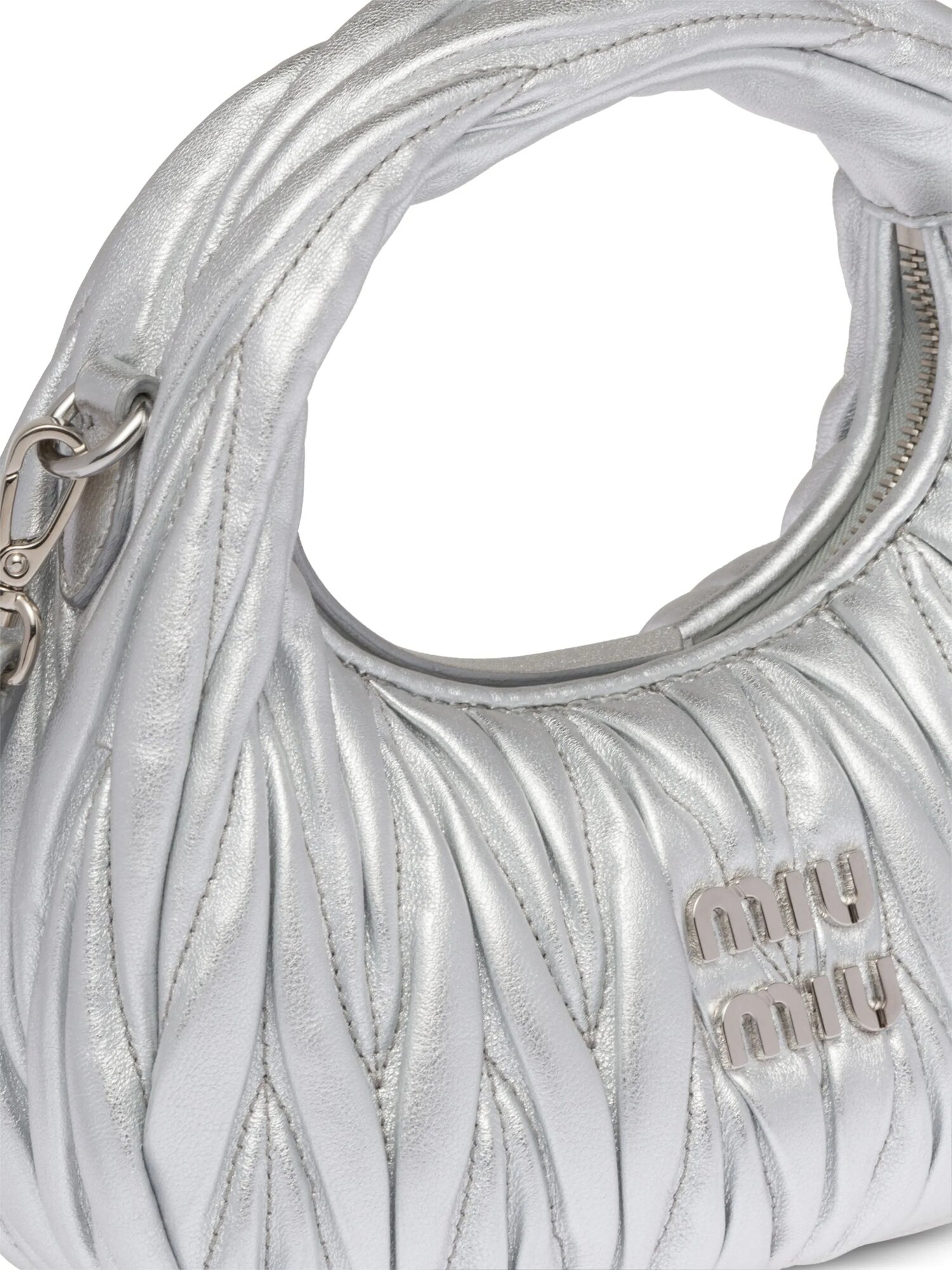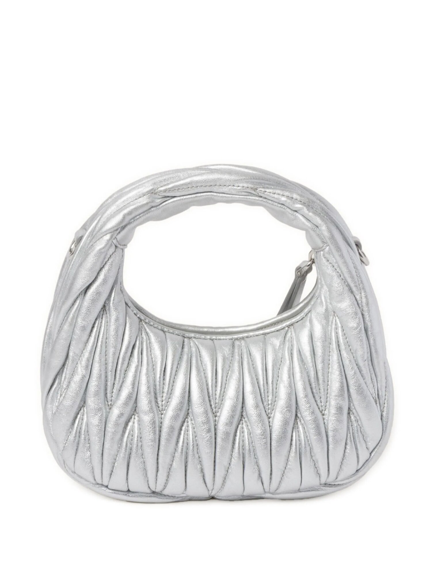 Маленькая сумка-шоппер из кожи матлассе от Miu Miu.Он оснащен металлической надписью-логотипом спереди, магнитной застежкой сверху, двумя верхними ручками и внутренним карманом на молнии.