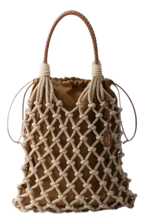 Эта сумка-тоут от Prada имеет плетеные кожаные ручки и внешнюю отделку в технике макраме. Завершает образ кожаный кулон с напечатанным на нем логотипом. Внутри находится съемный мешочек из нейлона Re-Nylon на завязках.