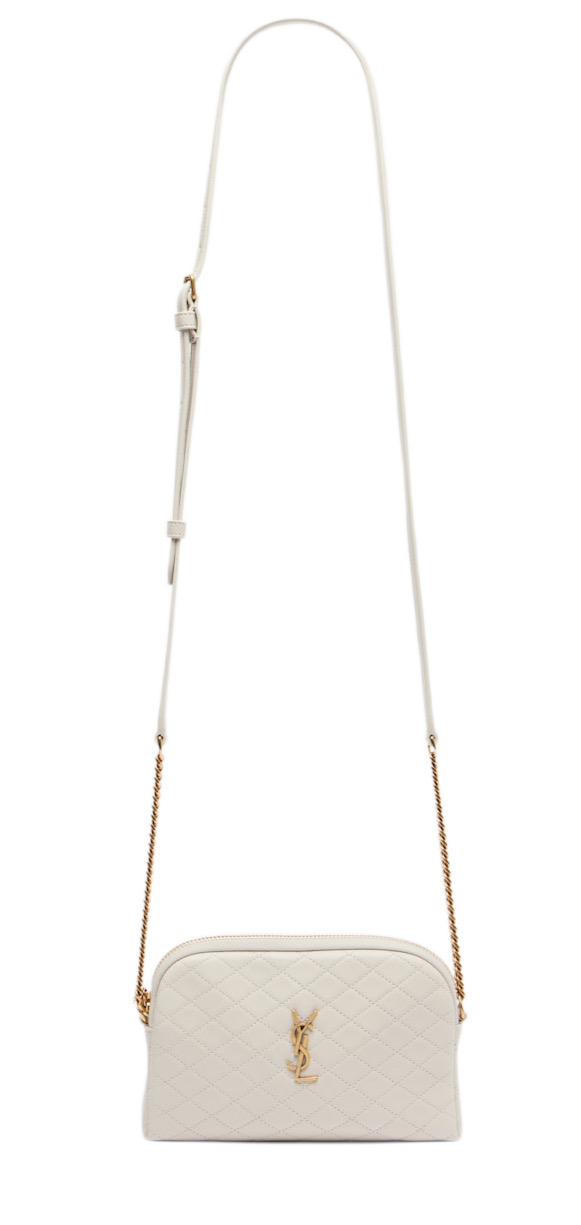 Монограмма YSL, один из самых известных символов моды, состоит из переплетенных инициалов основателя Saint Laurent. Кожаная сумка Gaby, выполненная в стеганом шевронном узоре, имеет отделение на молнии сверху и золотистую фурнитуру.