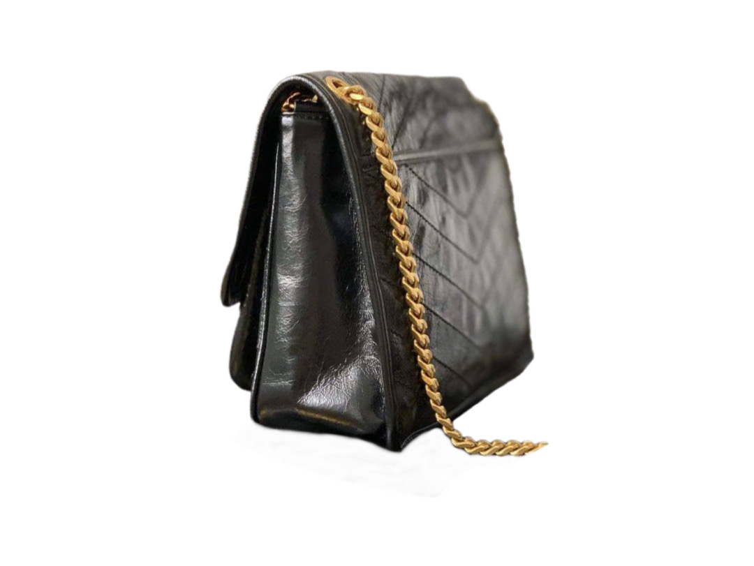 Черный, телячья кожа, стеганый дизайн с узором шеврон, фурнитура в тон, знаковый металлический логотип YSL, ремень-цепочка на плечо, откидной клапан на магните, прорезной карман спереди, основное отделение и внутренний прорезной карман.