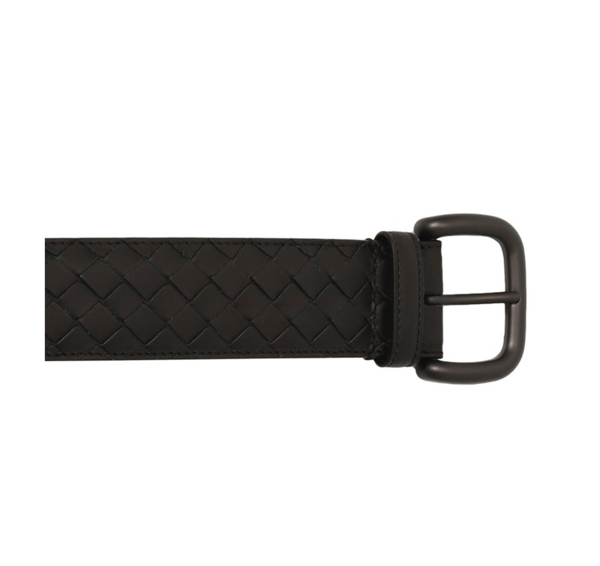 Регулируемый ремень сплели в технике intreccio из узких полос телячьей кожи. Аксессуар застегивается закругленной металлической пряжкой из металла в тон.