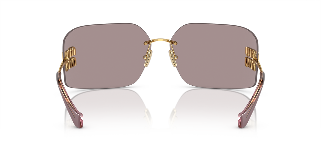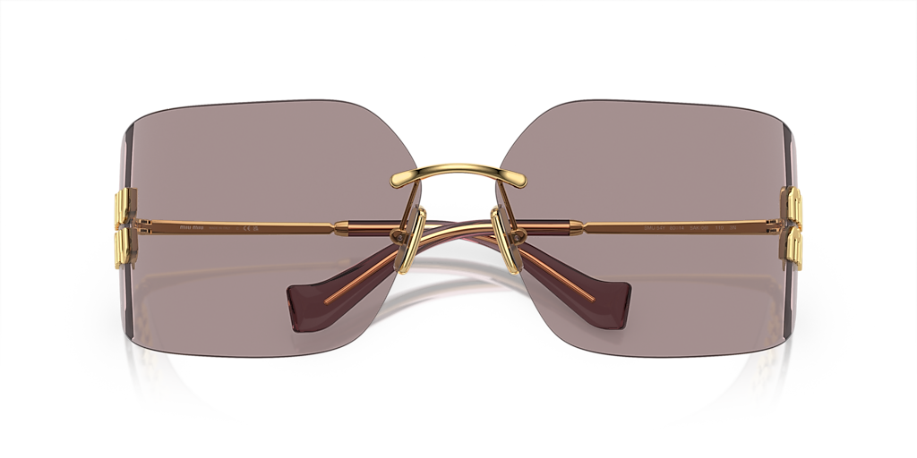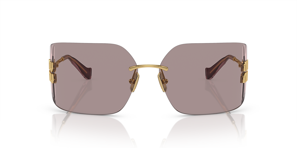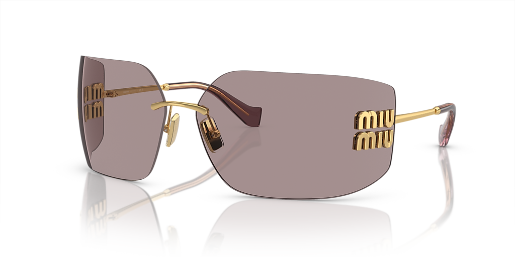 Безободковую оправу солнцезащитных очков с регулируемыми носовыми упорами изготовили из золотистого металла. Принадлежность марке подчеркнули рельефным логотипом на изогнутых линзах, полностью блокирующих УФ-излучение.