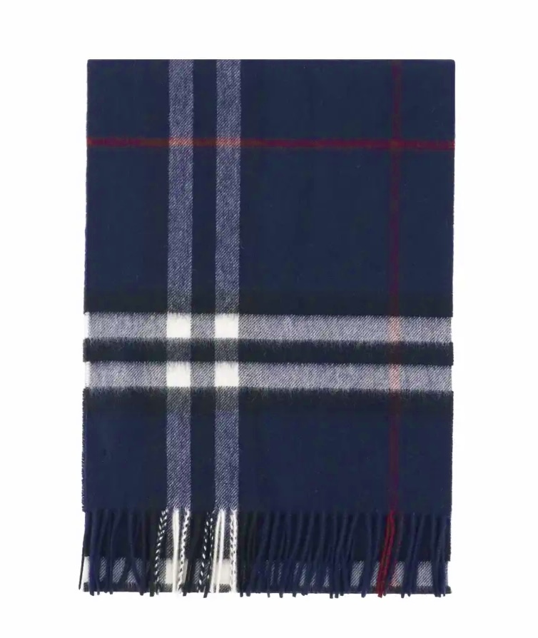 Темно-синий шарф с фирменным клетчатым узором и бахромой по краям выполнен из тонкого кашемира. Изделия из такого материала получаются настолько мягкими и легкими, что почти не ощущаются на теле, но отлично согревают в прохладное время года. Длины аксессуара хватит, чтобы завязать классический французский узел.