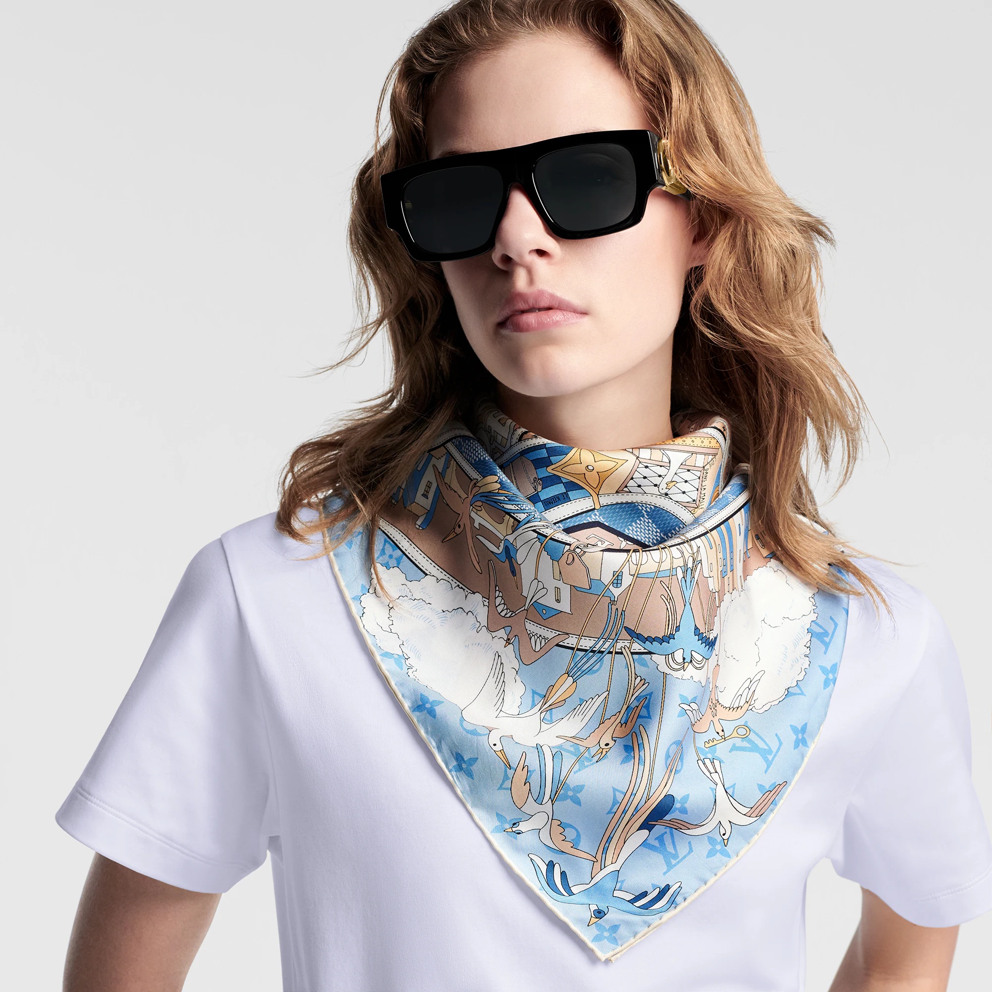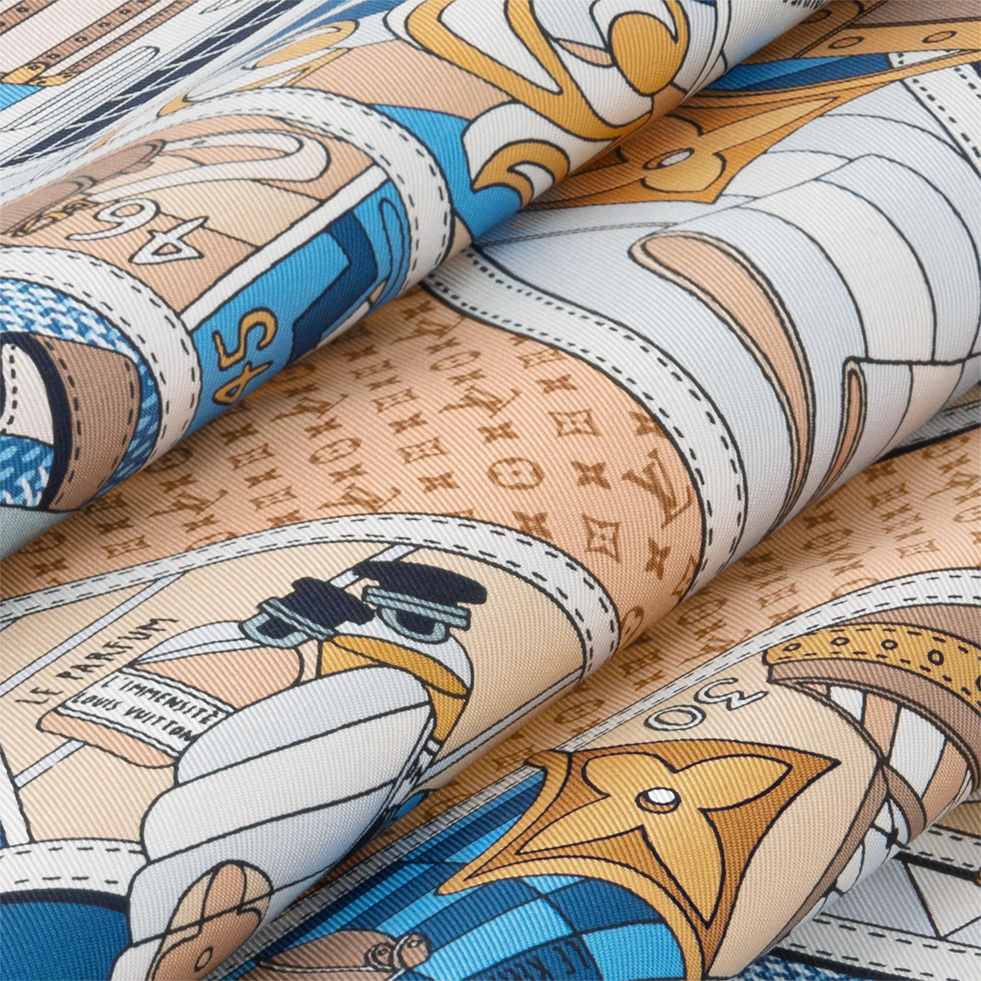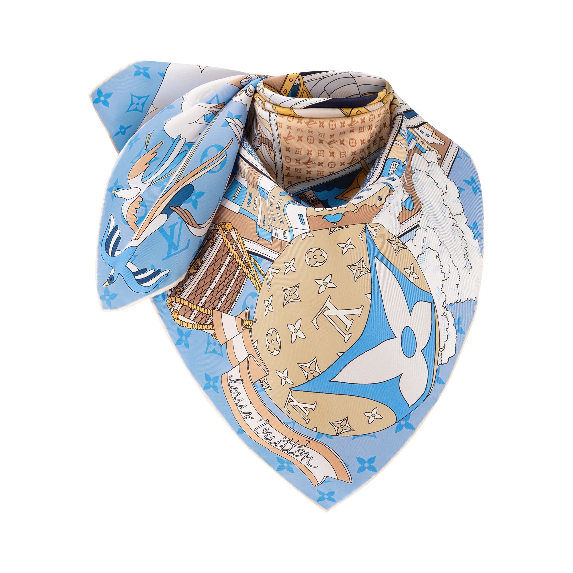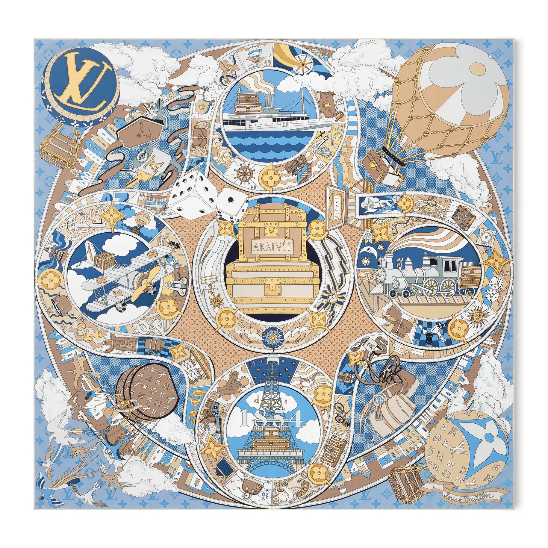 Шелковый платок LV Journey отправляется в необыкновенное приключение в мире путешествий. Его замысловатый игривый принт сочетает в себе изображения багажа, воздушных шаров, поездов, кораблей и самолетов с игральными костями, облаками и фирменными мотивами Monogram и Damier. Яркий, неподвластный времени дизайн, который, несомненно, сделает этот аксессуар культовым. Длина: 35,4 дюйма (91 см). Высота: 35,4 дюйма (91 см). Синий цвет: 100% шелк: шелкография: дорожные мотивы: узор Monogram: узор Damier