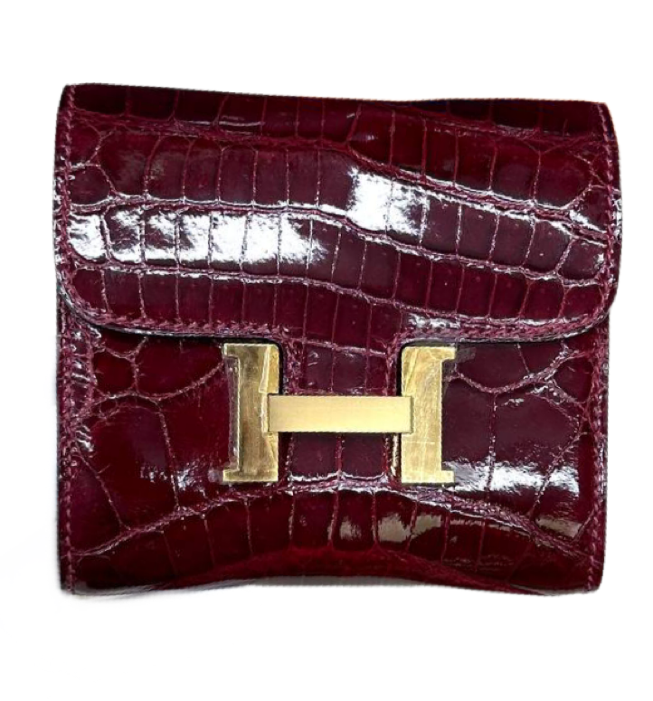Тонкий кошелек Constance выполнен из бордовой кожи миссисипского аллигатора с золотой фурнитурой, тональными швами, шлевкой для ремня сзади, передним клапаном с застежкой-кнопкой в форме буквы «H» и съемным карманом для монет.