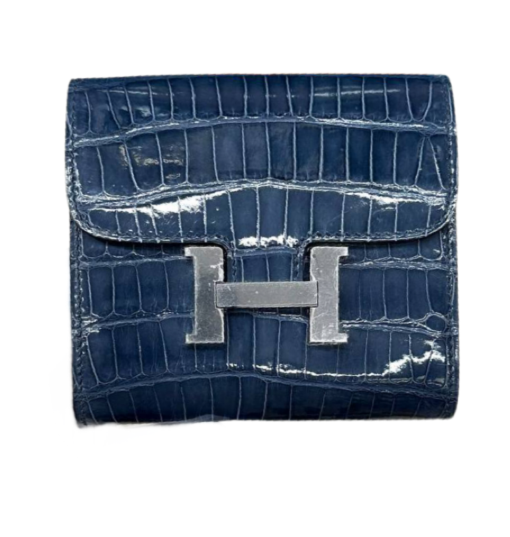 Тонкий кошелек Constance выполнен из синей кожи миссисипского аллигатора с палладиевой фурнитурой, тональными швами, шлевкой для ремня сзади, передним клапаном с застежкой-кнопкой в форме буквы «H» и съемным карманом для монет.