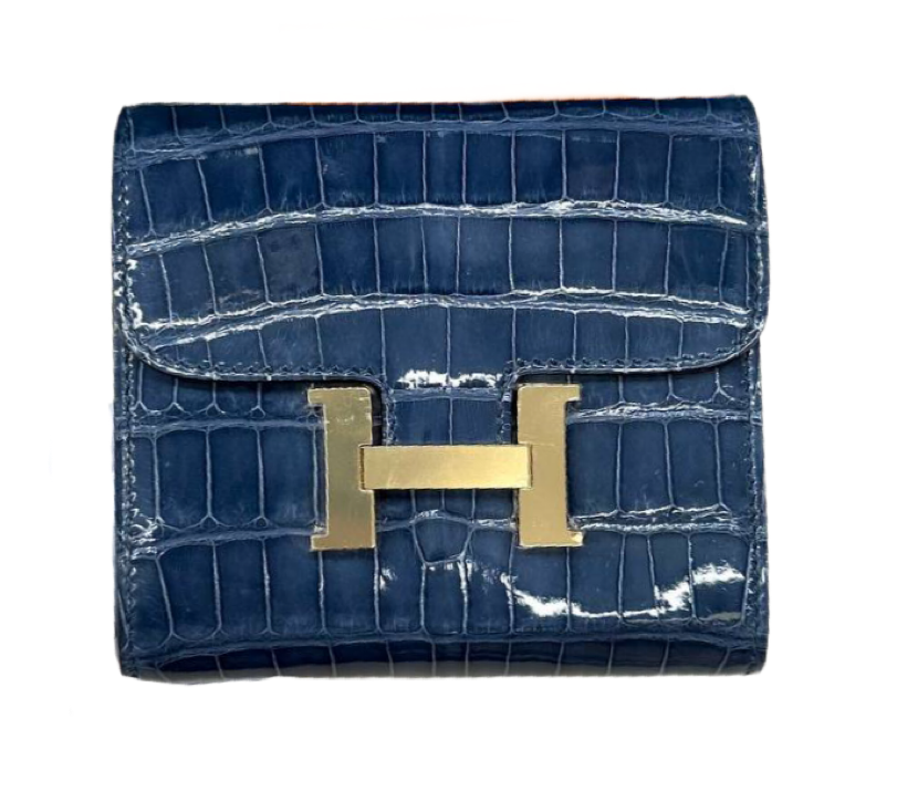 Тонкий кошелек Constance выполнен из голубой кожи миссисипского аллигатора с золотой фурнитурой, тональными швами, шлевкой для ремня сзади, передним клапаном с застежкой-кнопкой в форме буквы «H» и съемным карманом для монет.