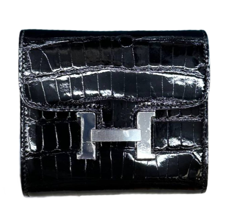 Тонкий кошелек Constance выполнен из кожи миссисипского аллигатора с палладиевой фурнитурой, тональными швами, шлевкой для ремня сзади, передним клапаном с застежкой-кнопкой в форме буквы «H» и съемным карманом для монет.