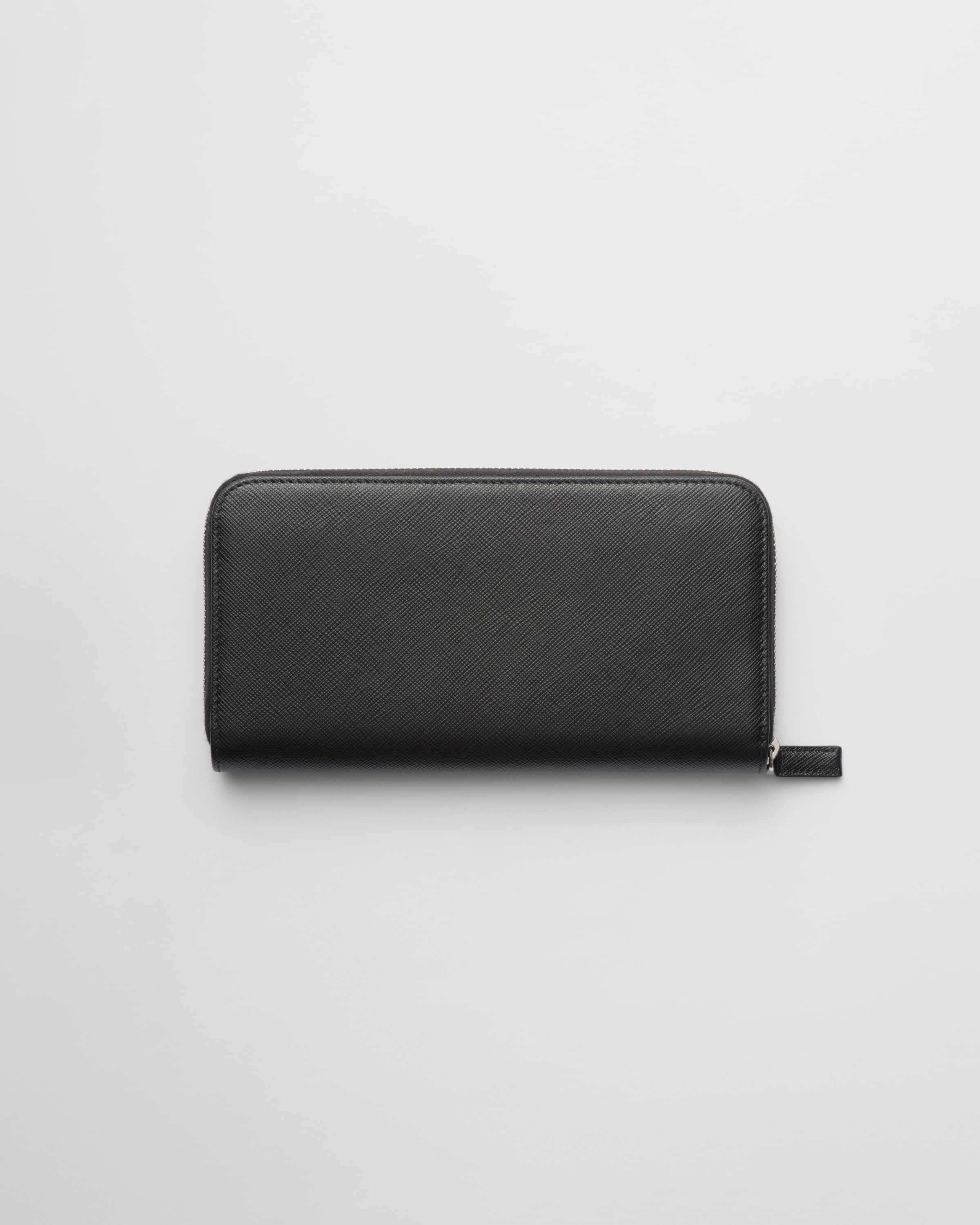 Этот элегантный кошелек на молнии из сафьяновой кожи украшен эмалированным металлическим треугольным логотипом. Внутри аксессуара три отделения, карман на молнии и двенадцать слотов для карт.