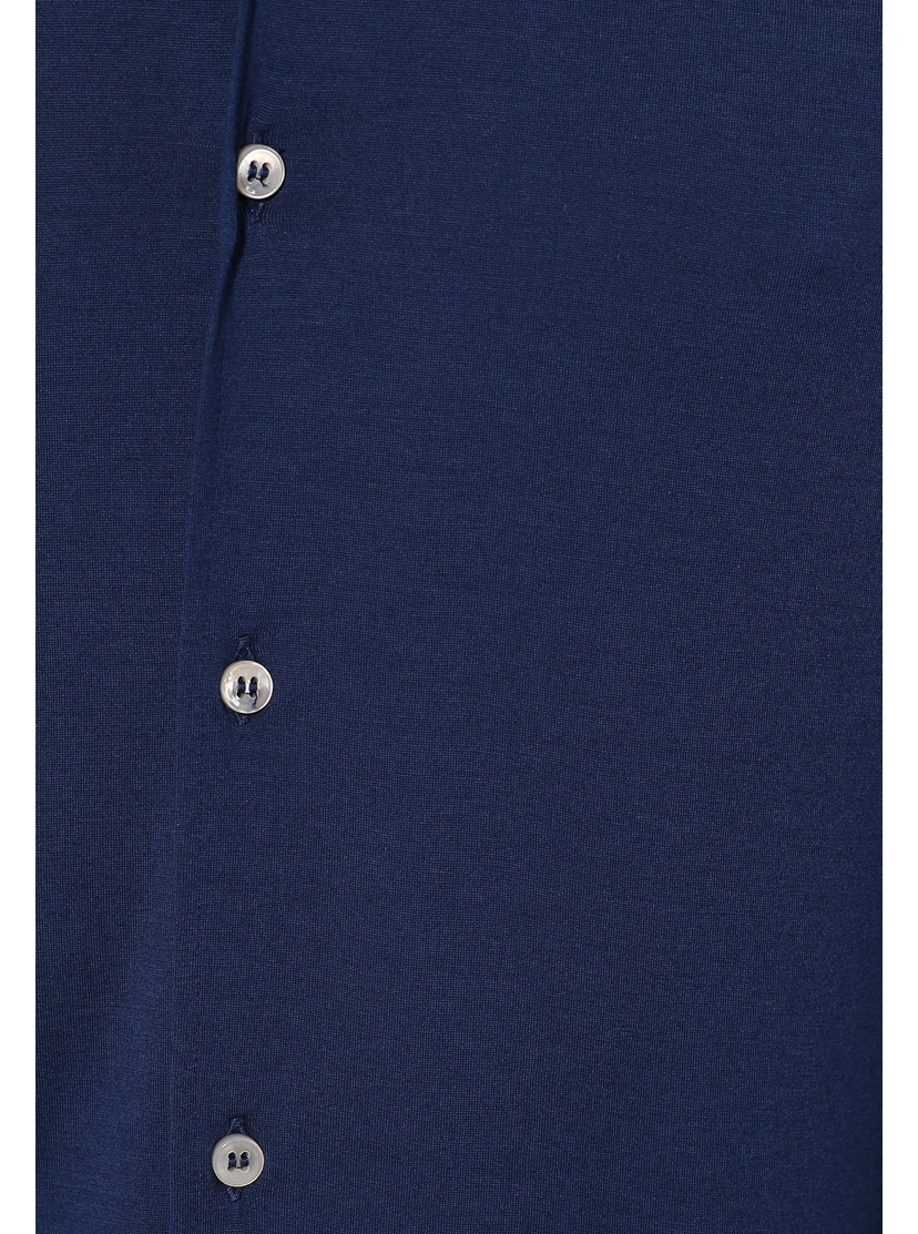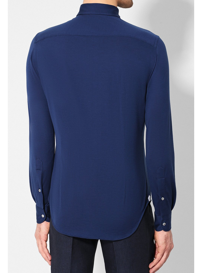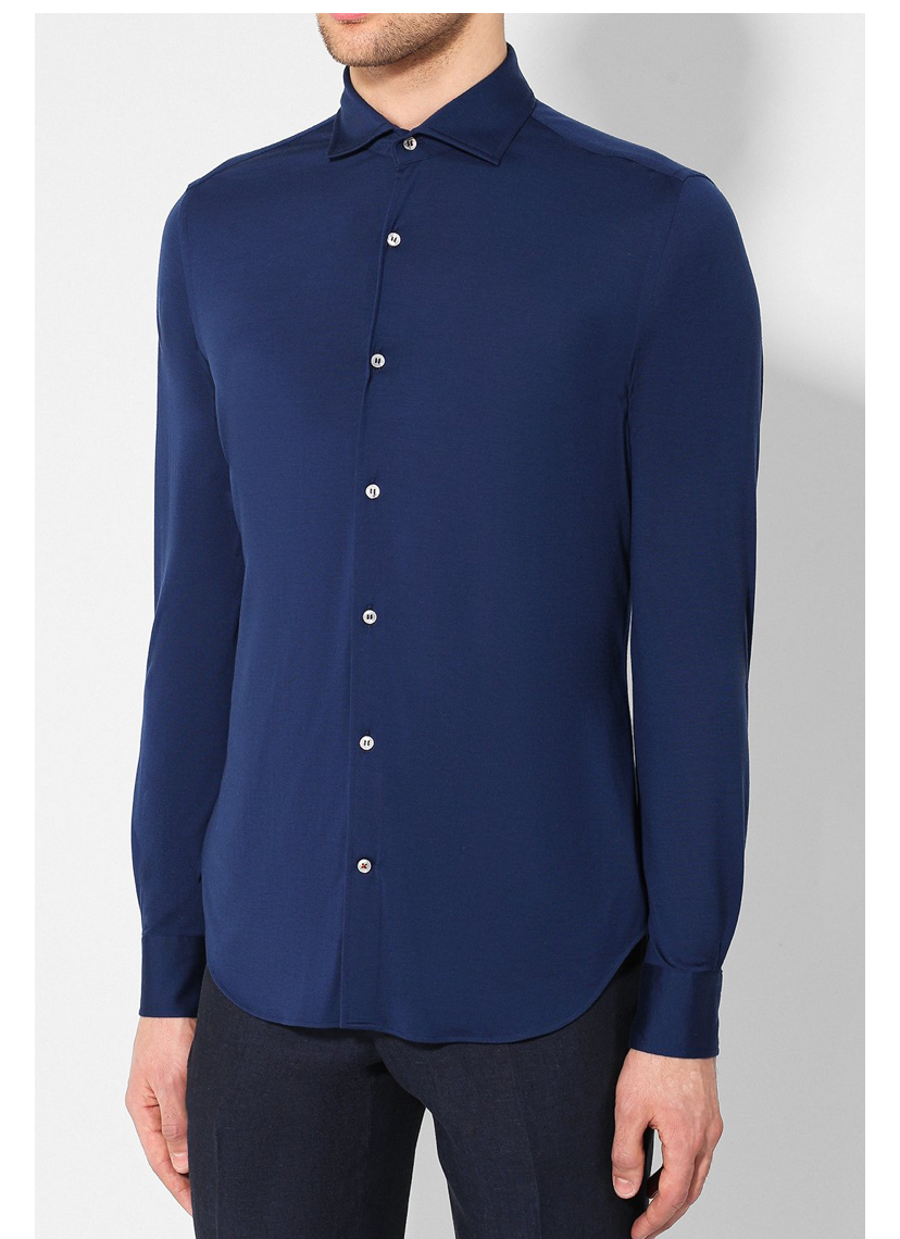 При создании темно-синей рубашки из весенне-летней коллекции дизайнеры марки сделали ставку на материал. Прямая модель сохраняет комфортную для кожи температуру благодаря природным свойствам фирменной мериносовой шерсти Gift Of Kings. Ее волокна в несколько раз тоньше человеческого волоса, поэтому такое изделие с длинными рукавами остается почти невесомым.