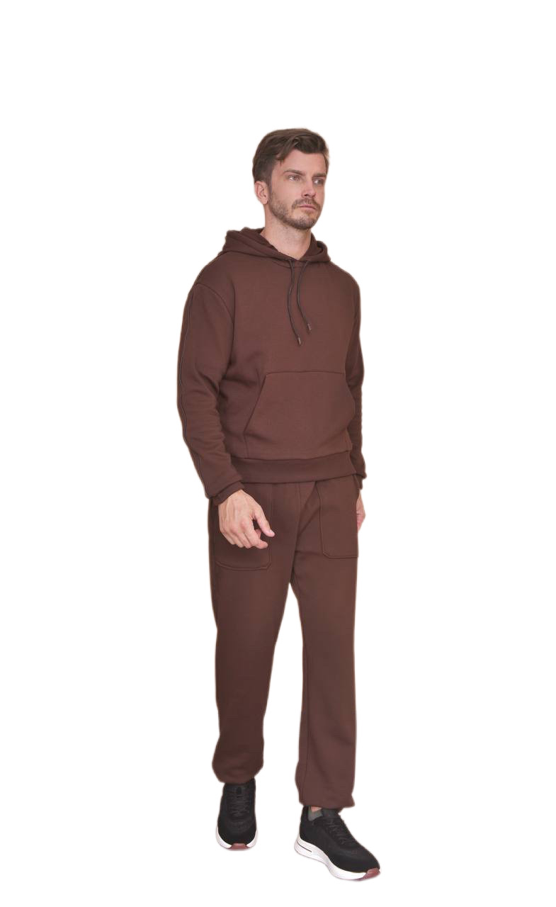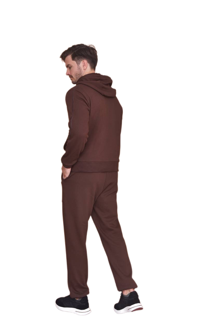 В осенне-зимнем сезоне этот костюм представлен из хлопкового трикотажа с начесом. Ткань обработана так, чтобы на ощупь она напоминала персиковую кожу, подчеркивая естественную мягкость хлопкового волокна. Его отличает классический крой и заниженная линия плеч, а кожаная отделка придает завершающий штрих мужественности. При ношении с соответствующими брюками он создает удобный спортивный костюм для отдыха.