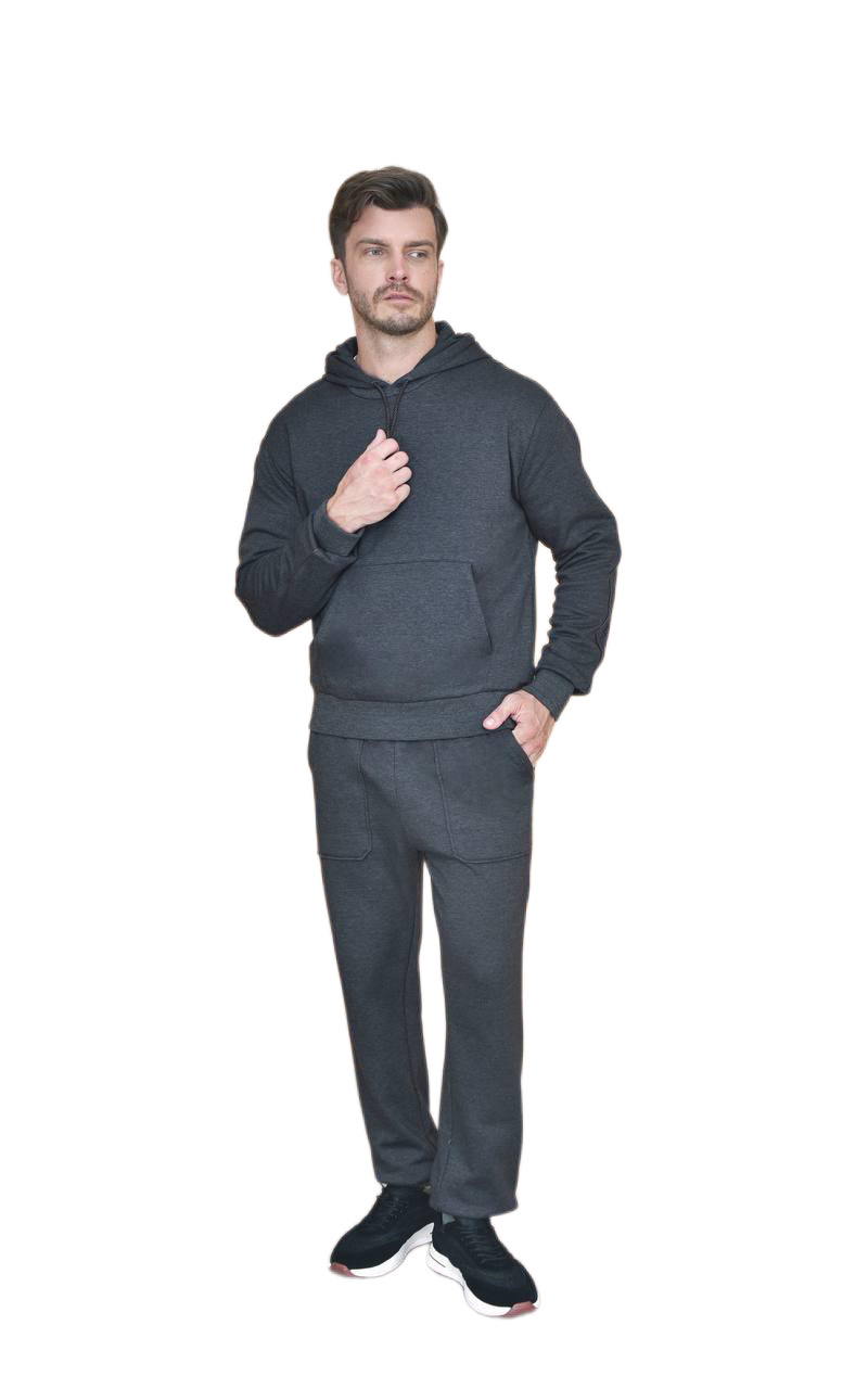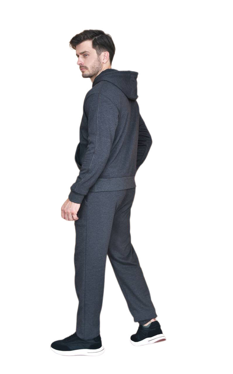 В осенне-зимнем сезоне этот костюм представлен из хлопкового трикотажа с начесом. Ткань обработана так, чтобы на ощупь она напоминала персиковую кожу, подчеркивая естественную мягкость хлопкового волокна. Его отличает классический крой и заниженная линия плеч, а кожаная отделка придает завершающий штрих мужественности. При ношении с соответствующими брюками он создает удобный спортивный костюм для отдыха.