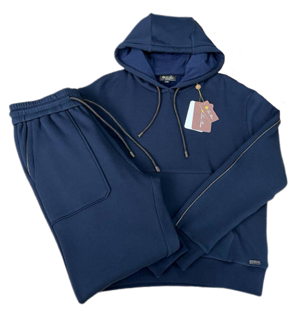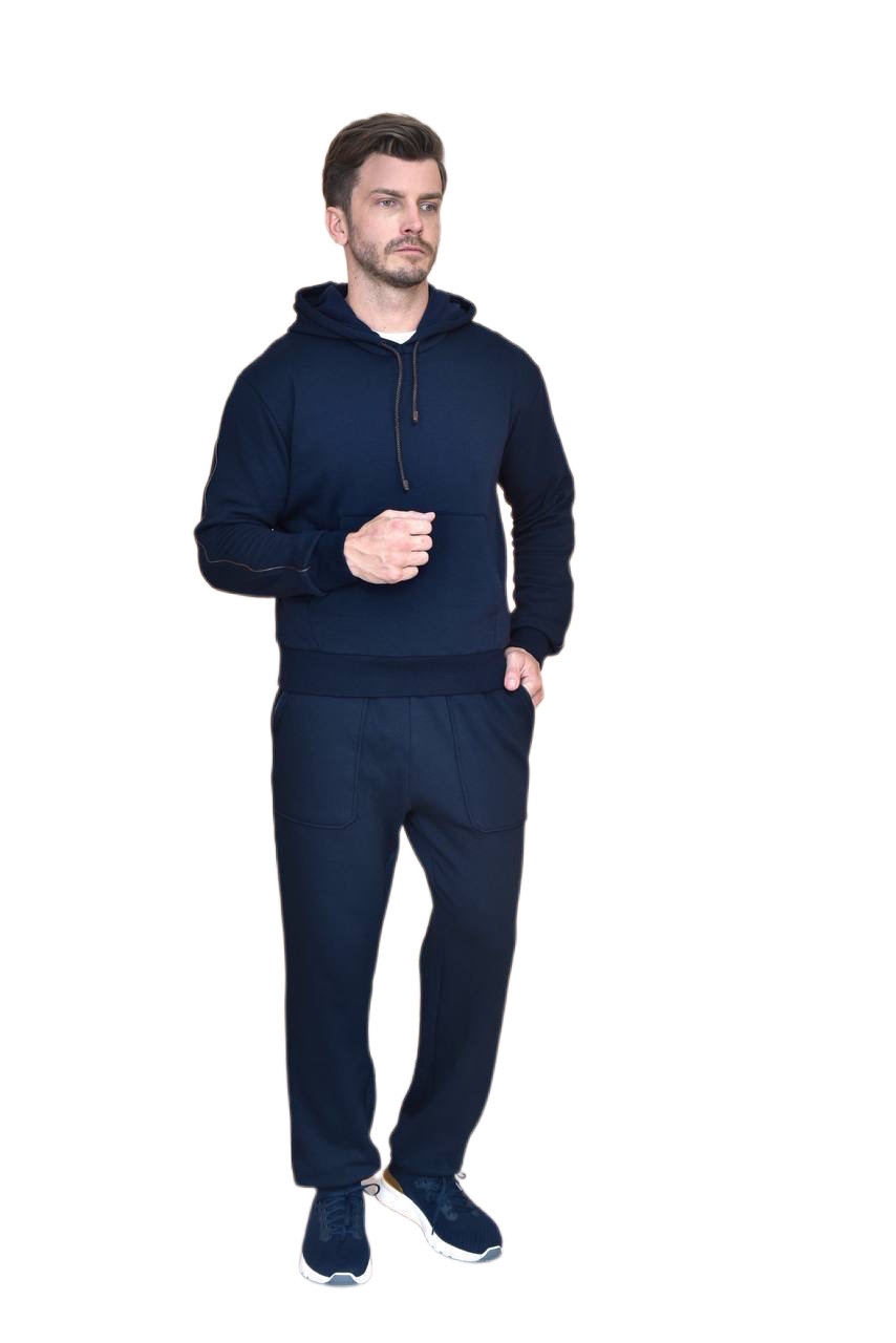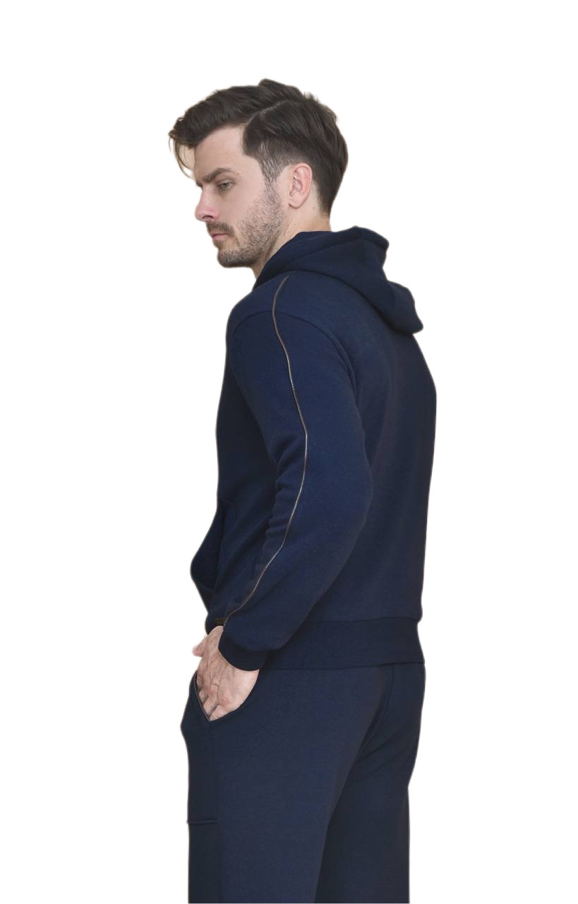 В осенне-зимнем сезоне этот костюм представлен из хлопкового трикотажа с начесом. Ткань обработана так, чтобы на ощупь она напоминала персиковую кожу, подчеркивая естественную мягкость хлопкового волокна. Его отличает классический крой и заниженная линия плеч, а кожаная отделка придает завершающий штрих мужественности. При ношении с соответствующими брюками он создает удобный спортивный костюм для отдыха.