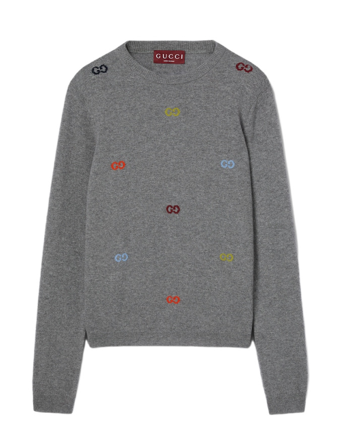 - Модели Pre-Fall 2025 в приглушенных черных, серых и зеленых тонах выделяются изящной цветочной вышивкой, тиснеными логотипами и другими искусными деталями. Этот свитер, изготовленный из серого тонкого кашемира, украшен разноцветной интарсией GG.
