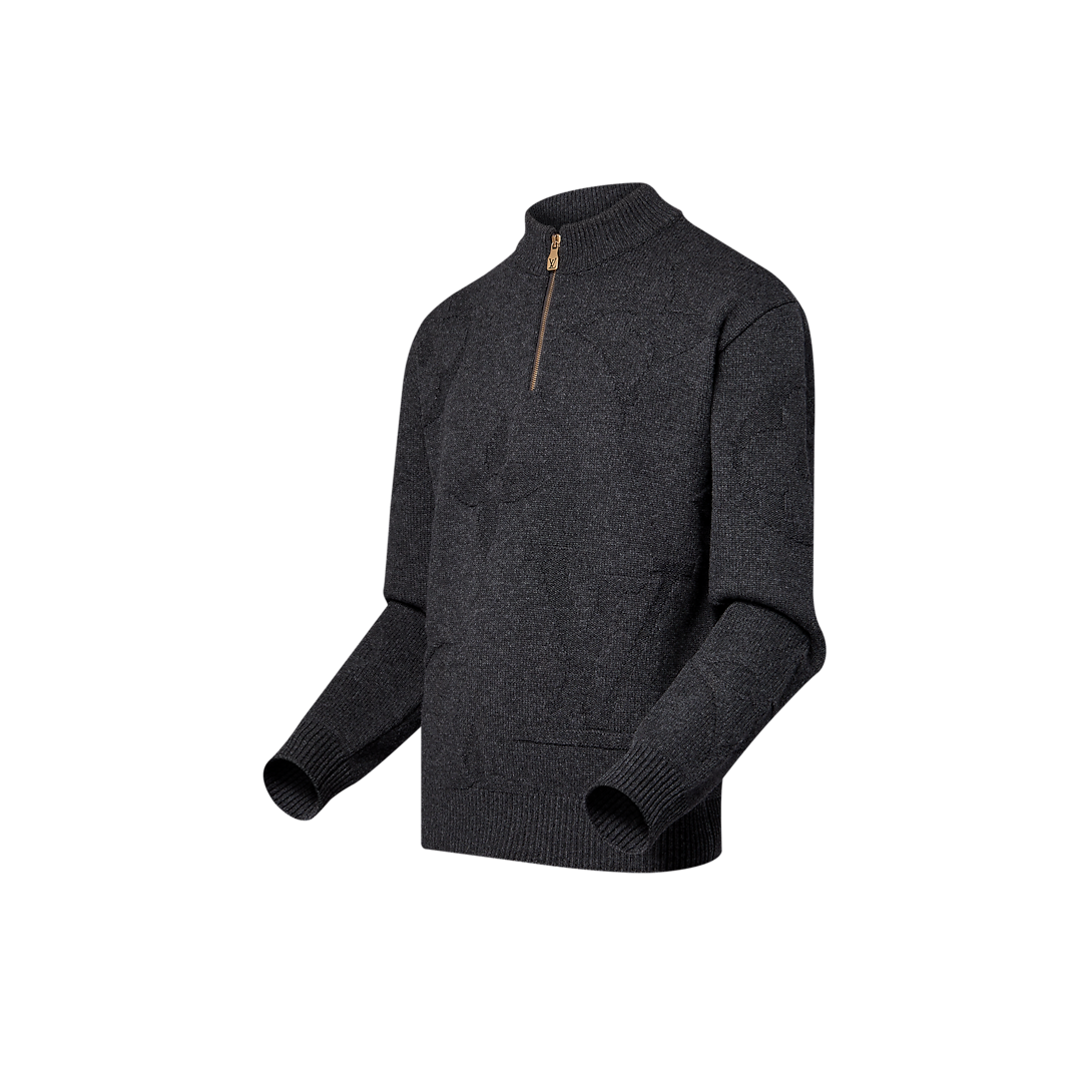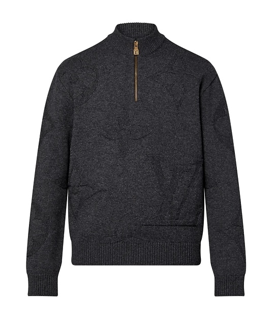 Этот элегантный шерстяной свитер темно-серого цвета с воротником-молнией до середины длины украшен сплошным узором Monogram Macro. Графичный, но в то же время сдержанный, мотив тонко подчеркивается использованием разных стежков, создающих едва заметный фактурный эффект. Универсальный темный цвет позволяет легко комбинировать эту изысканную вещь.