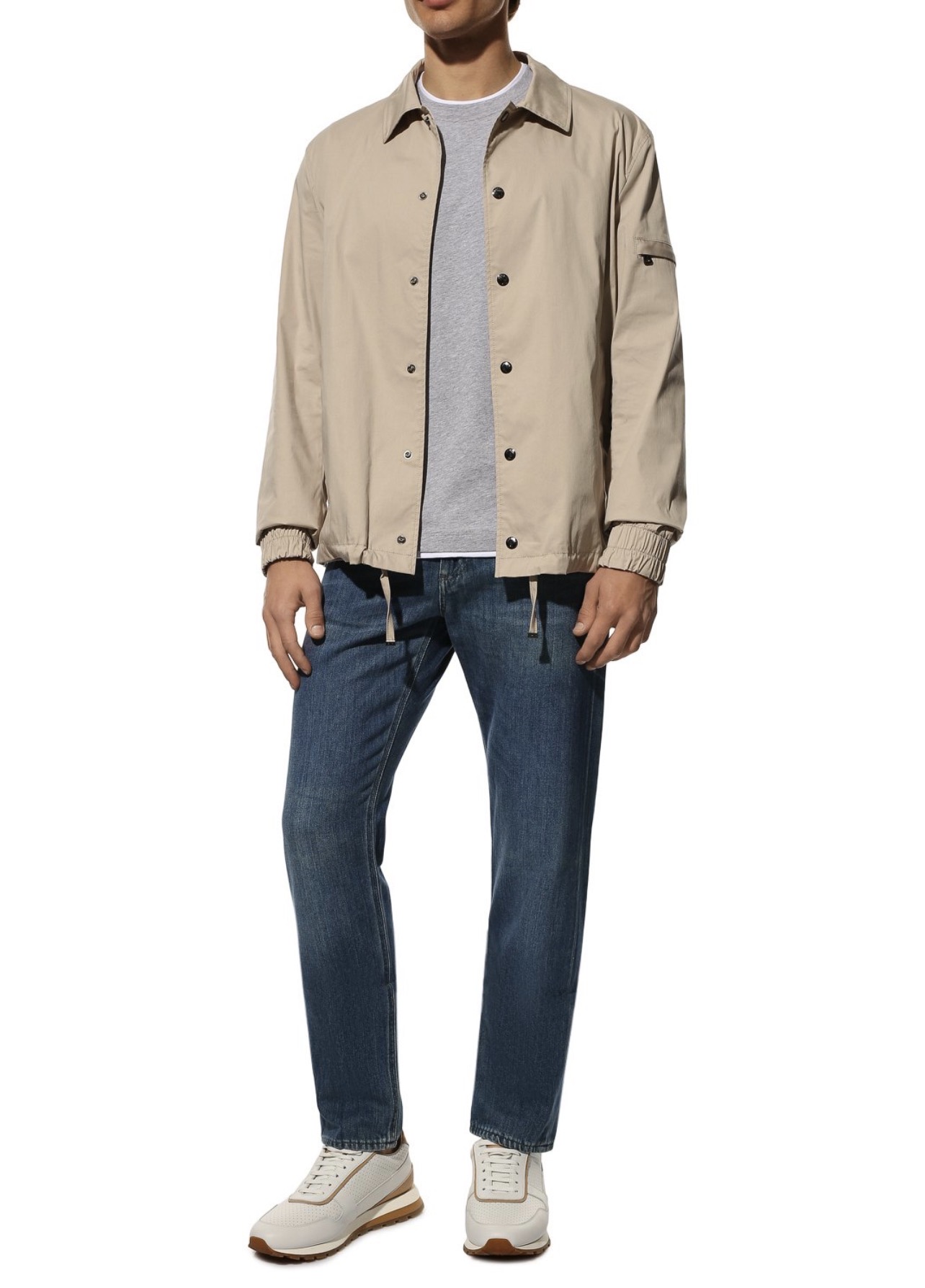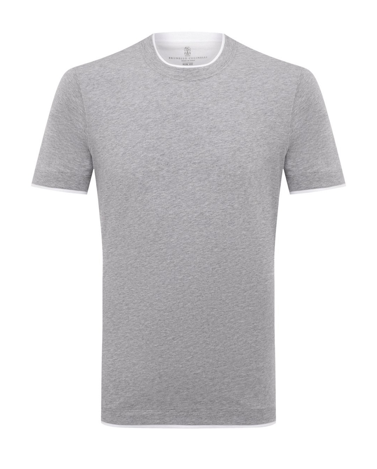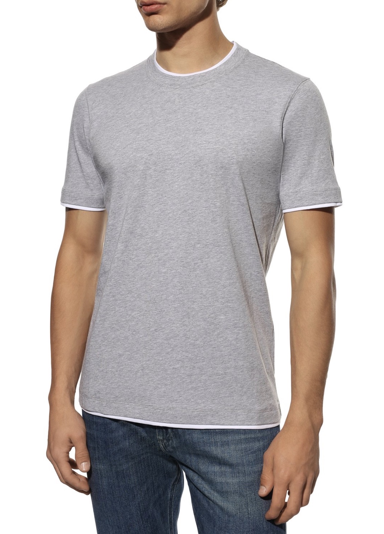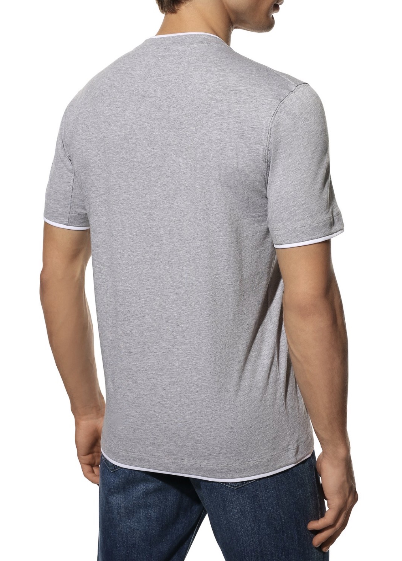 Футболку выполнили из меланжевого джерси на основе льна и хлопка. Горловину, манжеты и пояс дополнили контрастными вставками, создающими иллюзию многослойности.