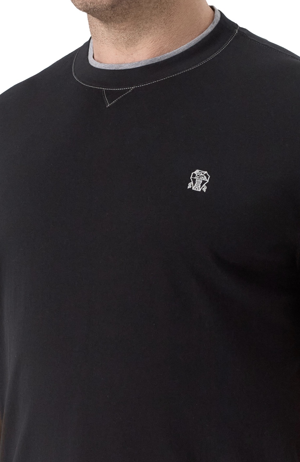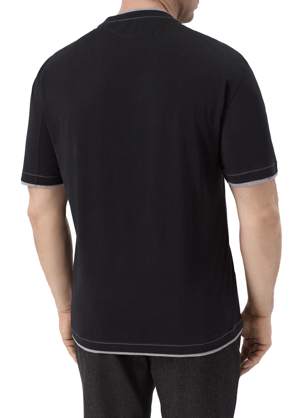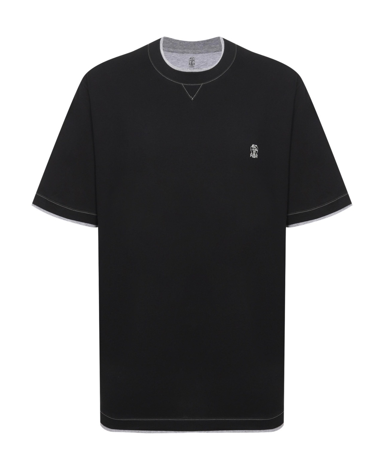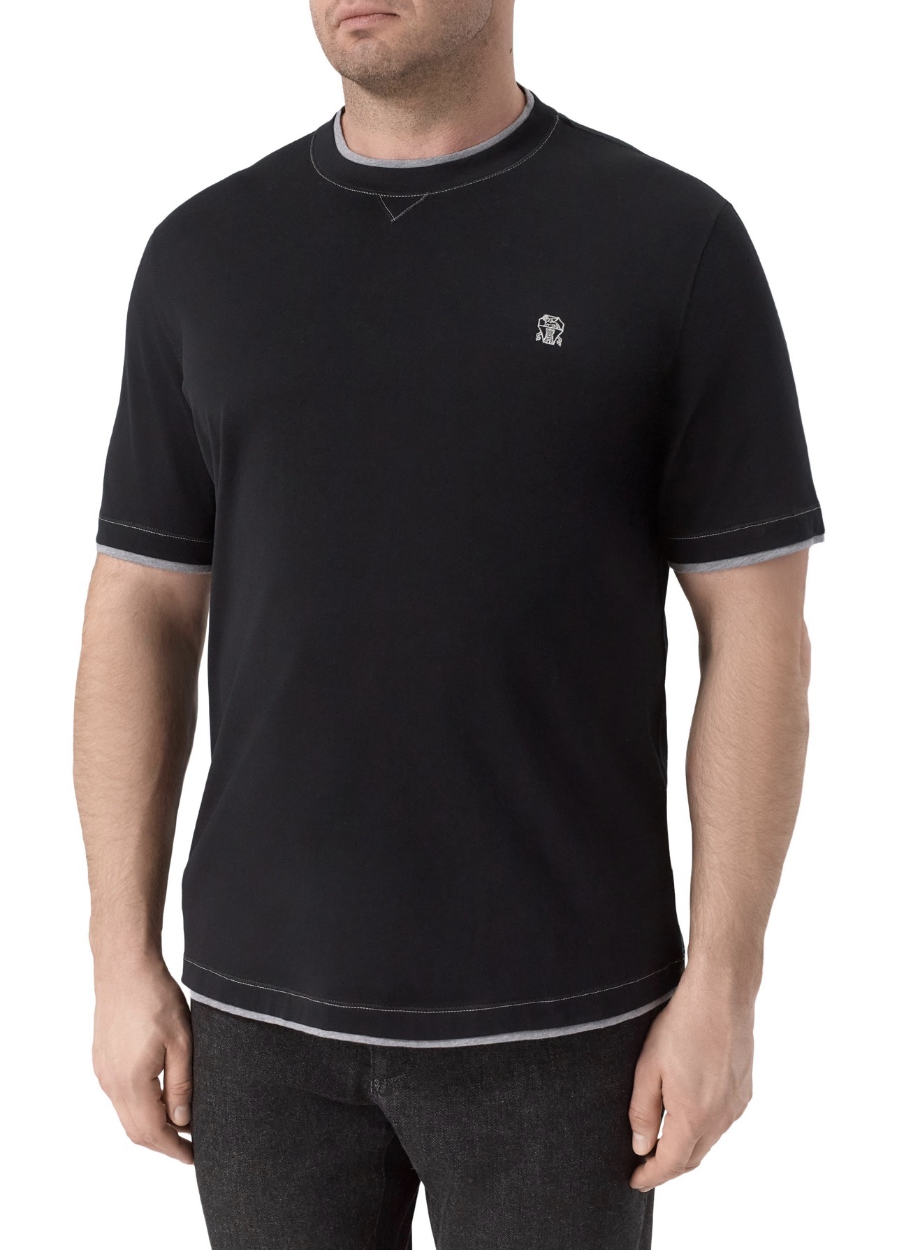 Футболку сшили из хлопкового джерси, предусмотрев контрастные вставки, создающие иллюзию многослойности. Спереди вышили небольшую эмблему Solomeo.
