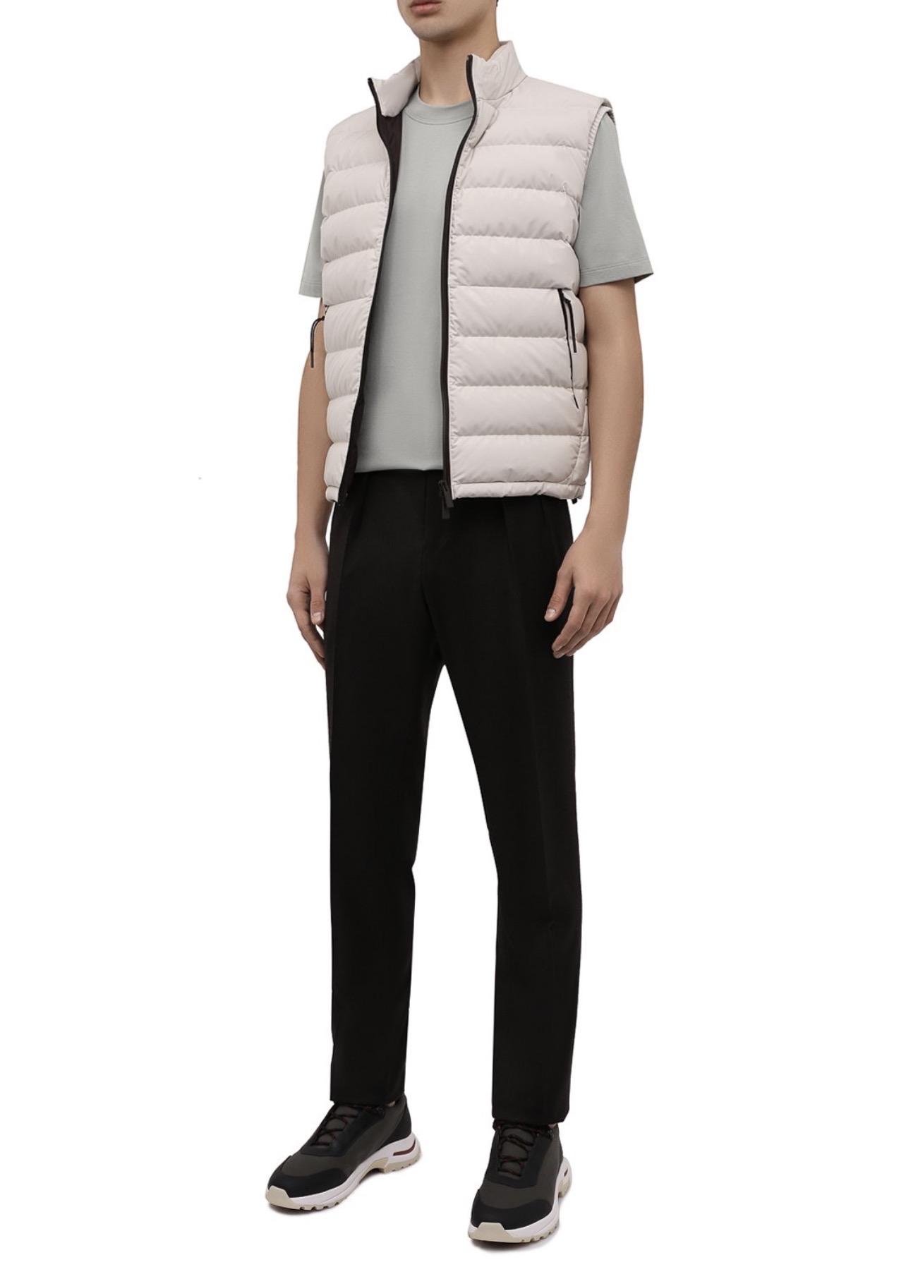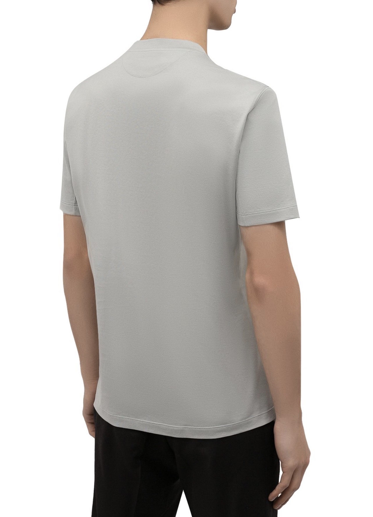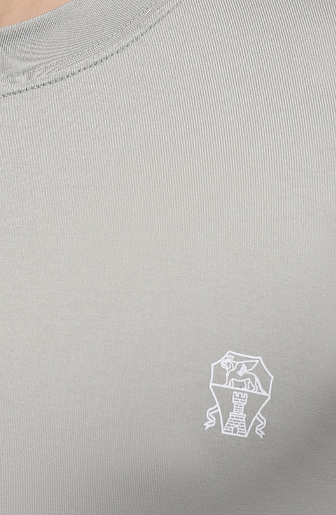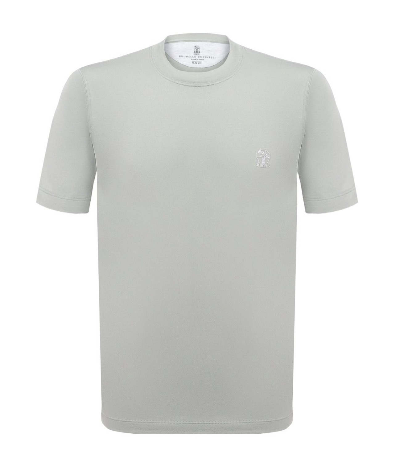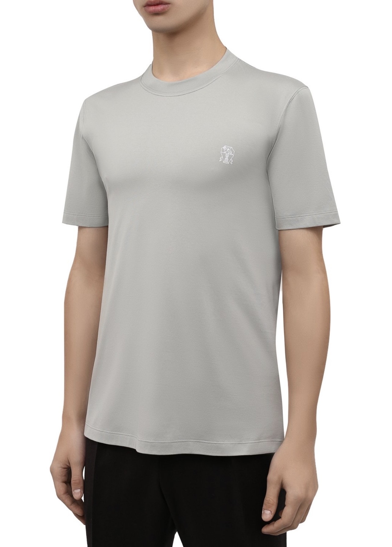 Для пошива футболки серо-зеленого из весенне-летней коллекции мастера марки использовали мягкое джерси основе длинноволокнистого хлопка. Благодаря такому шелковистому дышащему материалу и свободному силуэту в модели будет комфортно в течение всего дня. Спереди изделие украсили небольшим логотипом бренда, основанного Брунелло Кучинелли.