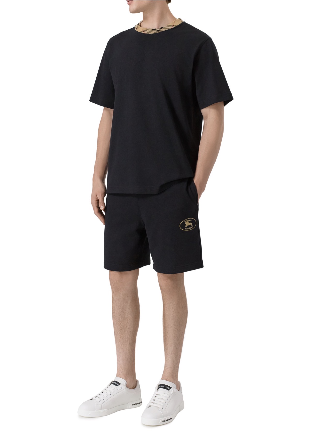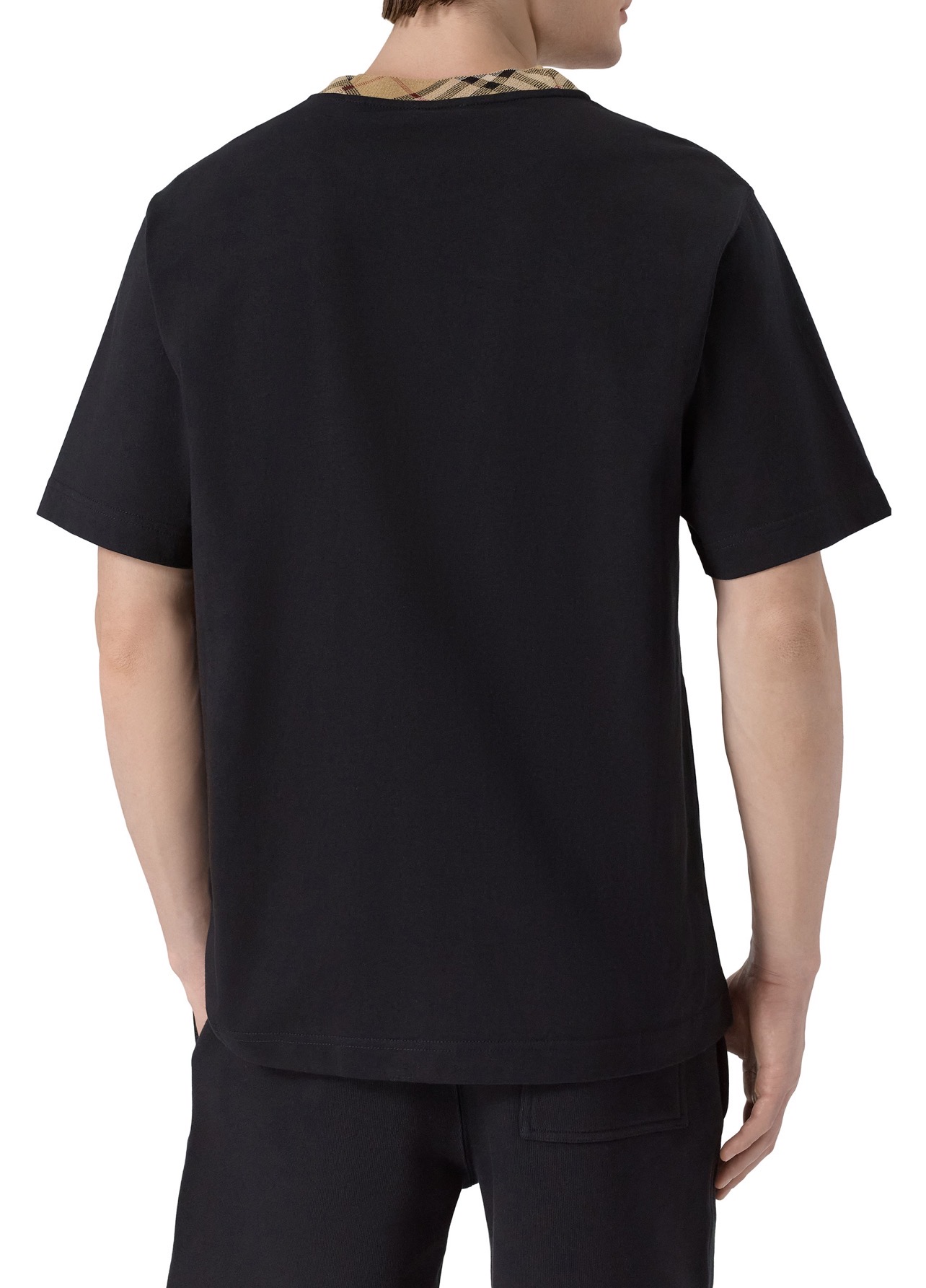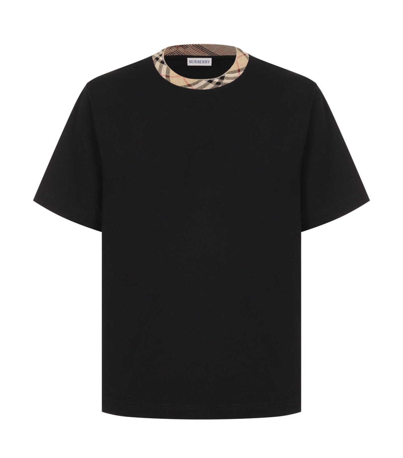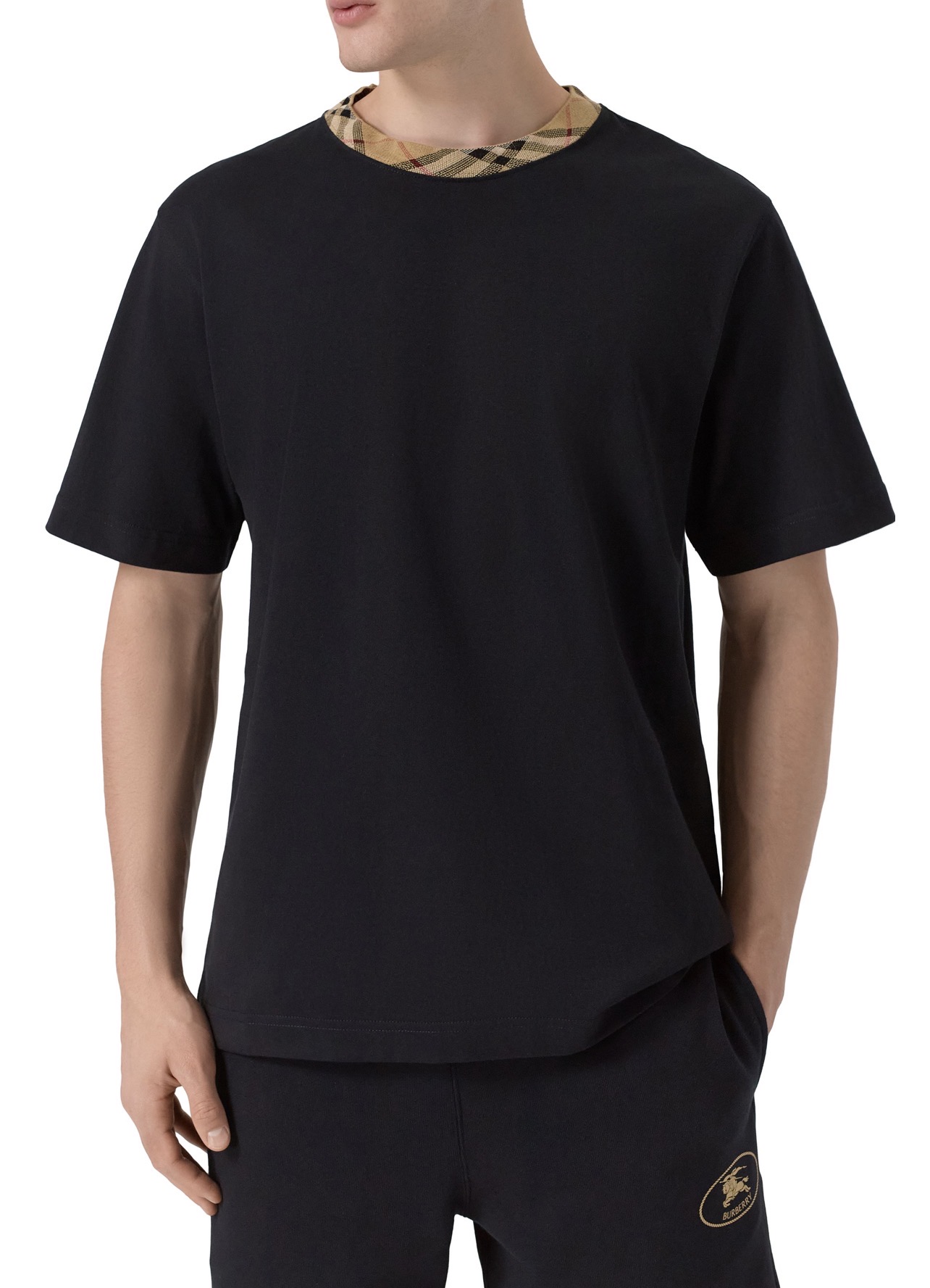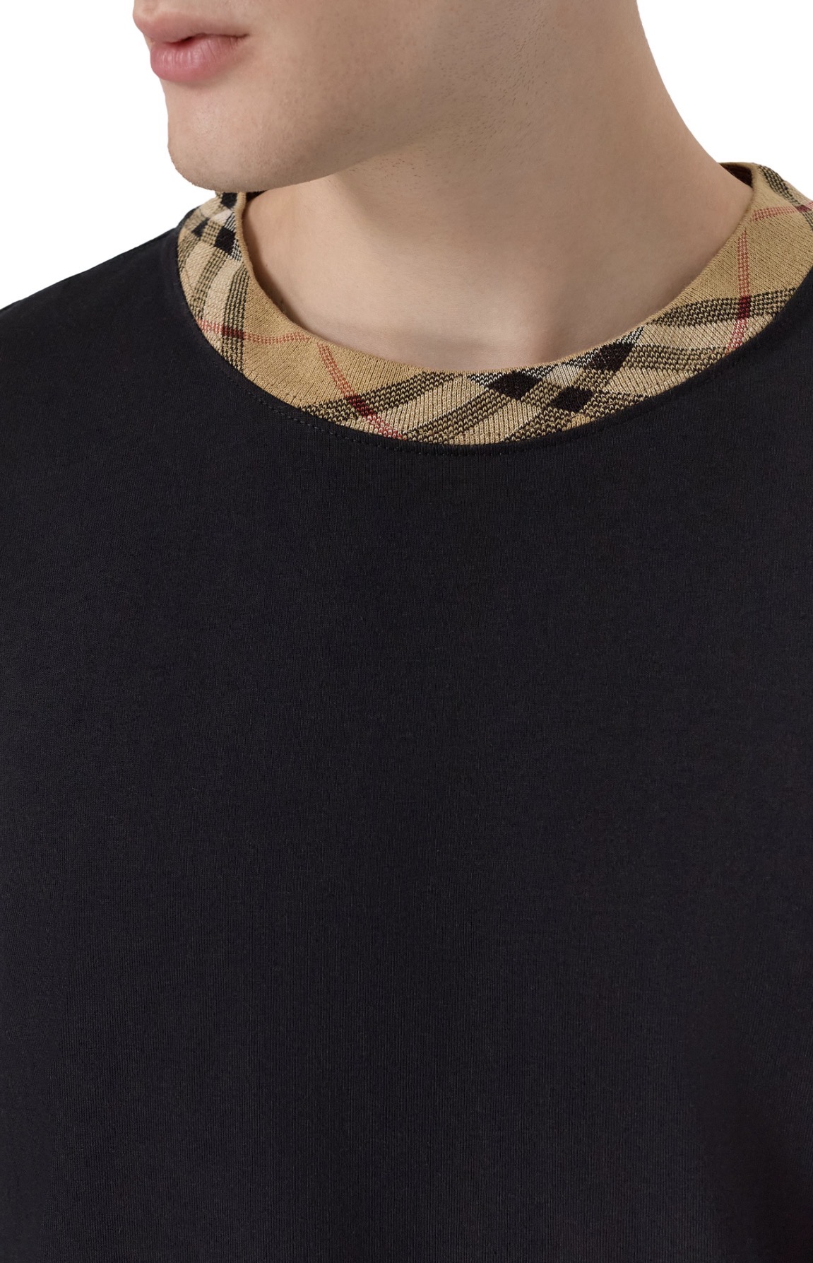 Для пошива базовой футболки использовали хлопковое джерси. Круглую горловину отделали кантом в фирменную клетку Burberry Check.