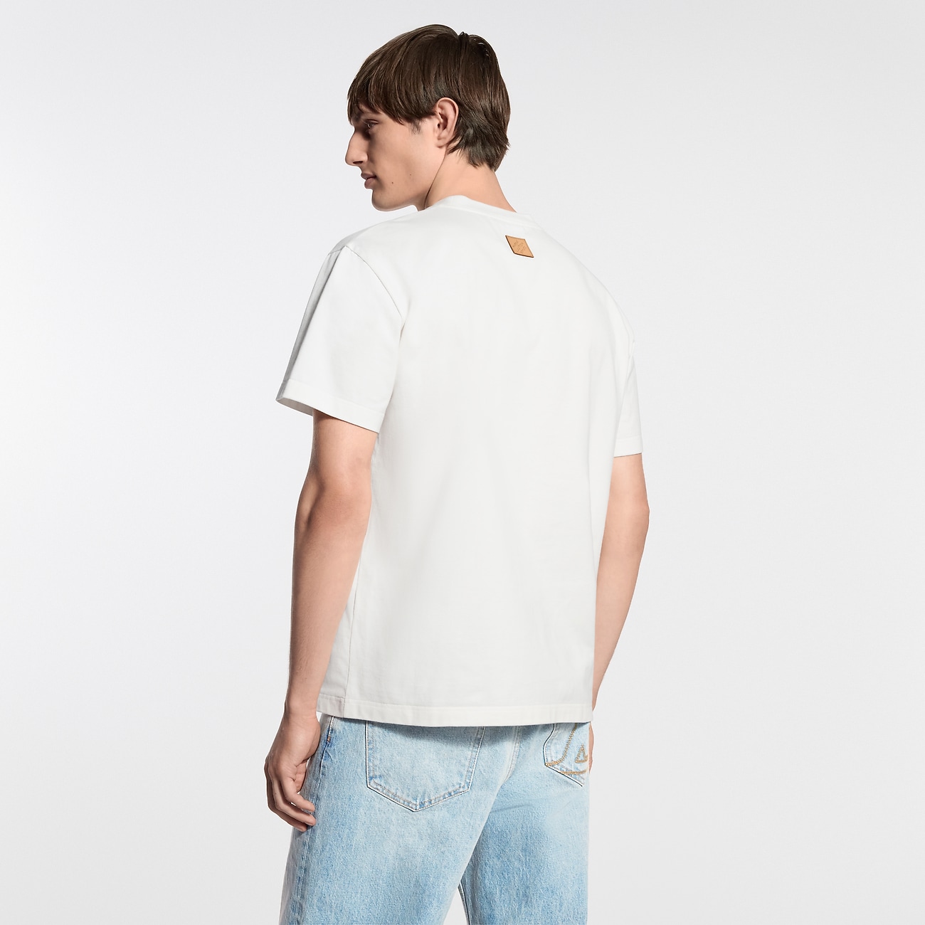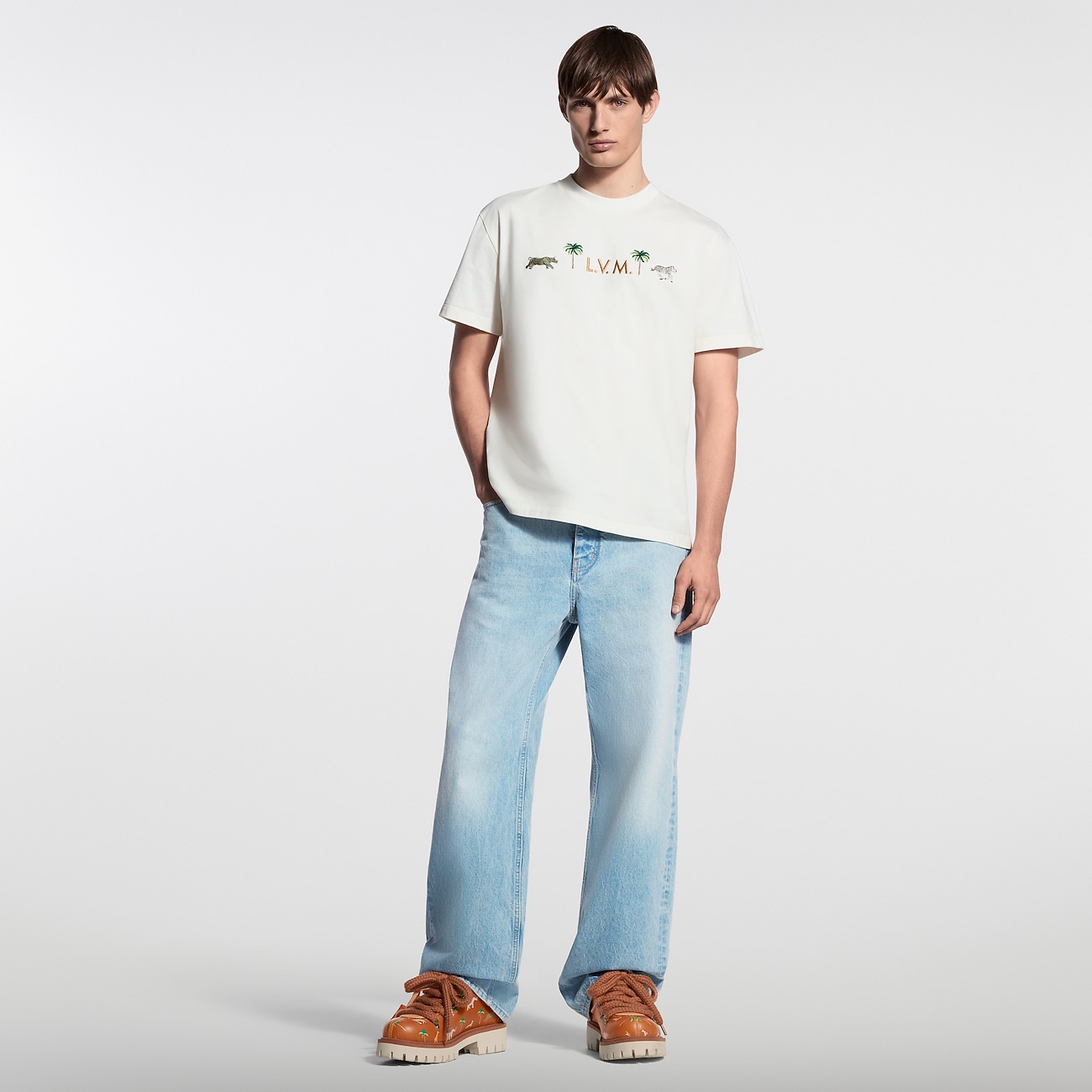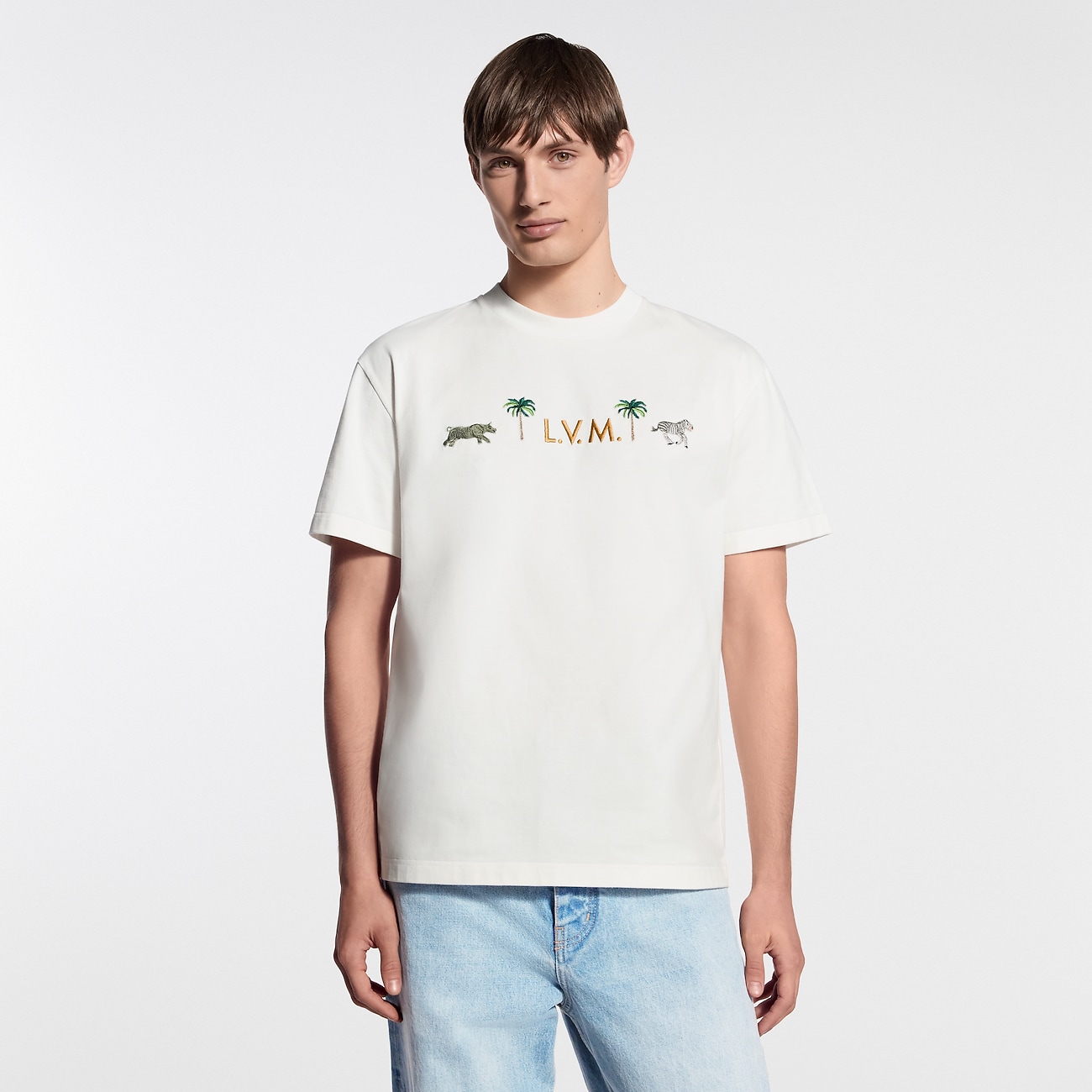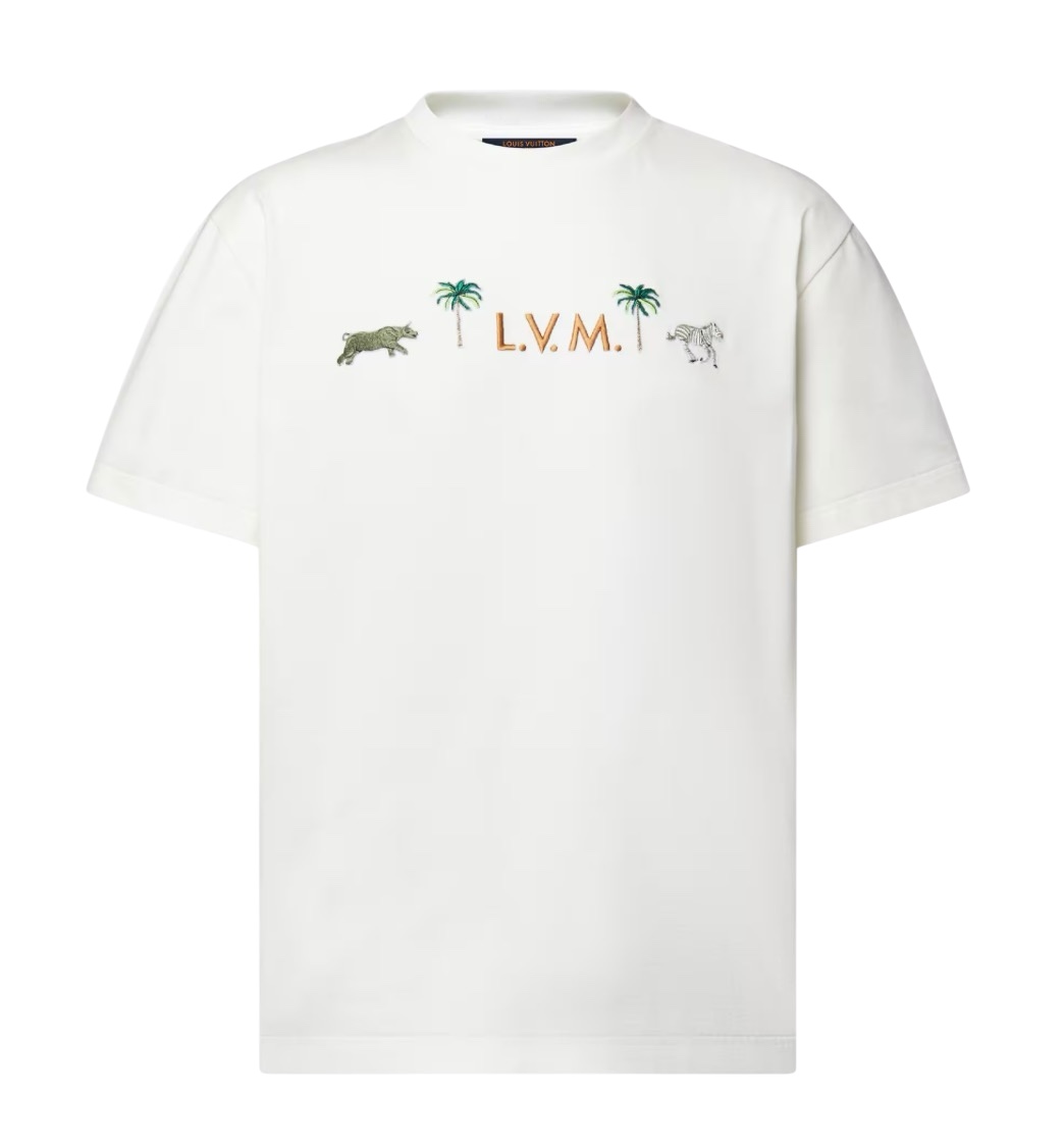 Этаклассическая футболкас круглым вырезом из молочно-белого органического хлопка украшен вышивкой с символикой показа весна-лето 2026. Объемная надпись LVM на груди, вдохновленная традиционными сундуками Дома, обрамлена замысловатыми пальмами и животными из мотива LV x The Darjeeling Limited.