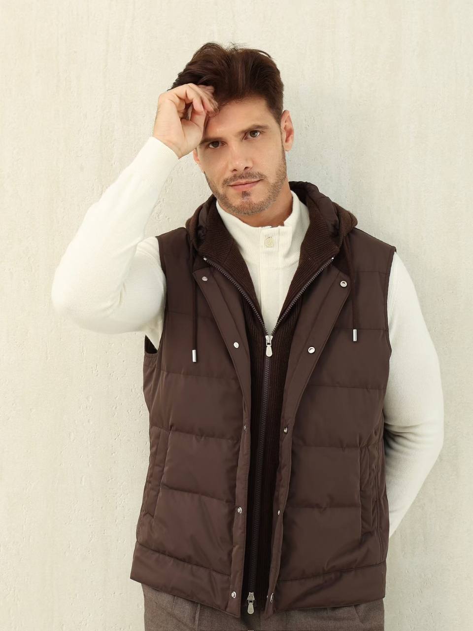 - На модели: размер M. Рост: 188 см. Параметры изделия для размера M: Куртка без рукавов. Обхват груди 114 см, длина изделия по спинке 65 см.