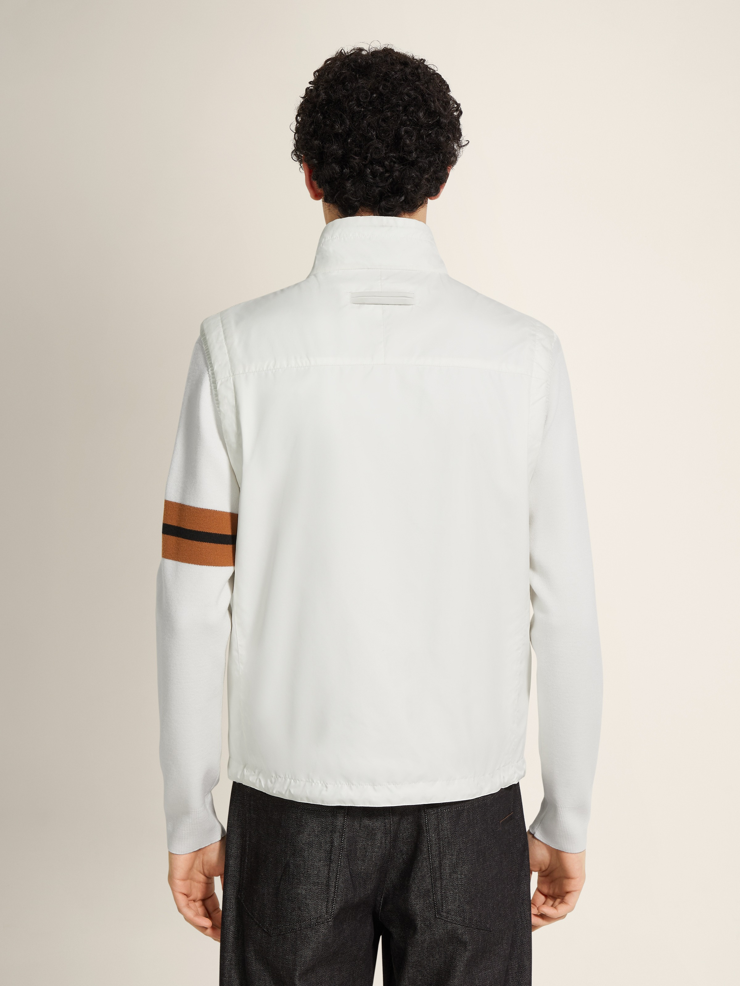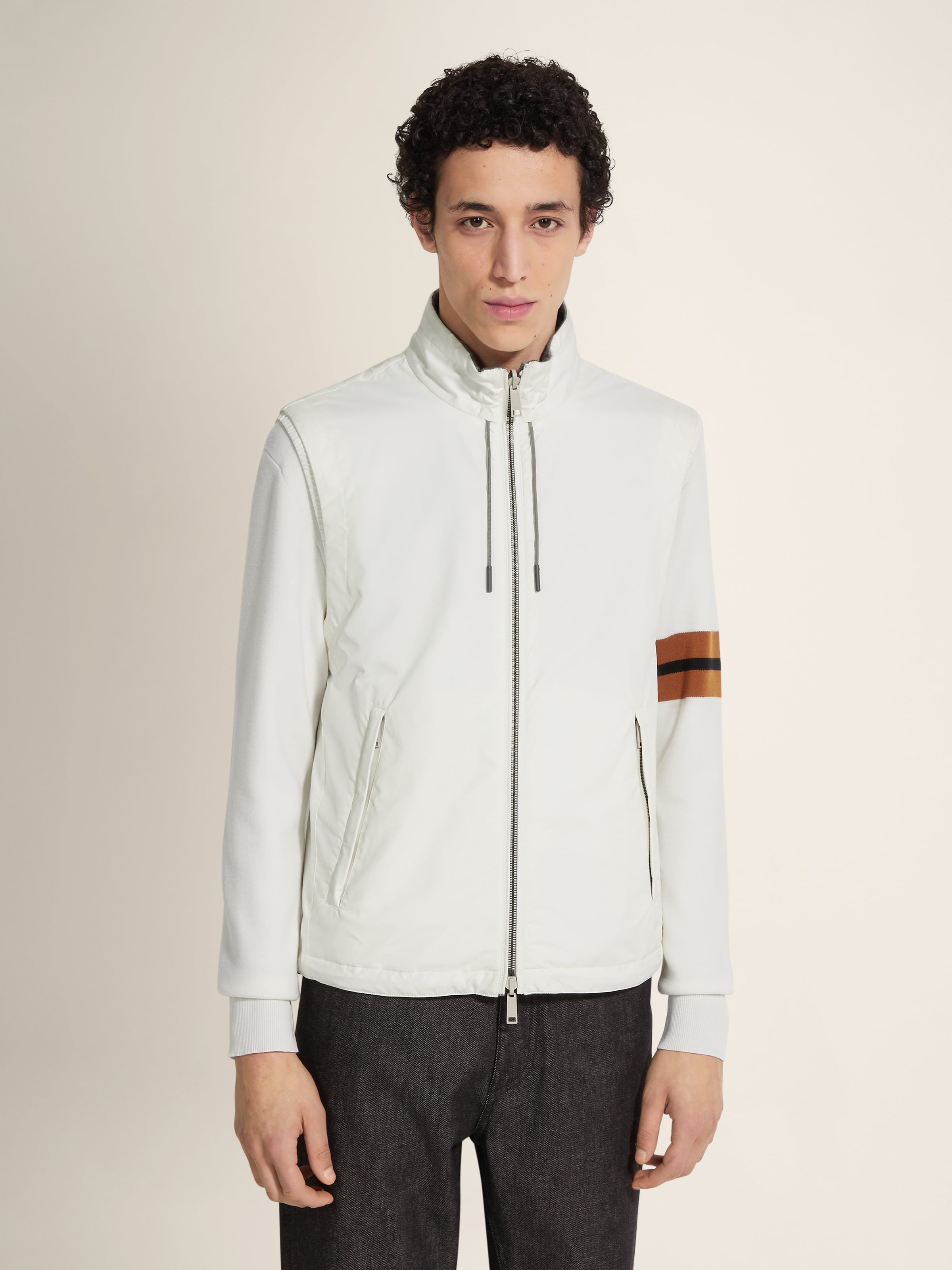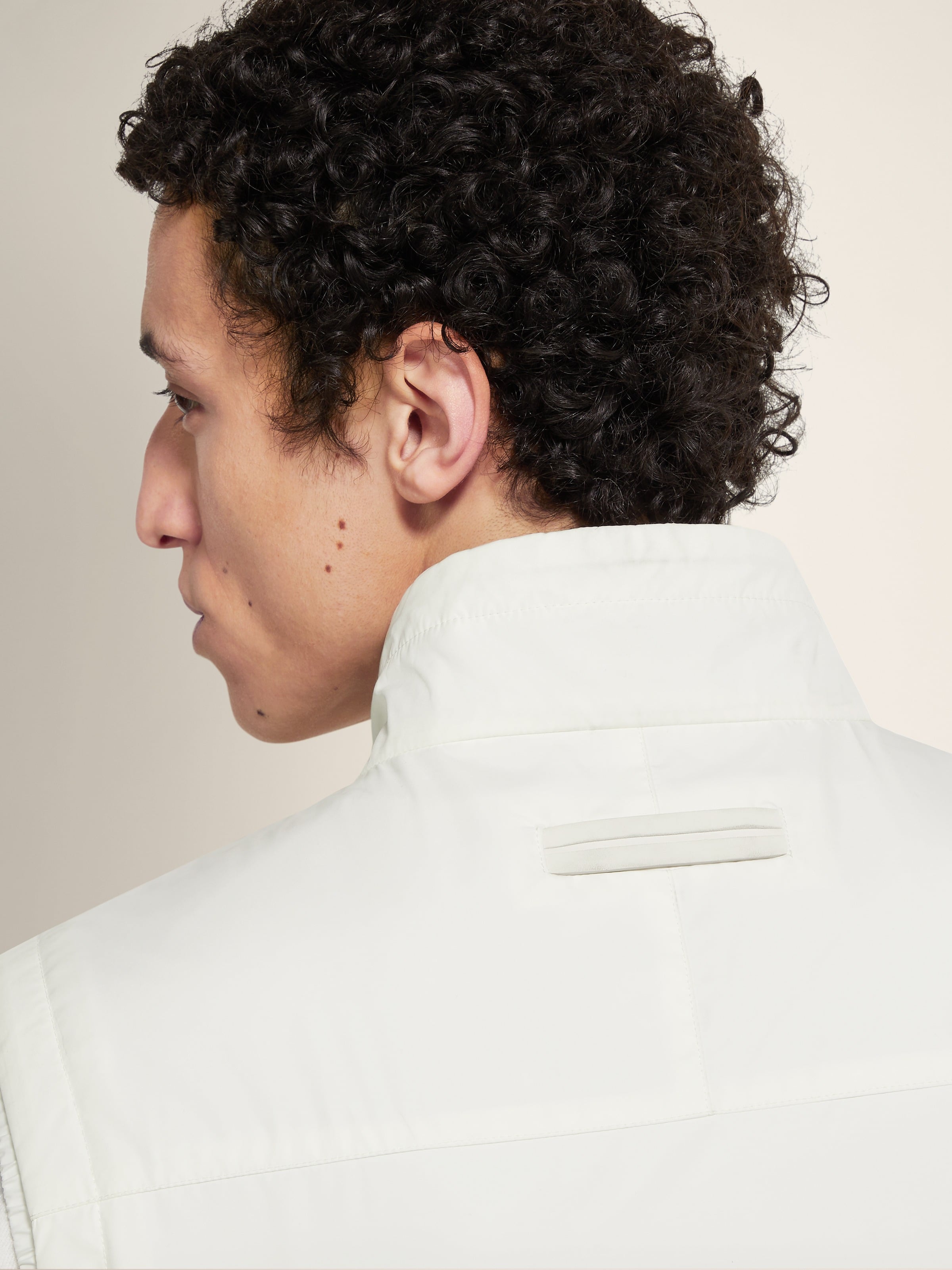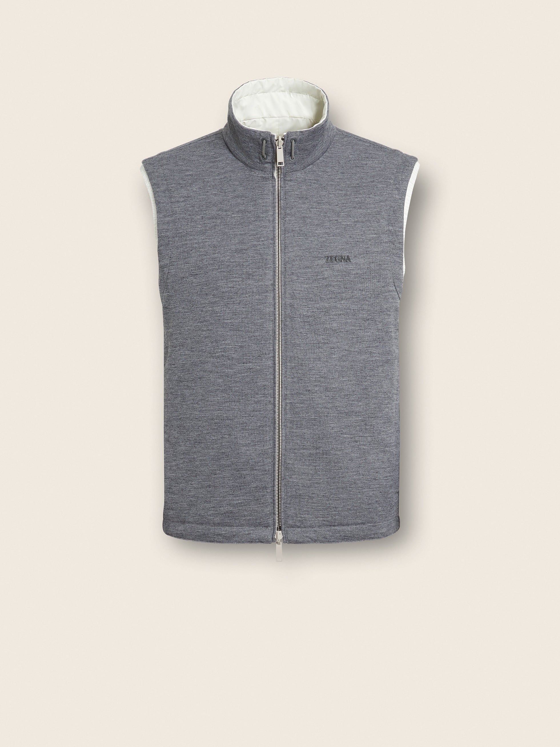 Двусторонняя жилетка белого и серого цвета легкая и удобная. Жилетка с воротником-стойкой и регулируемым низом обеспечивает идеальную посадку. Элегантные цвета дополнены кожаным шнурком для придания дополнительного стиля.