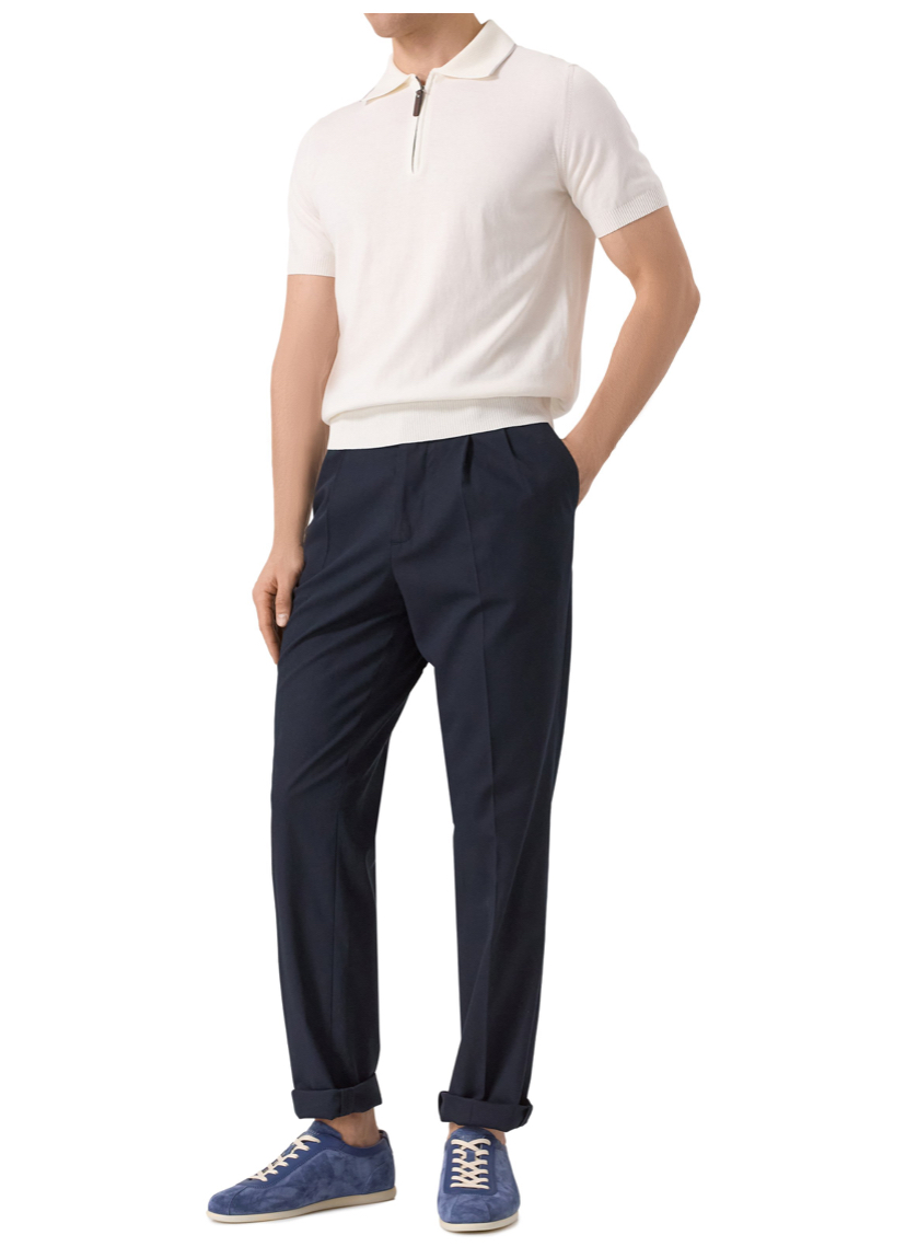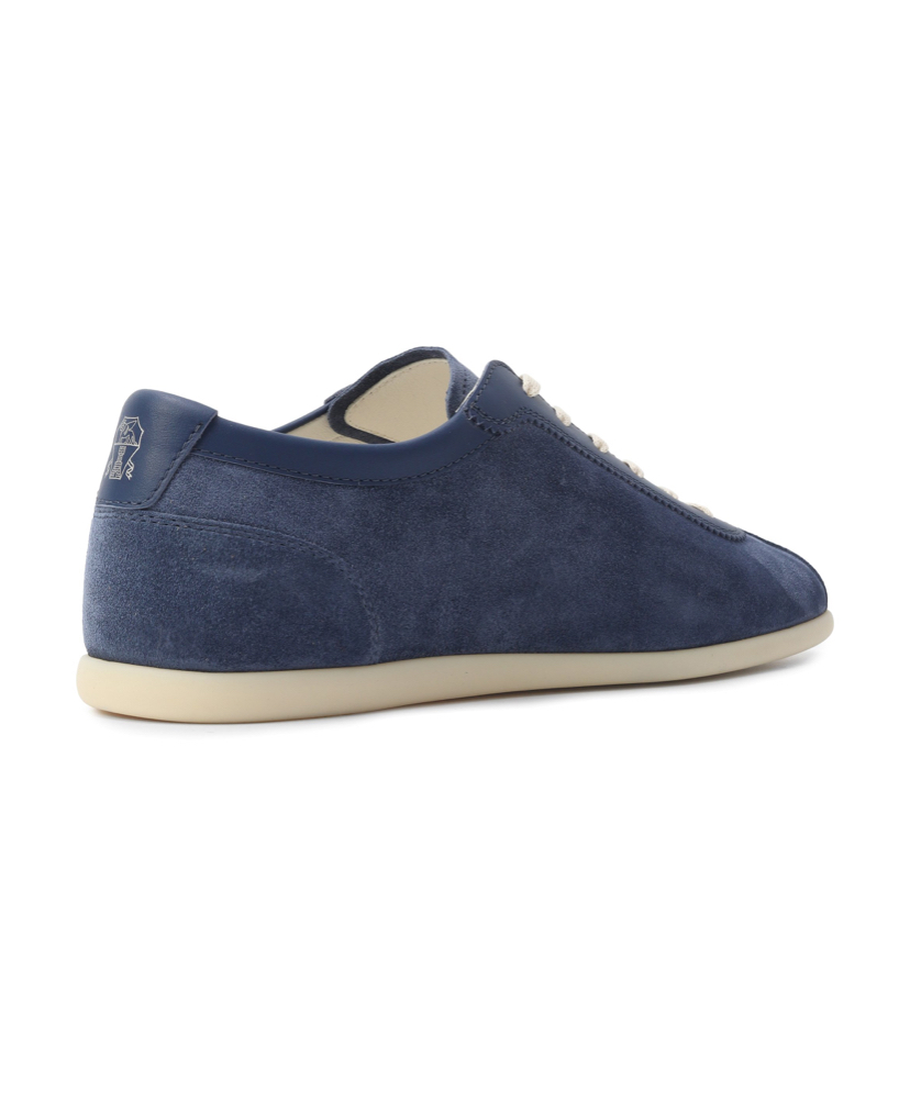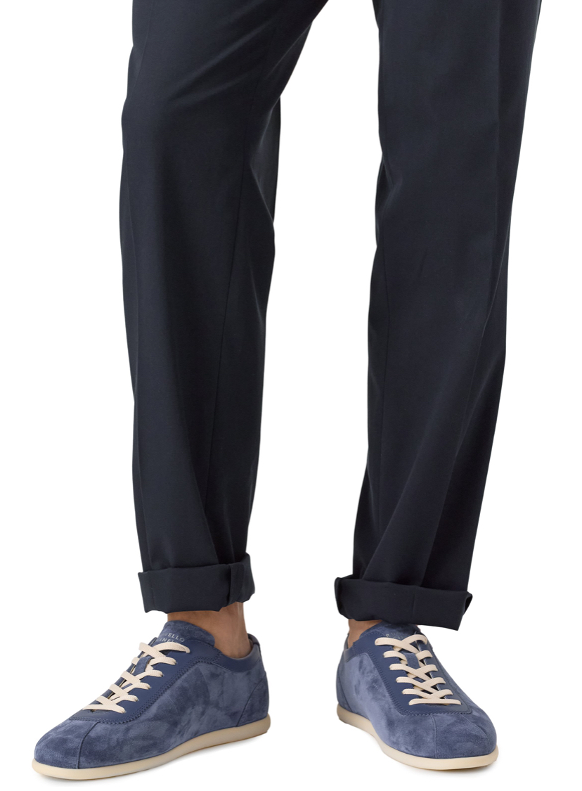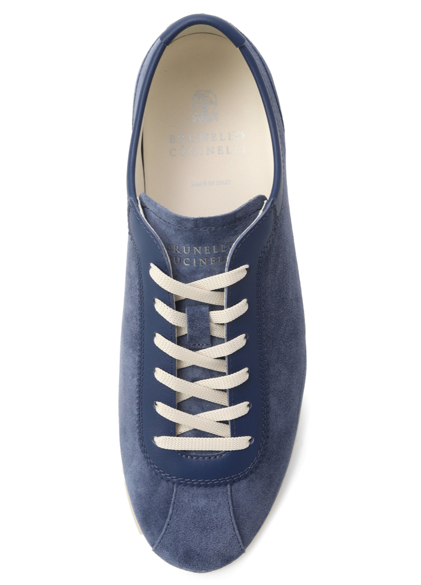 Кеды из стираной замши отделаны гладкой кожей в тон вдоль шнуровки и на вырезе. Язычок украшен логотипом марки, а задник – фирменной эмблемой Solomeo.