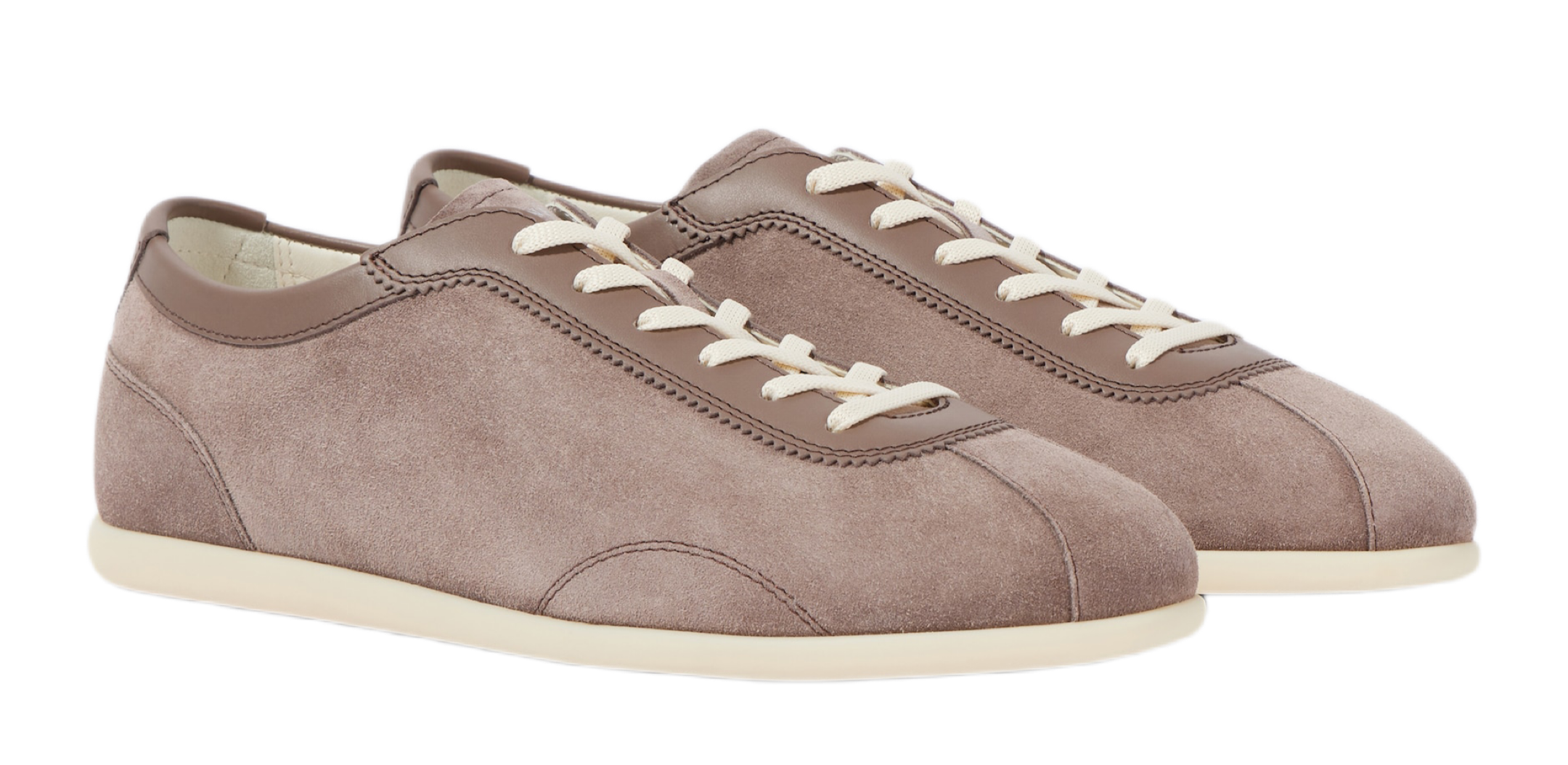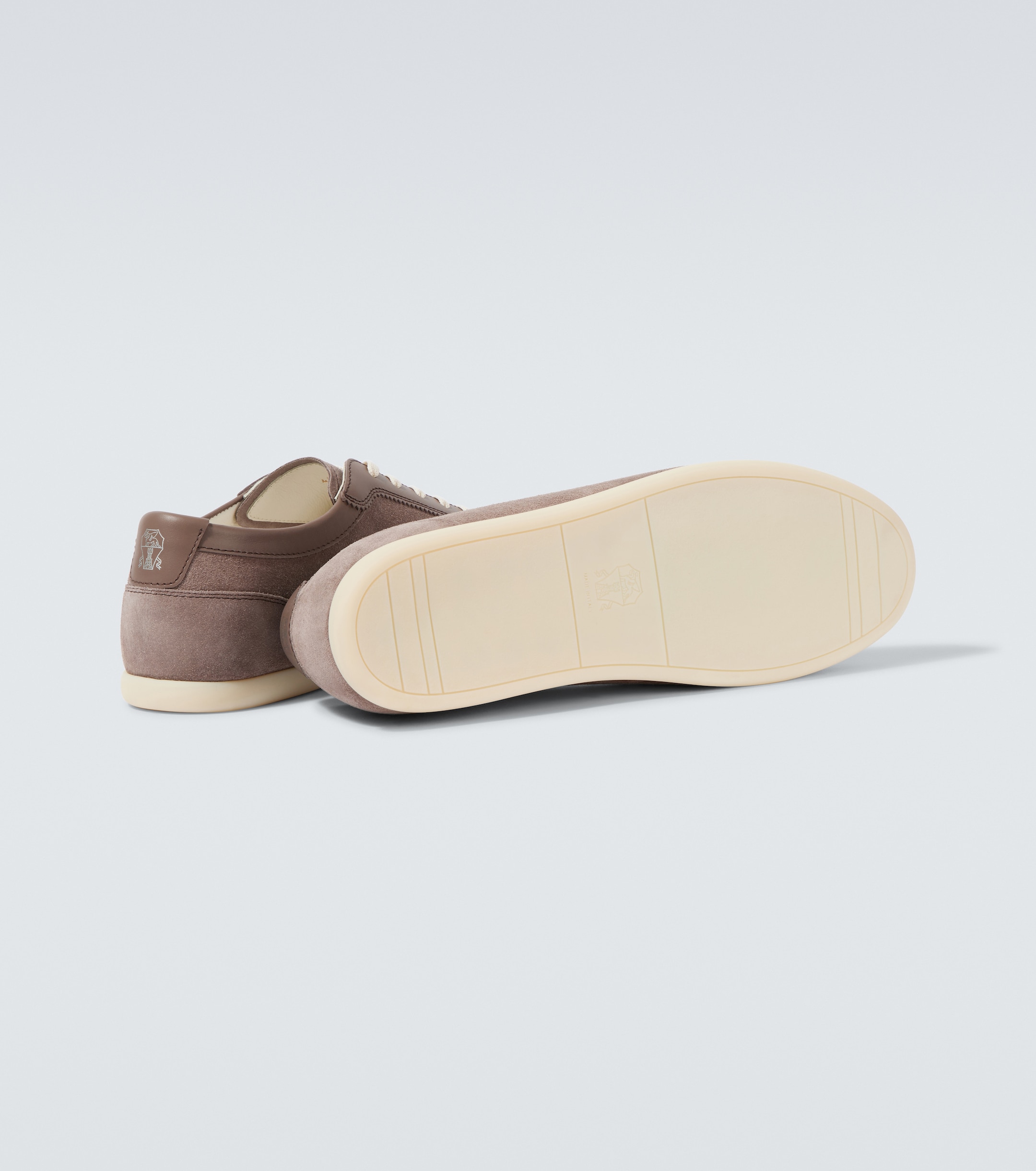 Кеды из стираной замши отделаны гладкой кожей в тон вдоль шнуровки и на вырезе. Язычок украшен логотипом марки, а задник – фирменной эмблемой Solomeo.