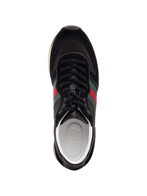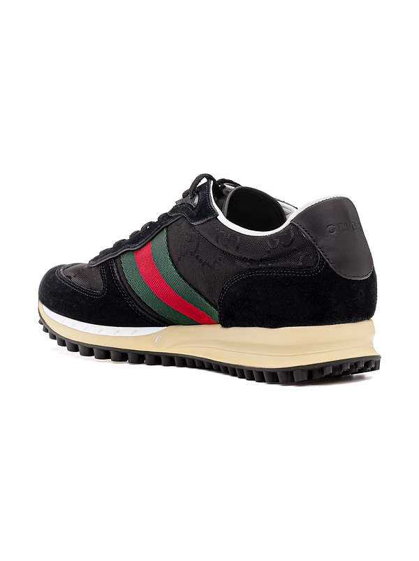 Кроссовки из текстиля и замши с монограммой GG. Закругленный носок, шнуровка спереди, логотип бренда на язычке, фирменная лента Web по бокам, регулируемый ремешок на щиколотке, тисненый логотип бренда сзади и на подъеме, ребристая подошва.
