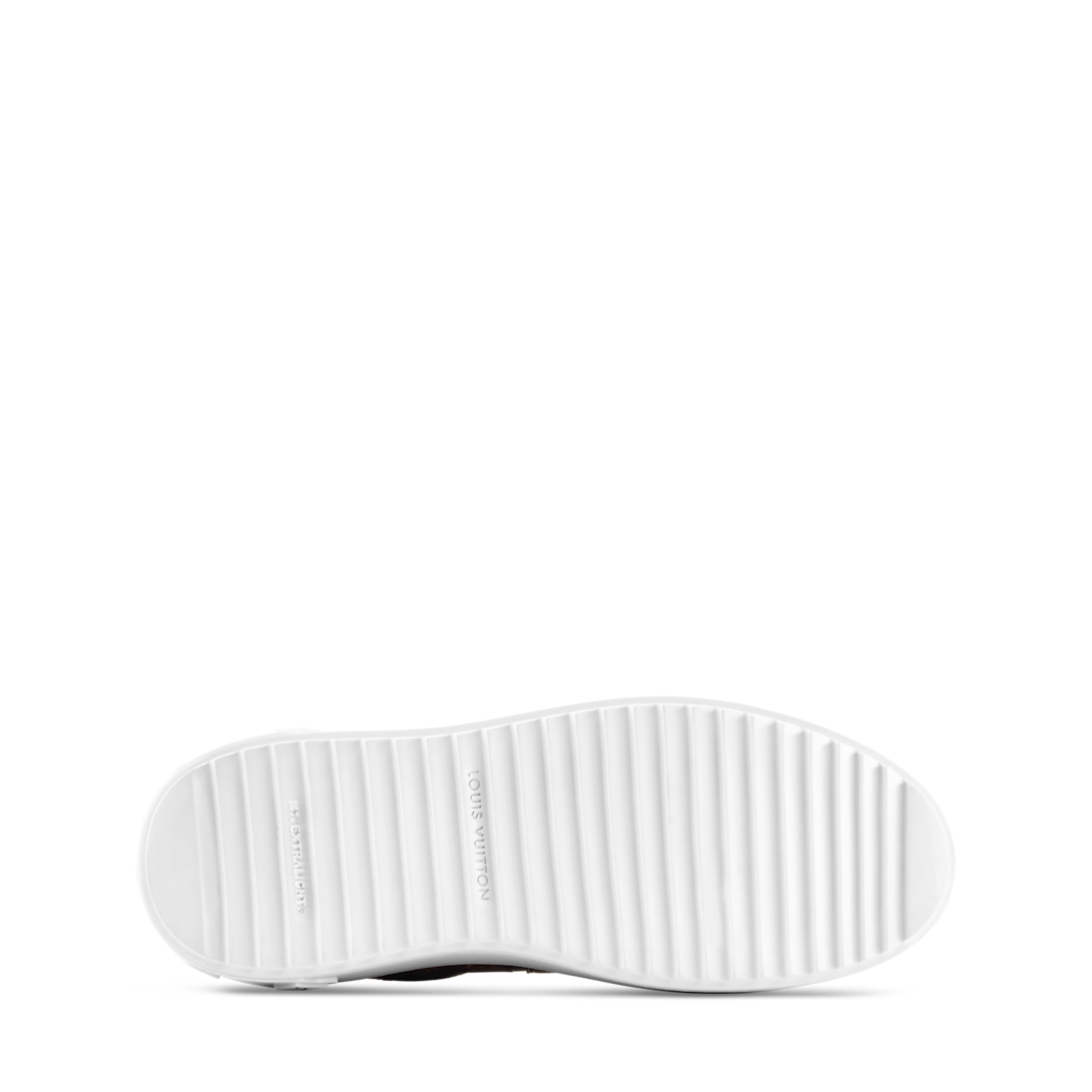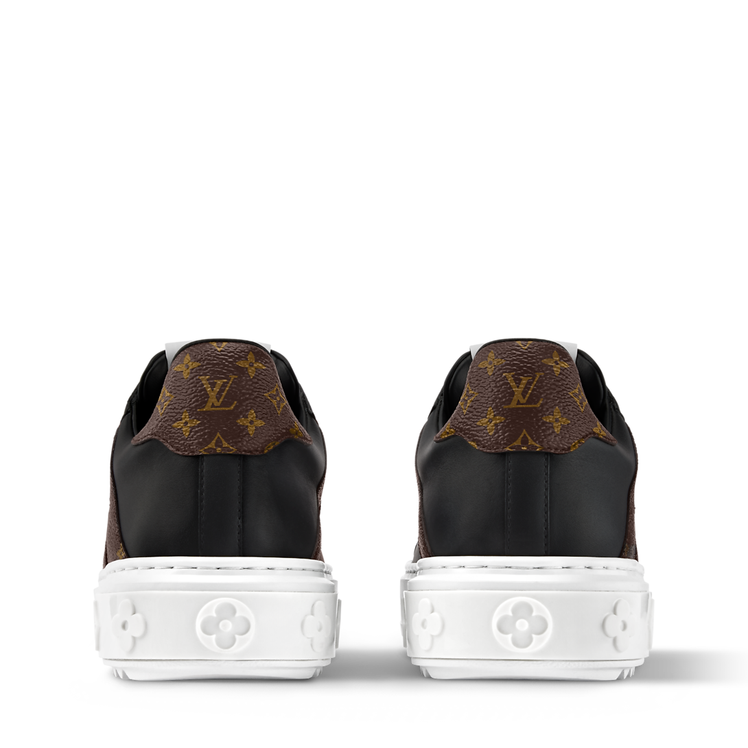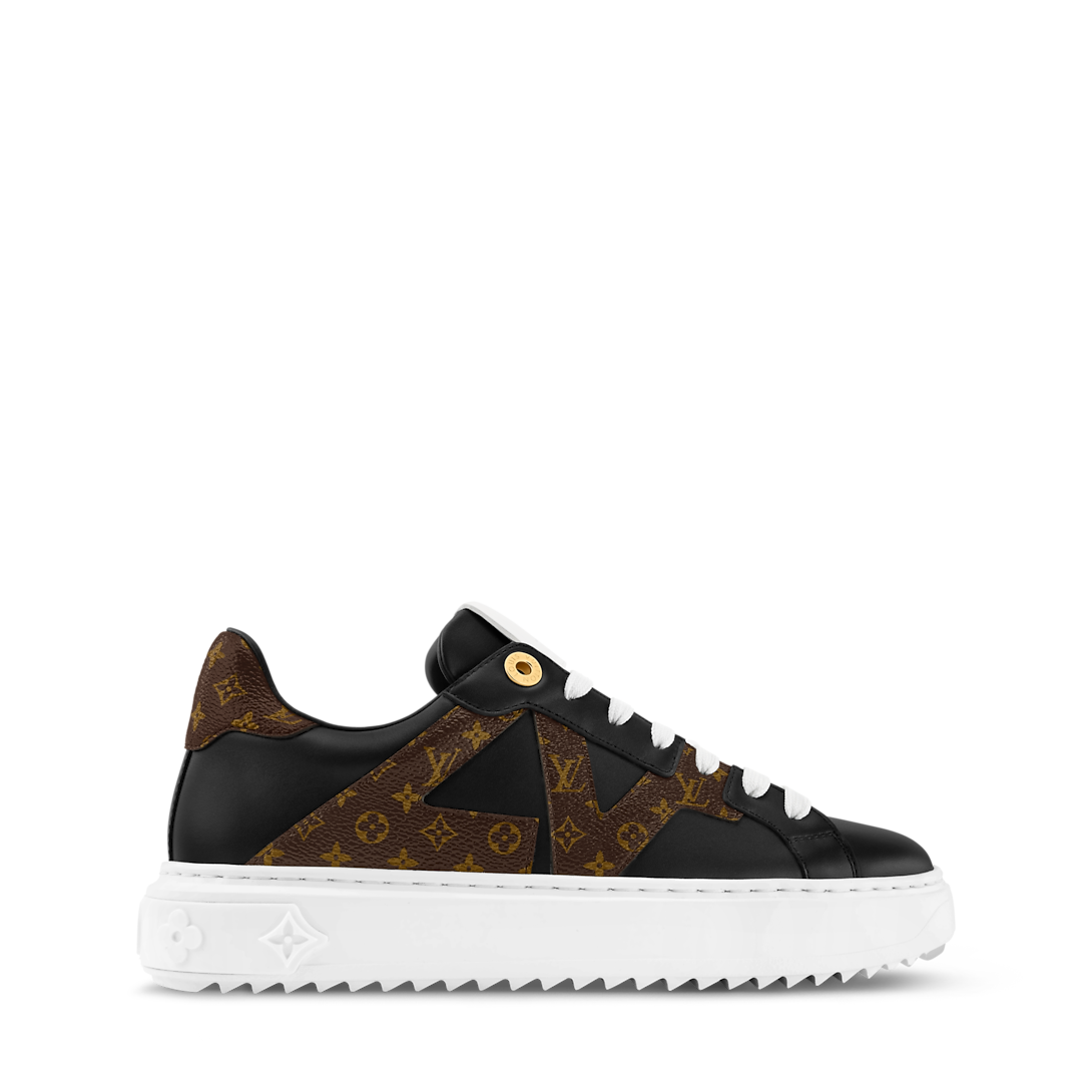 Эта сезонная версия классических кроссовок Time Out выполнена из гладкой телячьей кожи с отделкой из культового канваса Monogram, особенно выделяется динамичная надпись LV сбоку. Отличительной чертой этой модели является приподнятая подошва из легкого материала EVA, украшенная тремя цветами Monogram. На язычке нанесена этикетка с инициалами LV.