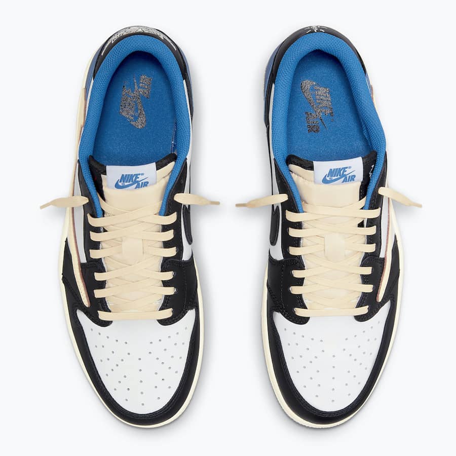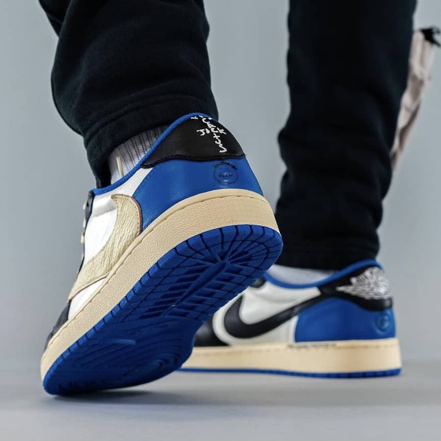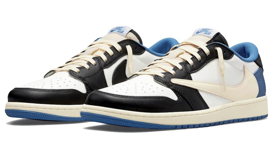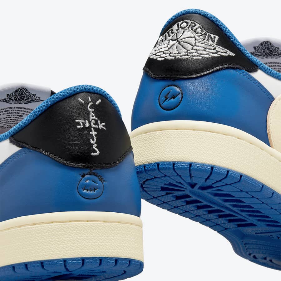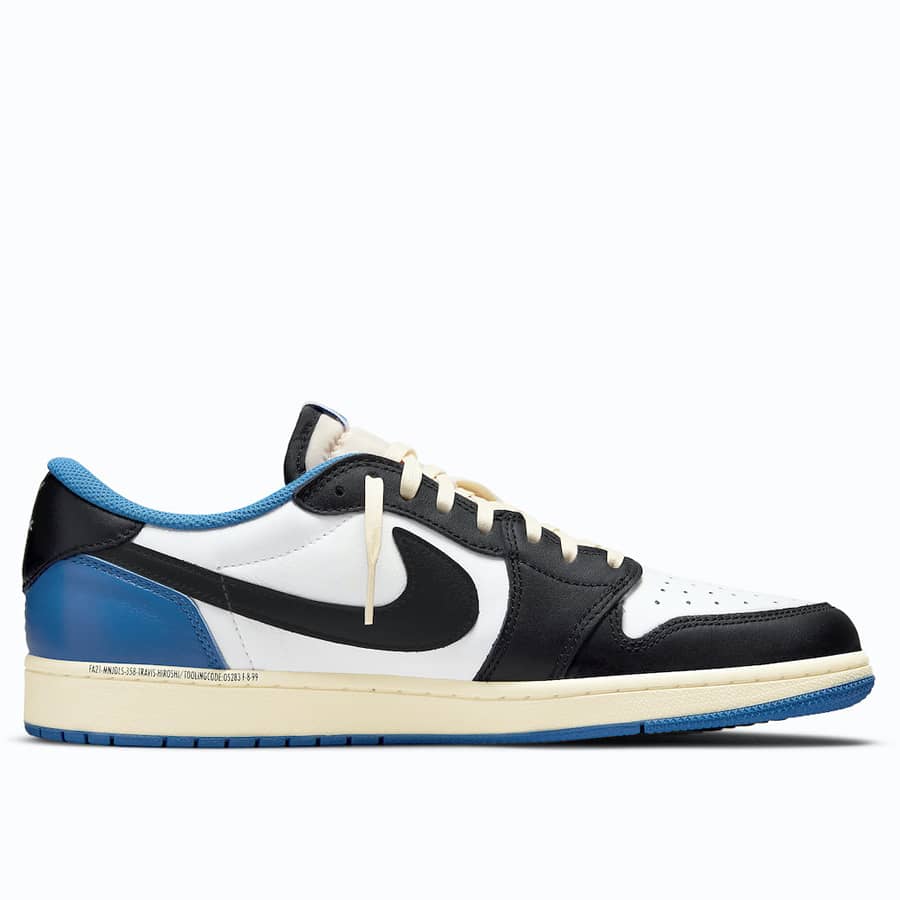 Travis Scott x Fragment x Air Jordan 1 Low OG — это трехстороннее сотрудничество между звездой хип-хопа, японским брендом уличной одежды и Джорданом в итерации первой фирменной обуви Майкла Джордана с низким верхом. В дополнение к Air Jordan 1 High OG, кроссовки Jordan 1 Low OG, разработанные Трэвисом Скоттом и Хироши Фудзивара, сочетают в себе исключительную эстетику рэпера и модельера с прогрессивным дизайном баскетбольных кроссовок в стиле ретро. Кожа паруса появляется на перфорированном мыске и средней панели. Контрастная черная мятая кожа украшает носок, переднюю часть стопы и люверсы. Двухцветный бело-черный цветовой блок имитирует цветовую гамму оригинальной расцветки Air Jordan 1 «Black Toe». Большой кремовый кожаный логотип Swoosh — дань стилю первой коллаборации Скотта с Air Jordan 1 2019 года. Двойная вышивка «Кактус Джек» и «Крылья» появляются на пятке левой и правой обуви соответственно. Кроме того, мотив «лица» Скотта и изображение «молнии» Фрагмента также выбиты на левом и правом ботинке соответственно. Классический логотип Nike Air напечатан синим цветом на белой нейлоновой язычковой бирке. Travis Scott x Fragment x Air Jordan 1 High OG «Military Blue» — один из самых желанных кроссовок этого года.