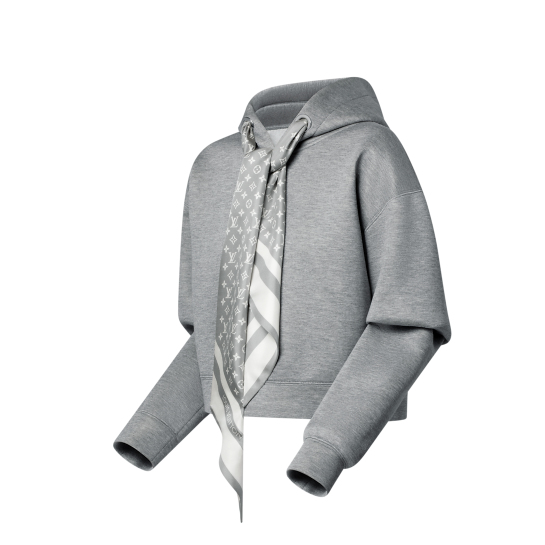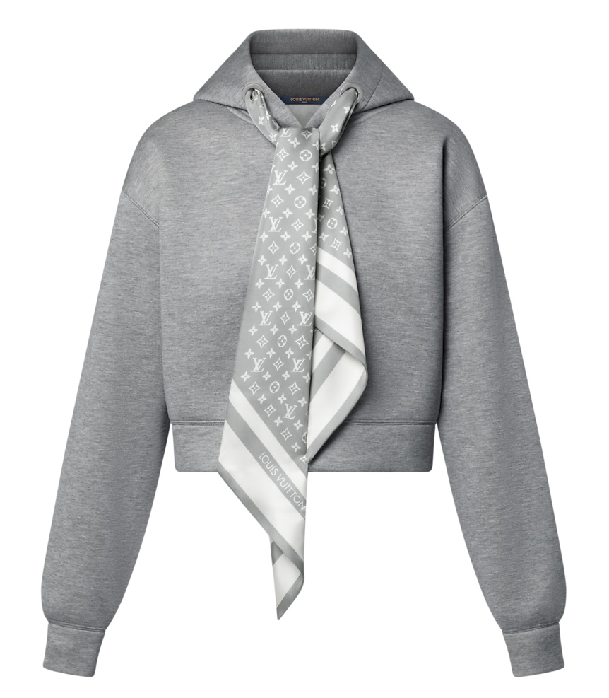 Шикарные подиумные логотипы игриво переосмысливают эту базовую модель худи. Она выполнена в удобном укороченном крое из уютного двустороннего джерси с непринужденной меланжевой отделкой. Просторный капюшон украшен тональной биркой Louis Vuitton, а вырез украшен элегантными завязками с монограммой, создающими эффект шелкового шарфа.
