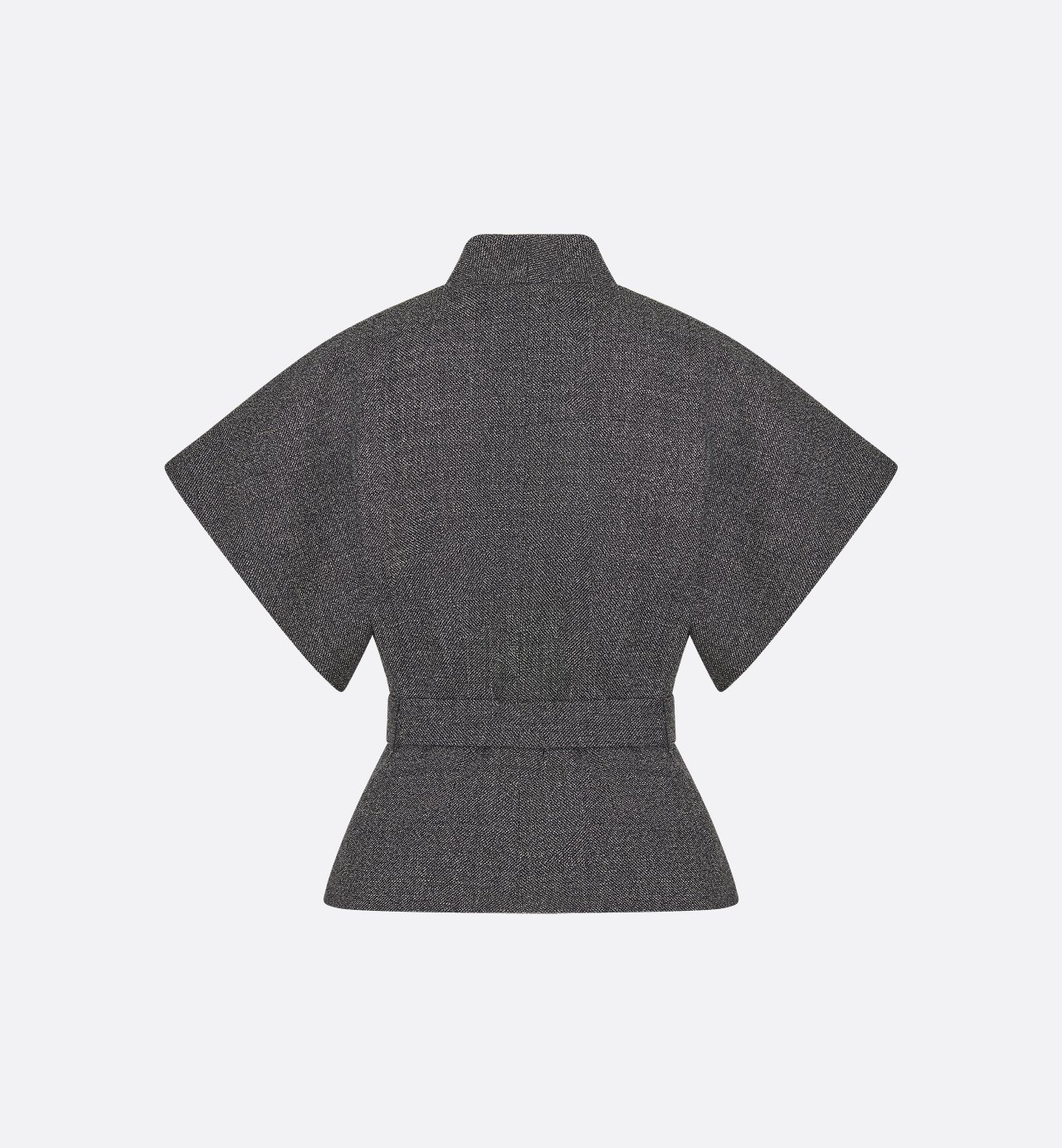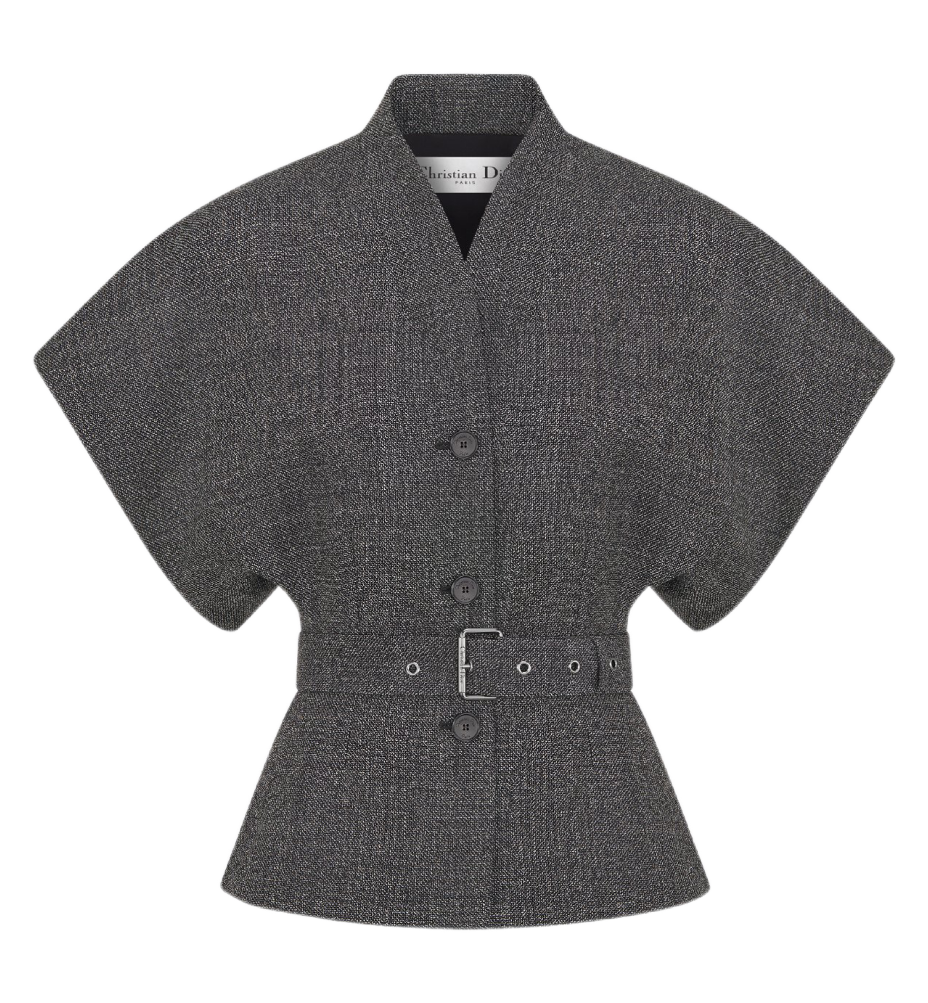 Жакет – это элегантное и современное творение. Изготовленный из серого твида из натуральной шерсти, он имеет укороченный силуэт, усиленный короткими широкими рукавами и воротником без отворотов, вдохновленным архивами House. Завершенный тональным поясом, изящно подчеркивающим талию, куртка может сочетаться с одной из сезонных юбок для кутюрного образа.