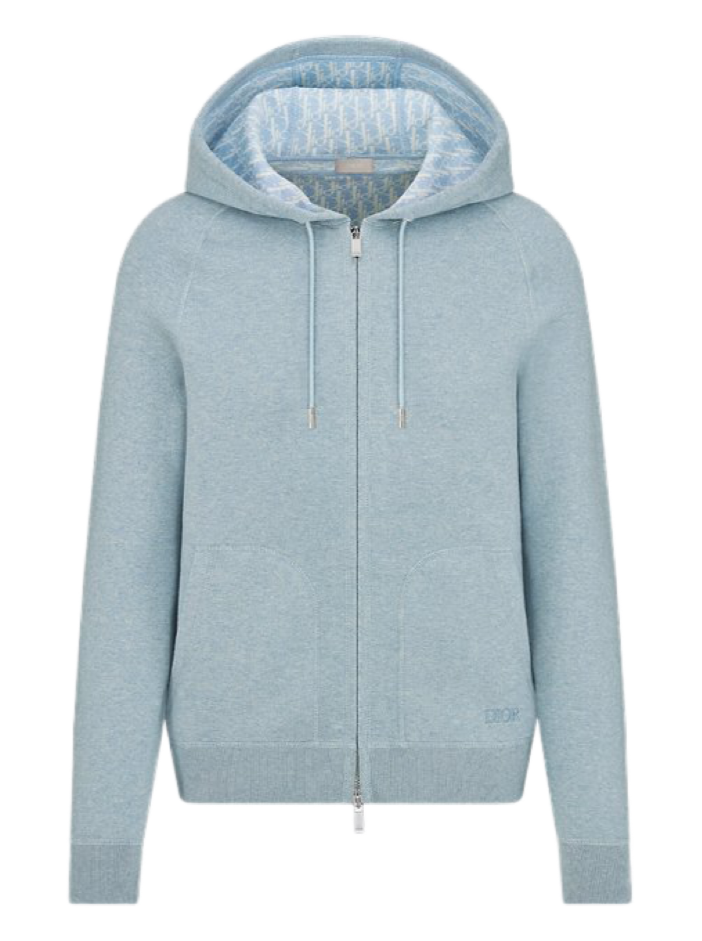 Спортивная куртка с капюшоном представляет собой новую изысканную версию незаменимого предмета гардероба, выполненную из темно-синего трикотажа на основе хлопка и кашемира. Модель с капюшоном, застежкой-молнией и рукавом реглан отличается вышивкой Dior спереди и сплошным жаккардовым мотивом Dior Oblique на внутренней стороне. Куртку можно сочетать со спортивными брюками в той же гамме.