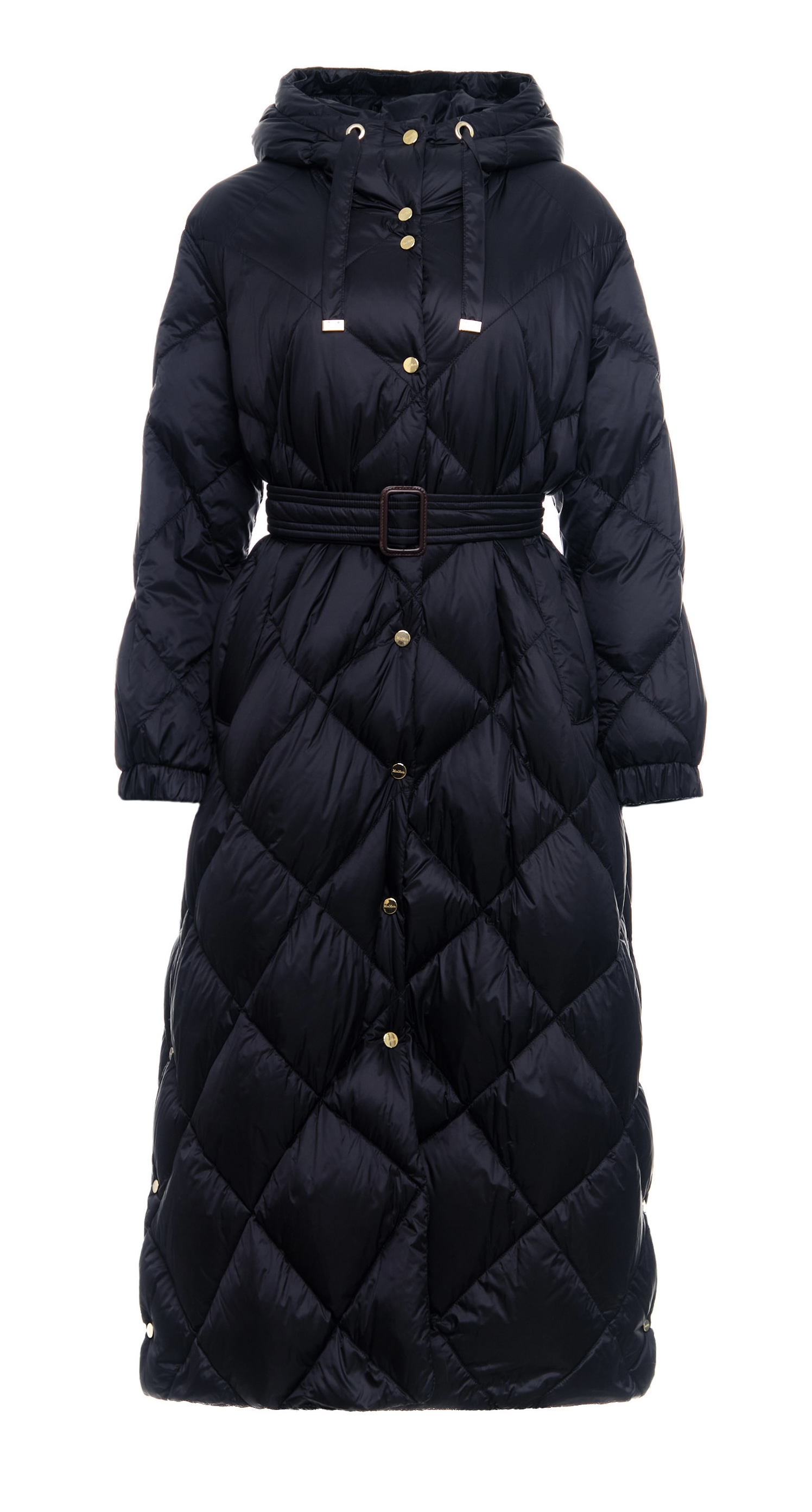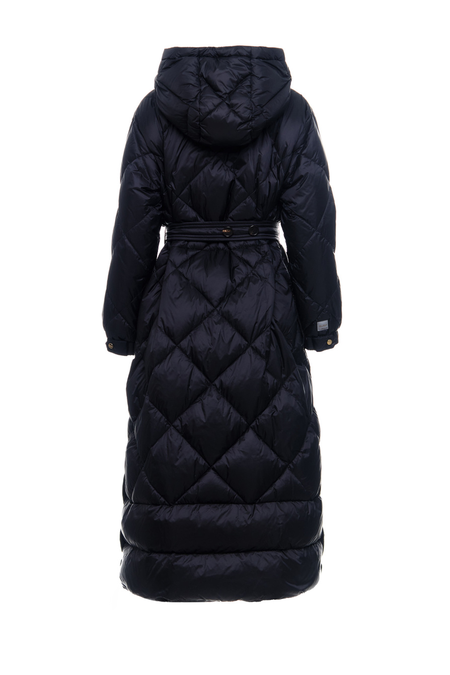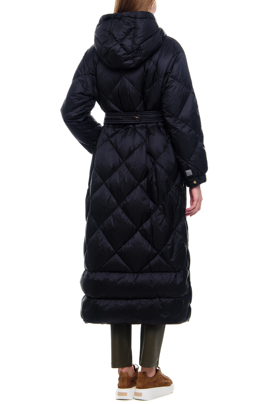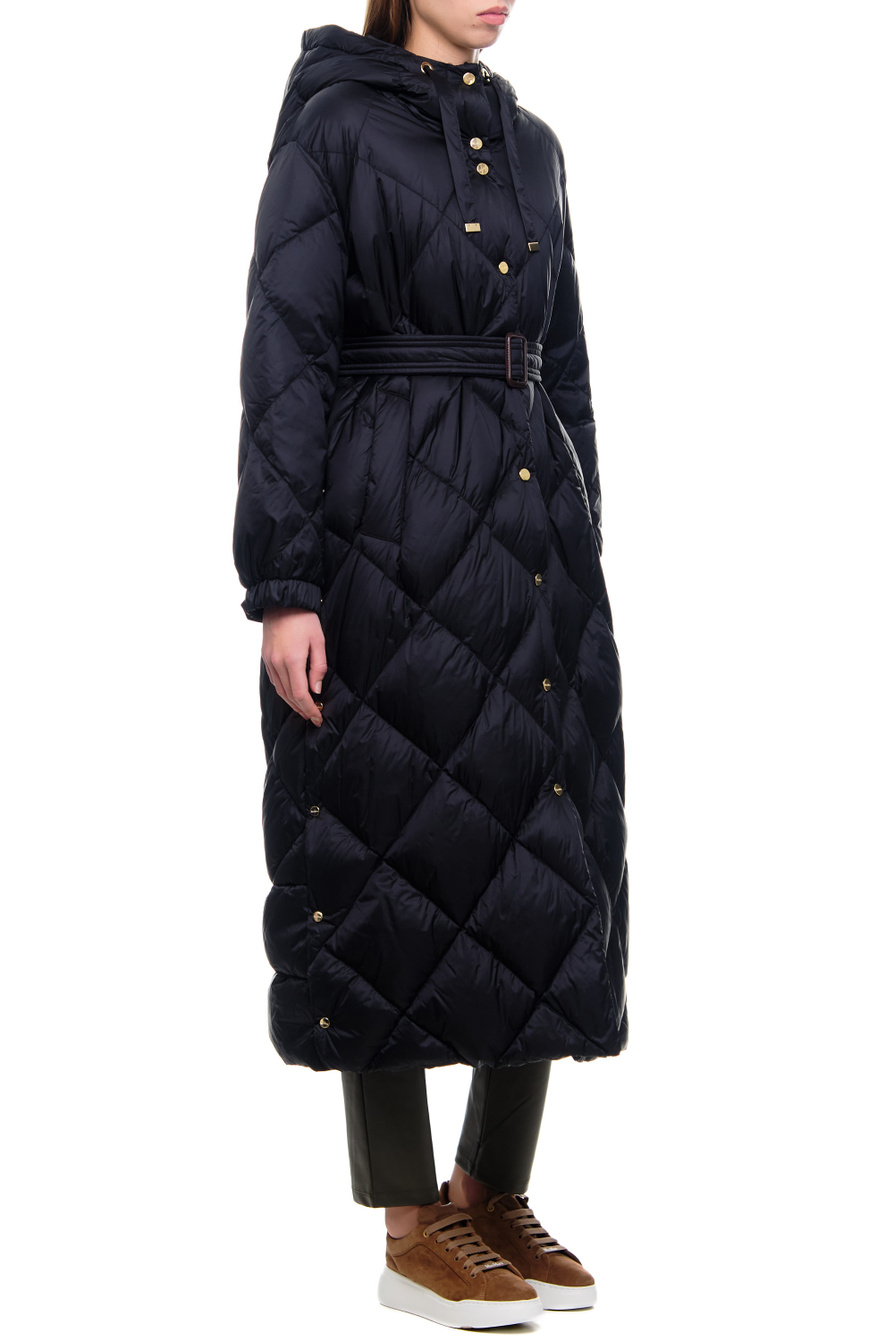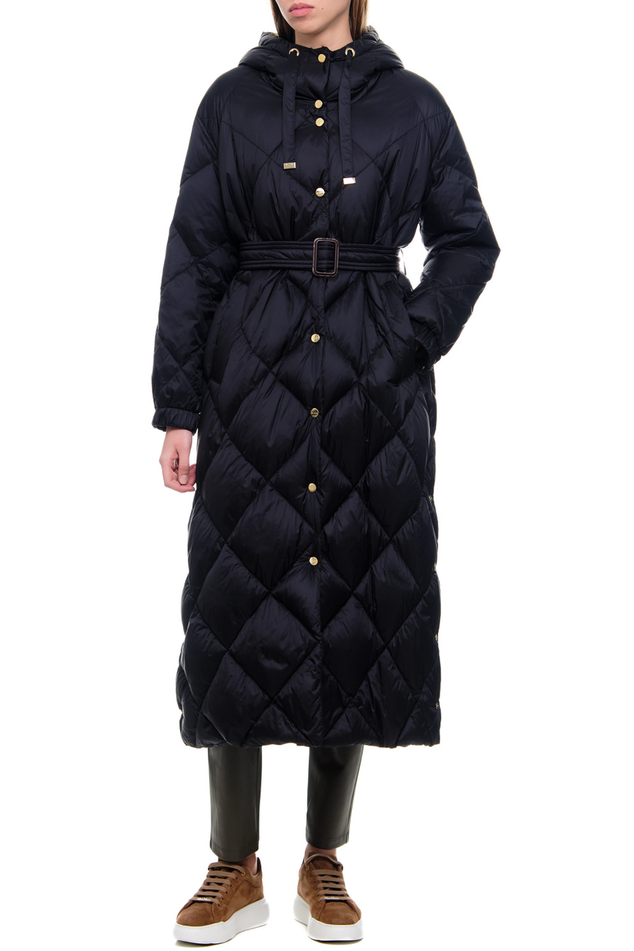 Стеганое пальто TREPA из коллекции MAX MARA. Модель прямого кроя с воротником-стойкой, капюшоном на кулиске и длинными рукавами с манжетами дополнена поясом в тон, подчеркивающим талию. Изделие выполнено из водоотталкивающего и ветронепродуваемого нейлона с наполнителем из натурального пуха и пера.