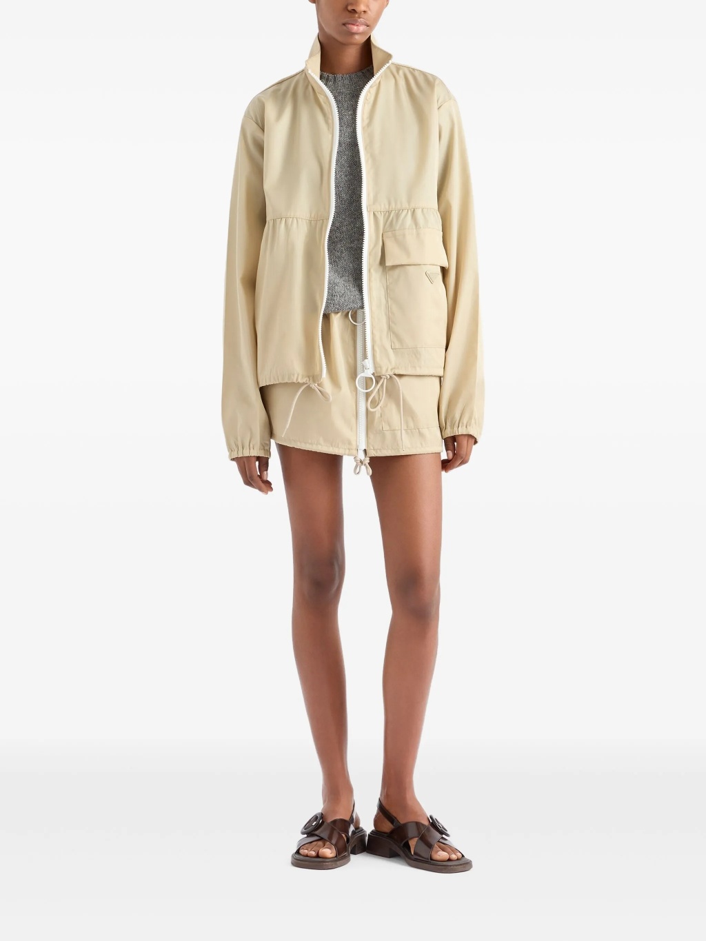 Бежевый бомбер из переработанного нейлона с застежкой-молнией спереди, эмалевым треугольным логотипом, накладным карманом, длинными рукавами и регулируемым низом на кулиске