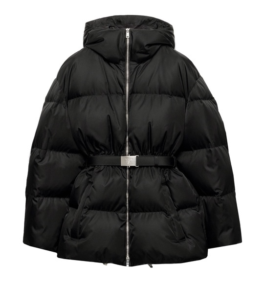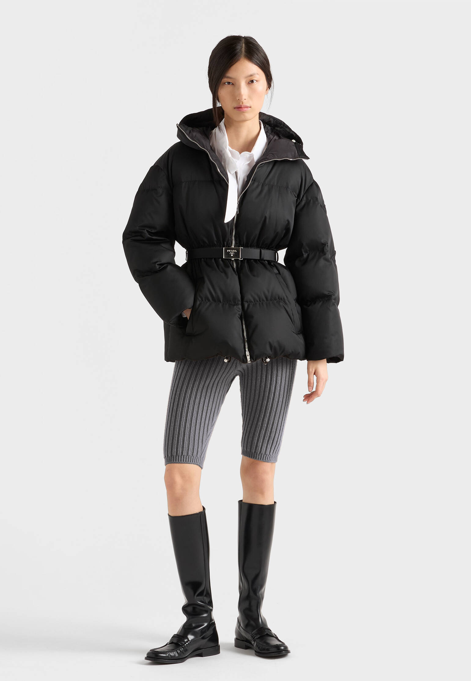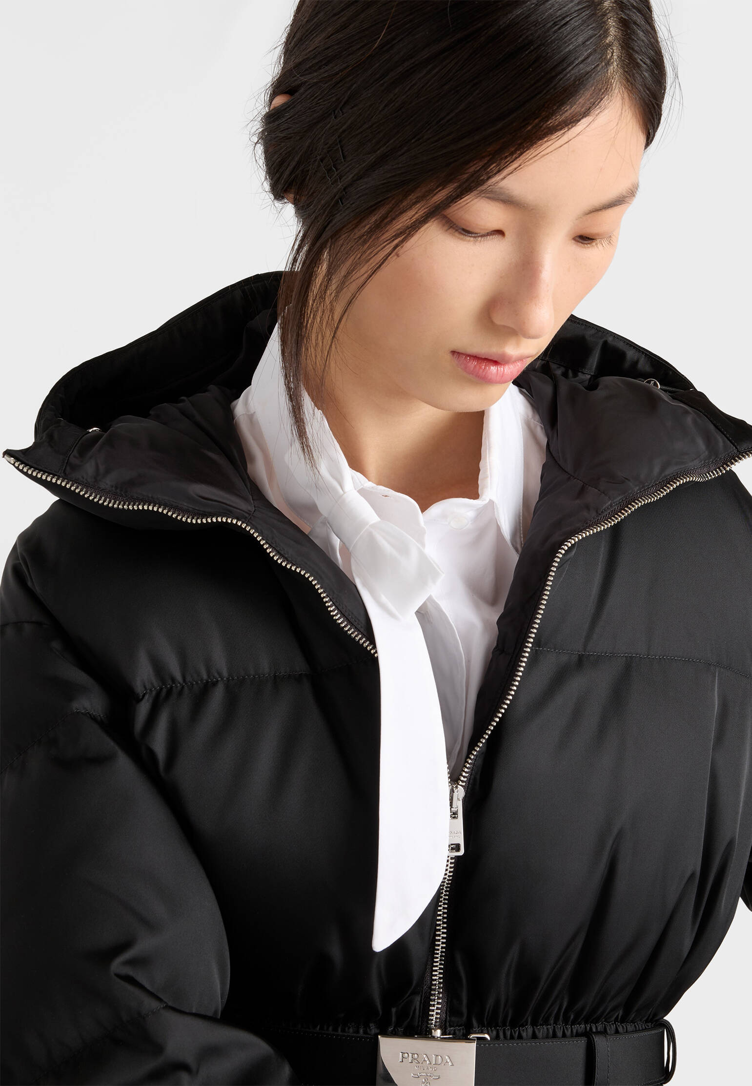 Эта куртка-пуховик из ре-нейлона имеет облегающий крой и утеплен гусиным пухом. Эластичная талия формирует силуэт мягкими объемами, характеризующимися широким воротником-стойкой и капюшоном.