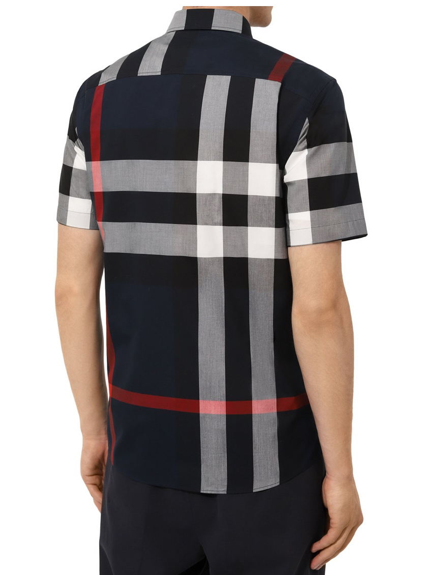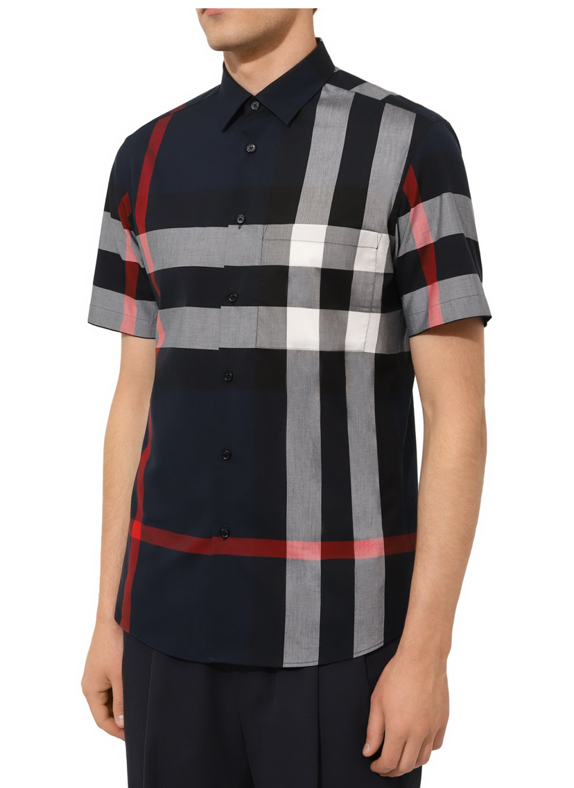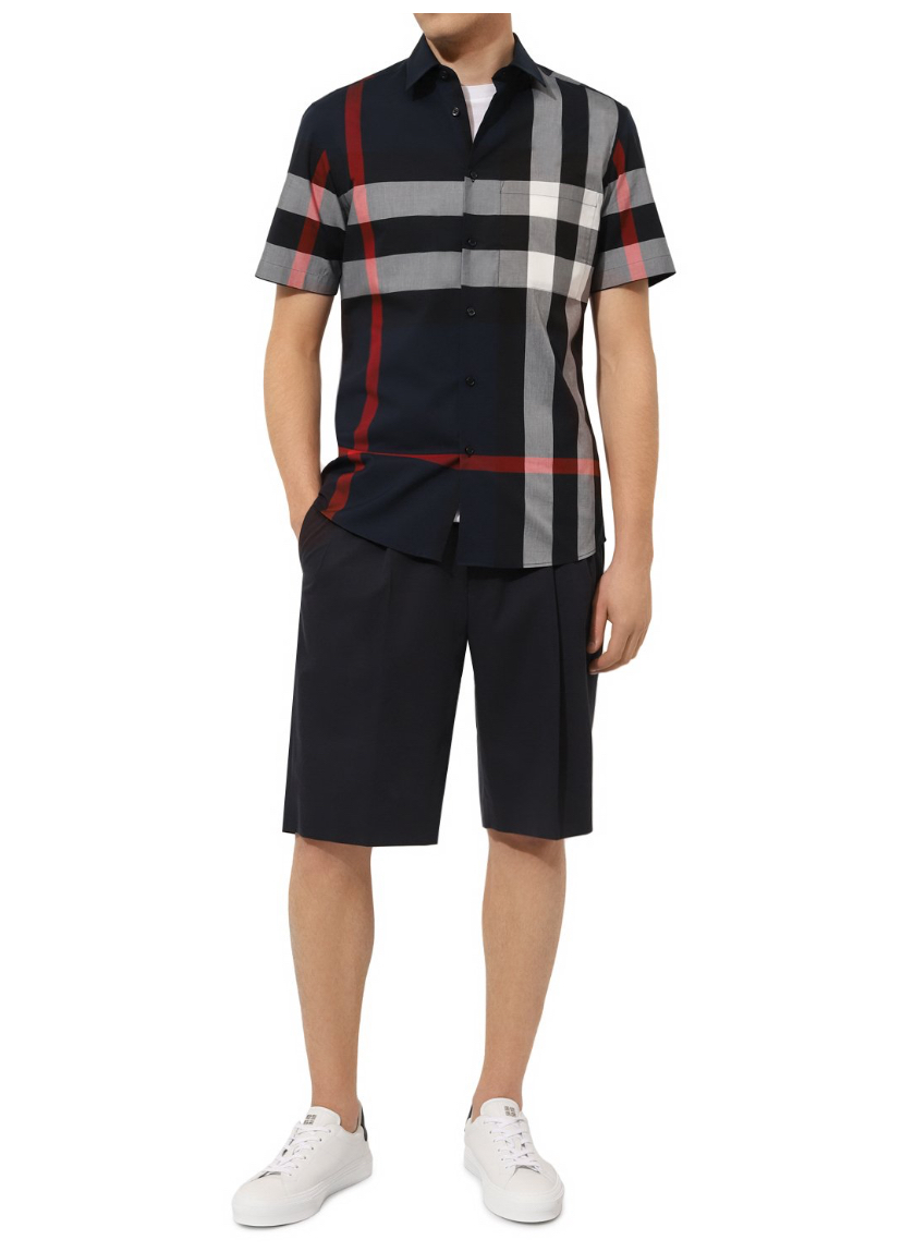 Темно-синюю рубашку силуэта Slim fit сшили из тонкого хлопкового поплина в крупную фирменную клетку Burberry. Легкий материал хорошо пропускает воздух, поэтому модель поддерживает оптимальный микроклимат даже в жаркую погоду. Изделие с одним накладным карманом предлагаем сочетать с шортами в тон и белыми кедами.